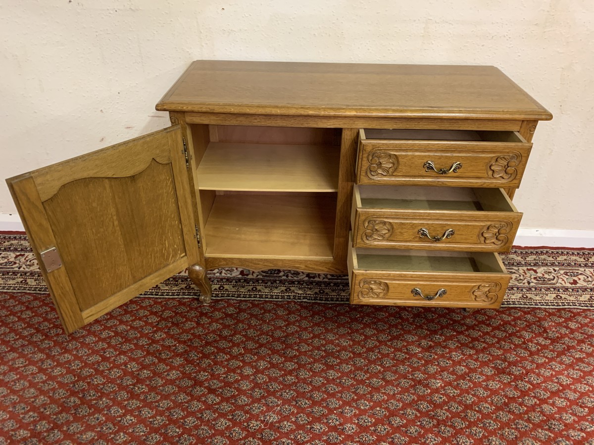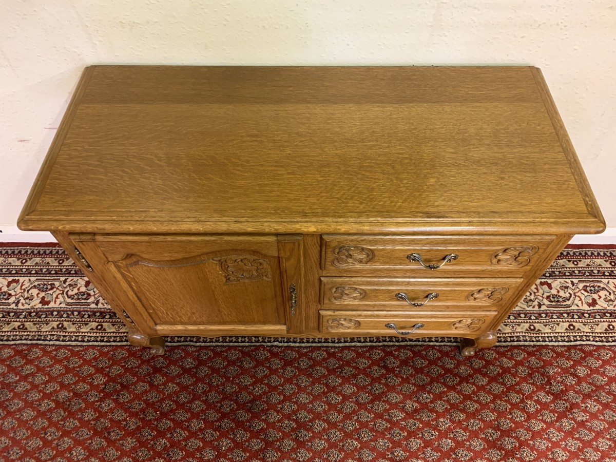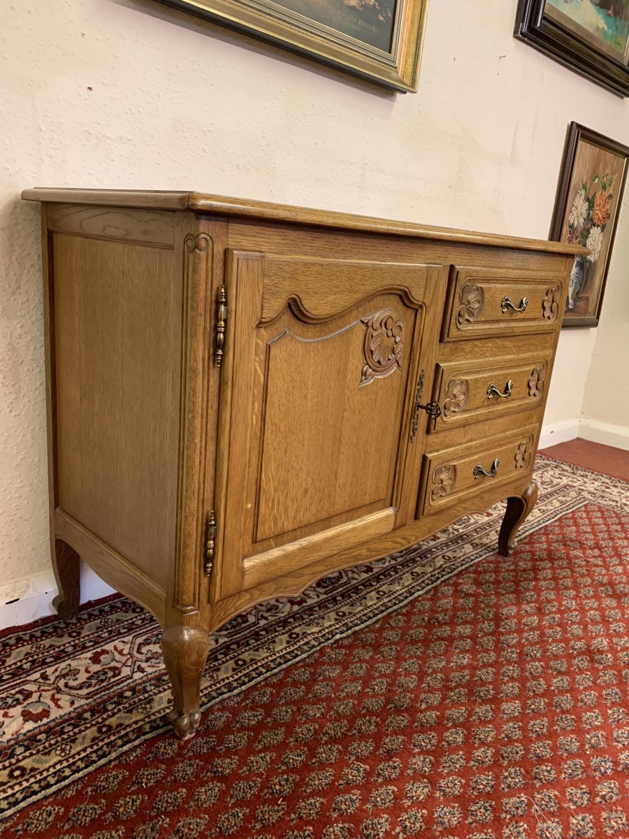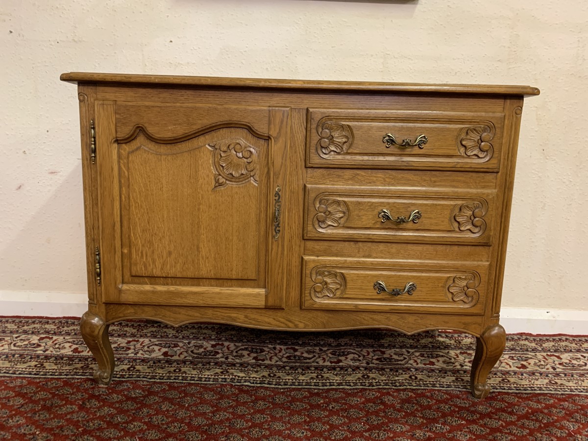 The oversailing top having rounded corners to the front. Lockable carved recessed panelled door opens to reveal a removable shelf. Three carved drawers, each drawer having an ornate brass handle. Recessed panelled sides and standing on carved cabriole legs.