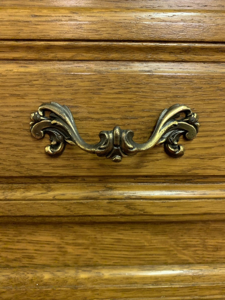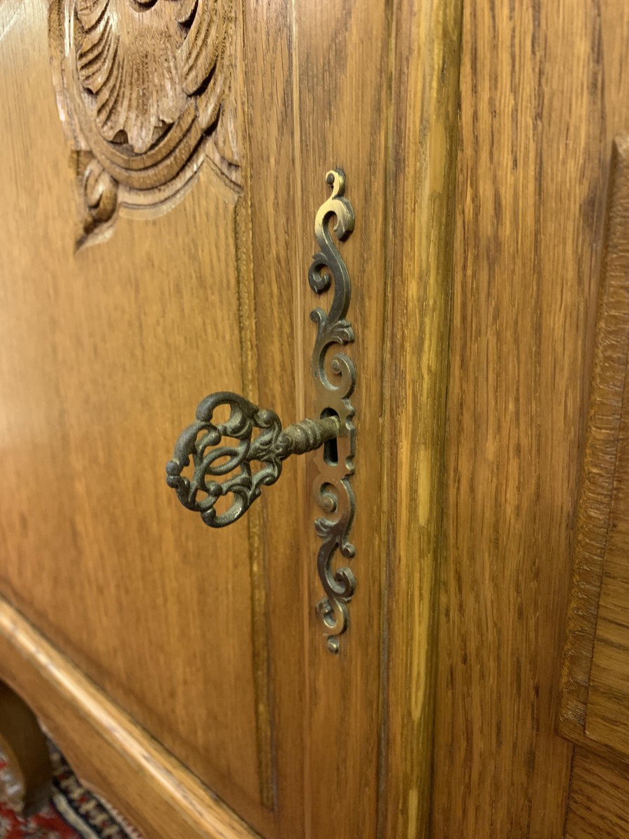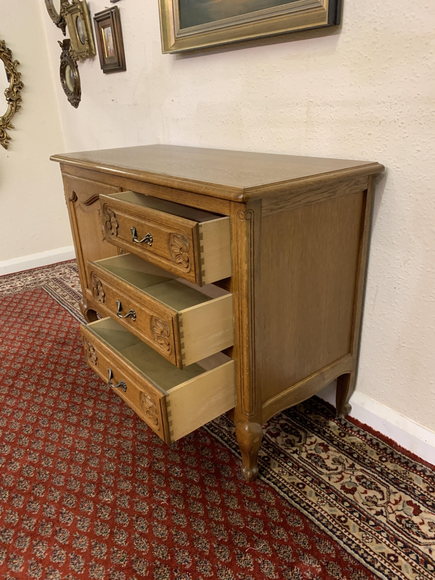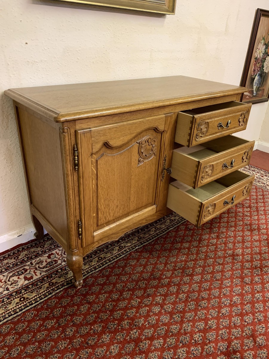 The oversailing top having rounded corners to the front. Lockable carved recessed panelled door opens to reveal a removable shelf. Three carved drawers, each drawer having an ornate brass handle. Recessed panelled sides and standing on carved cabriole legs.