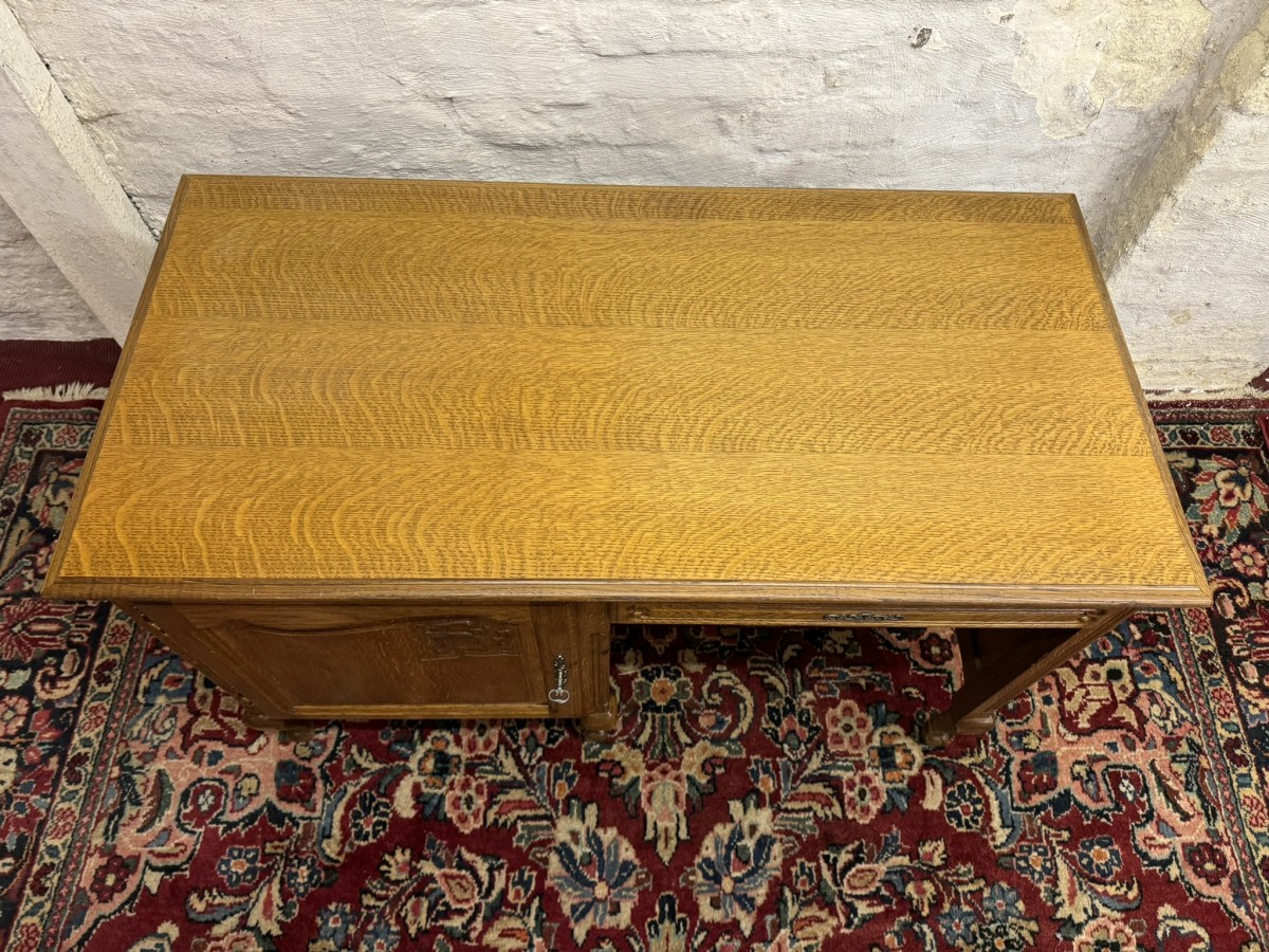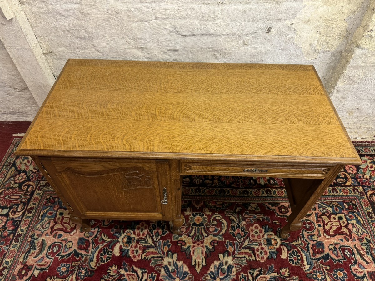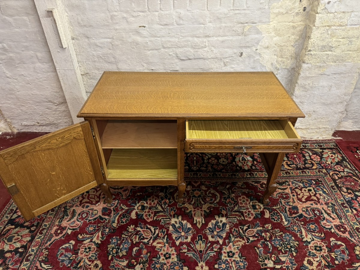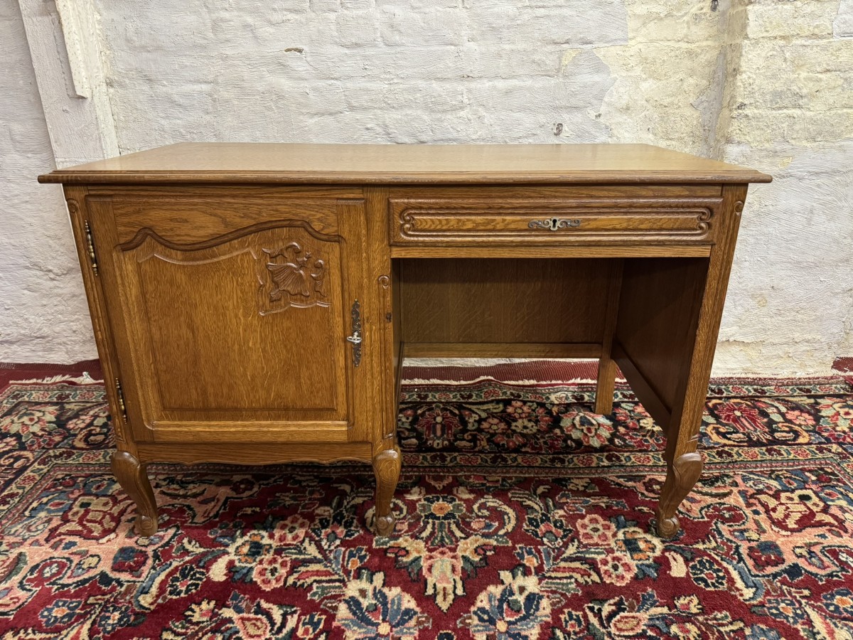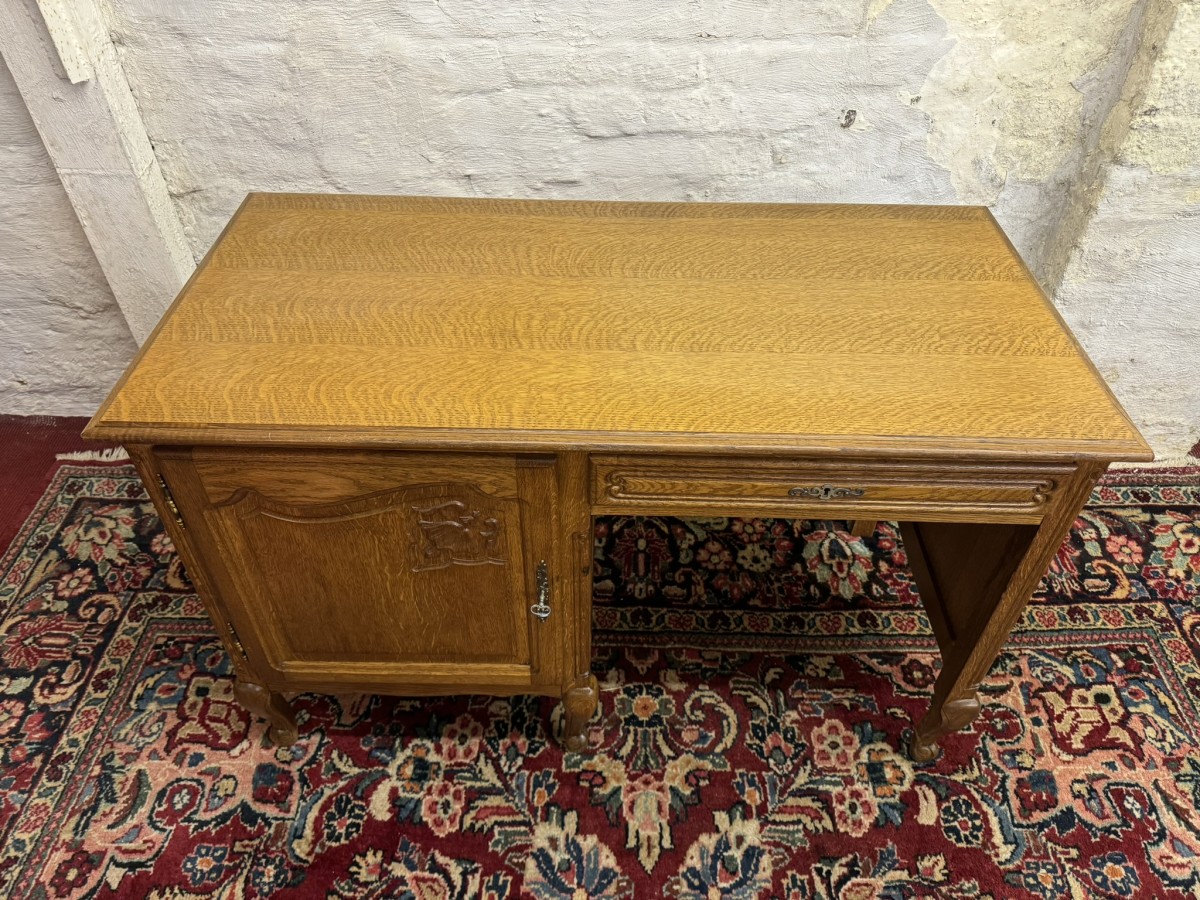 The oversailing top sits above a carved recessed panelled lockable door, the door opens to reveal a removable shelf. Knee hole section with a lockable drawer to the top, recessed panelled sides and standing on three cabriole shaped legs to the front.