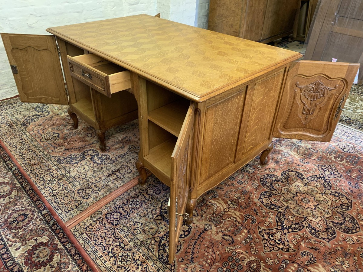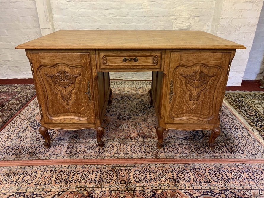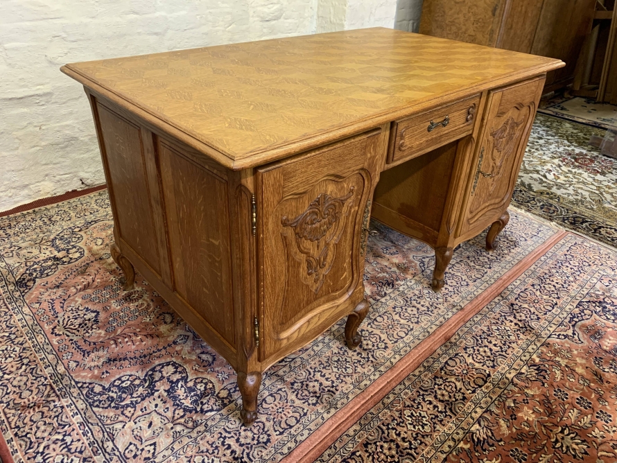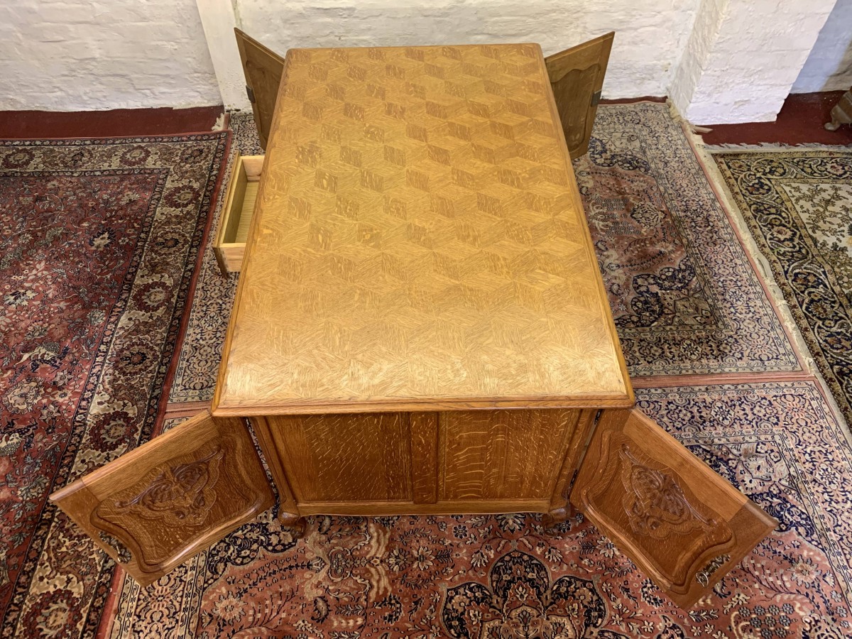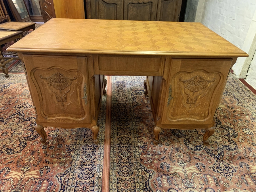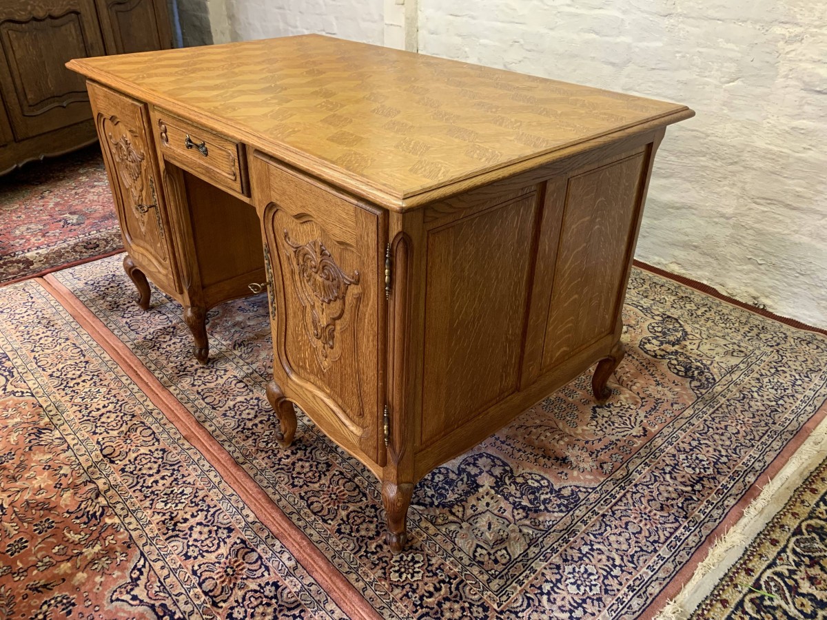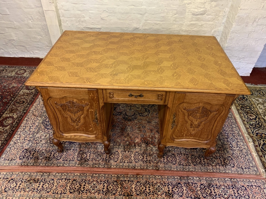 The parquetry oversailing top is striking in design. One side of the desk has a central knee hole carved drawer, with ornate brass handle. This drawer is flanked by a fabulous pair of lockable carved shaped recessed panelled doors, each door having brass hinges decorative escutcheon. Each door opens to reveal a removable shelf. The other side of the desk has a pair of carved recessed panelled shaped lockable doors, each door having brass hinges ornate brass escutcheon and key. The left-hand door opens to reveal three graduated filing drawers. The right-hand door opens to reveal a removable shelf. Recessed panelled sides, shaped skirt this superb French partners desk stands on eight carved cabriole shaped legs.