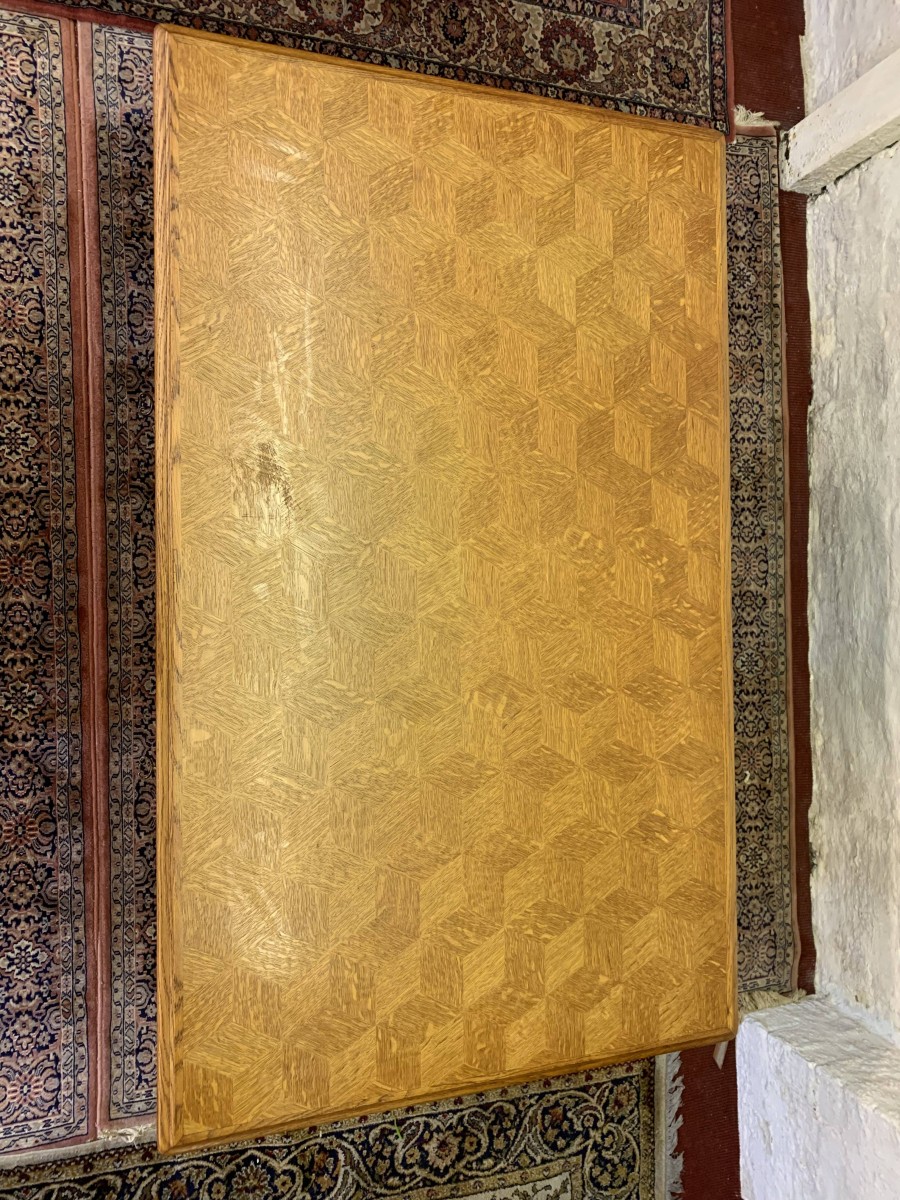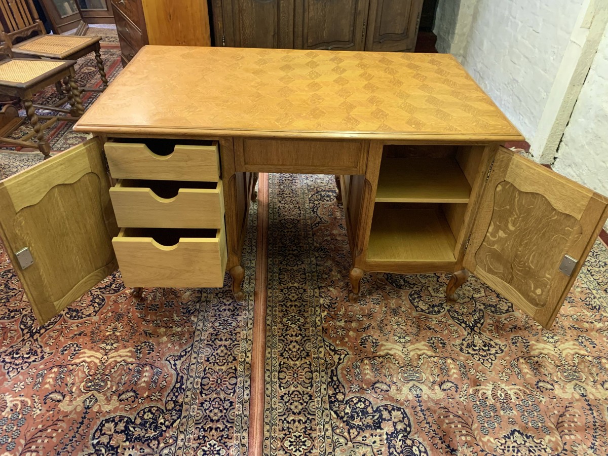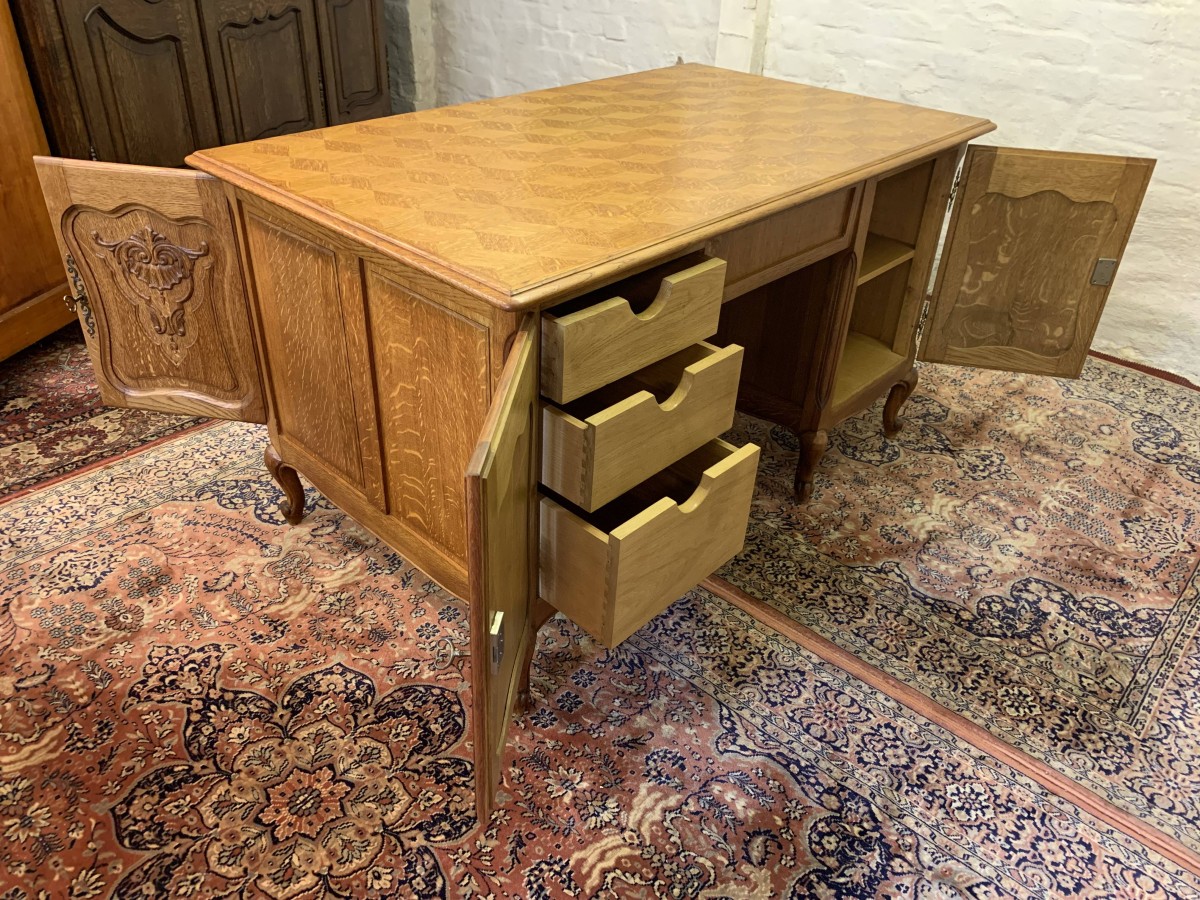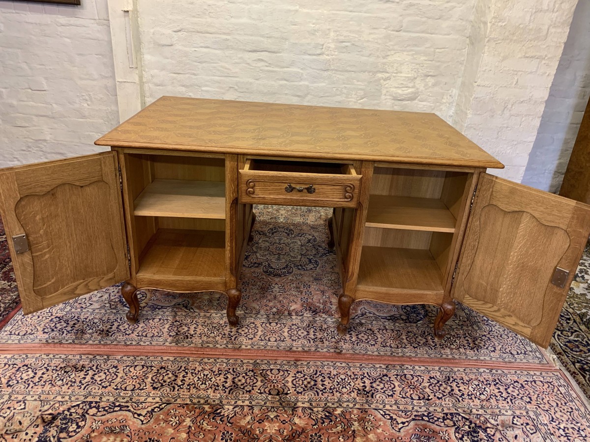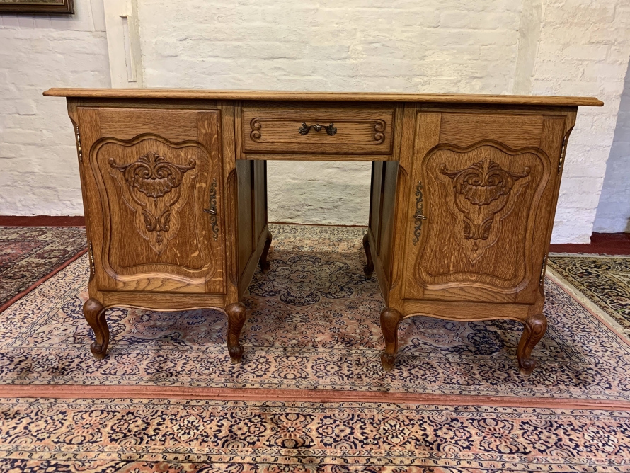 The parquetry oversailing top is striking in design. One side of the desk has a central knee hole carved drawer, with ornate brass handle. This drawer is flanked by a fabulous pair of lockable carved shaped recessed panelled doors, each door having brass hinges decorative escutcheon. Each door opens to reveal a removable shelf. The other side of the desk has a pair of carved recessed panelled shaped lockable doors, each door having brass hinges ornate brass escutcheon and key. The left-hand door opens to reveal three graduated filing drawers. The right-hand door opens to reveal a removable shelf. Recessed panelled sides, shaped skirt this superb French partners desk stands on eight carved cabriole shaped legs.