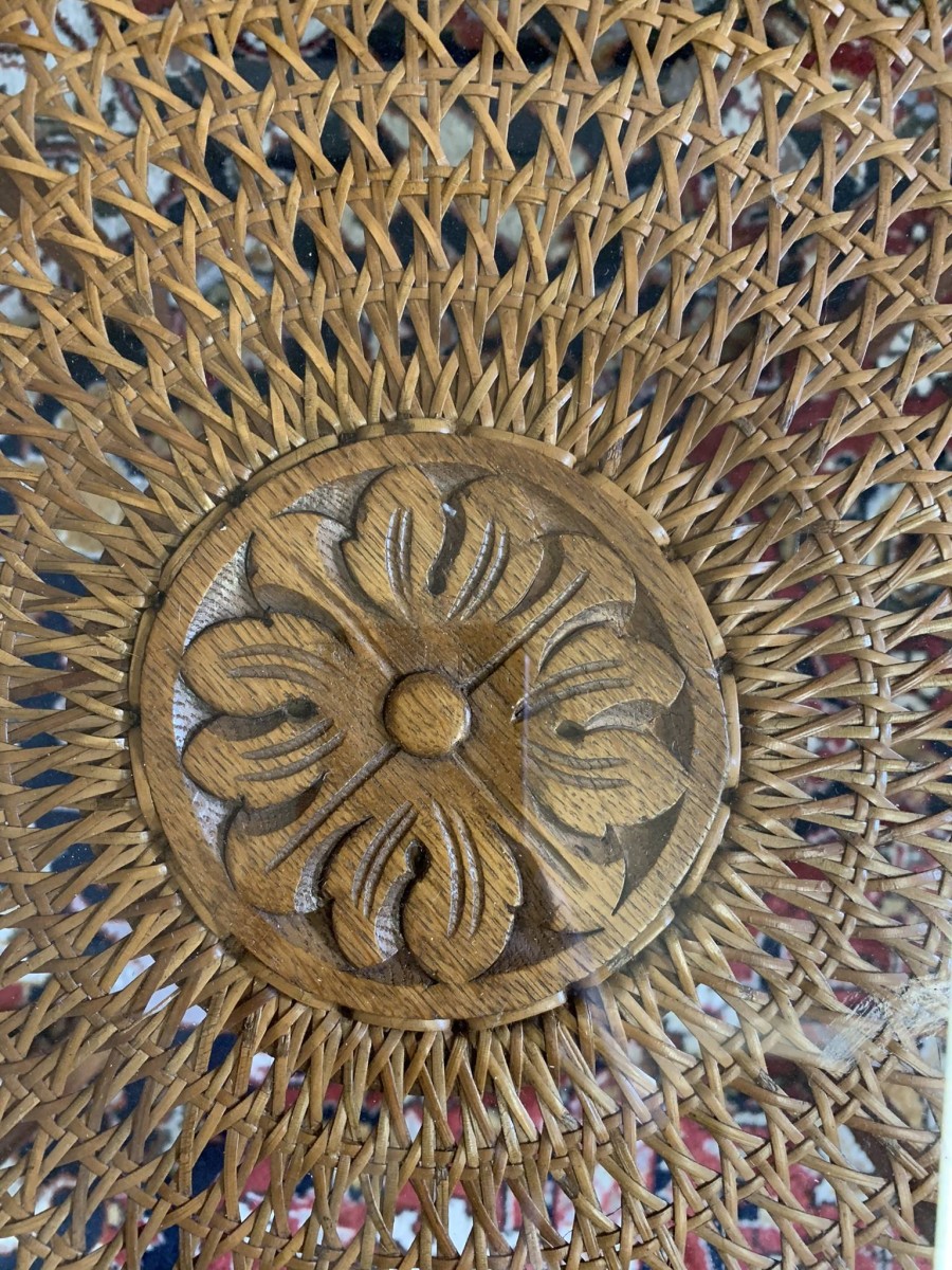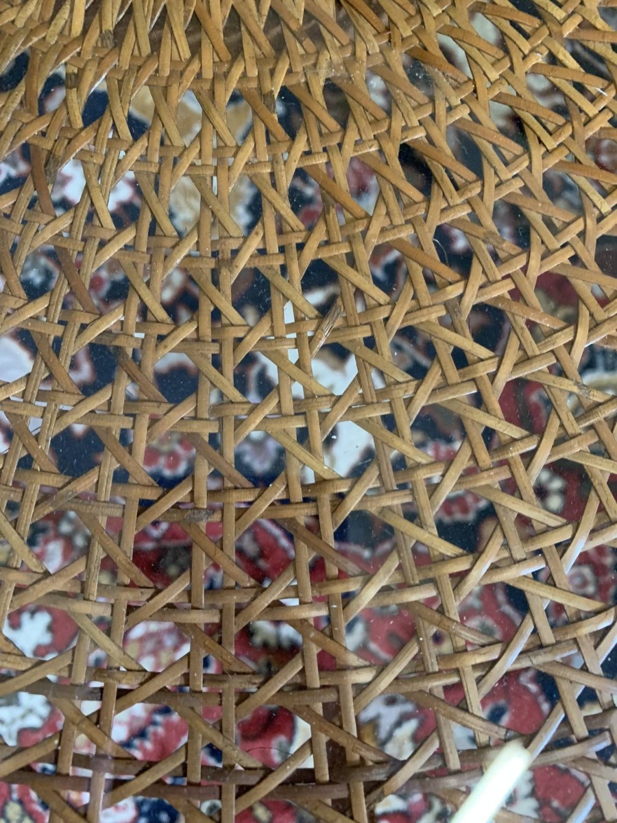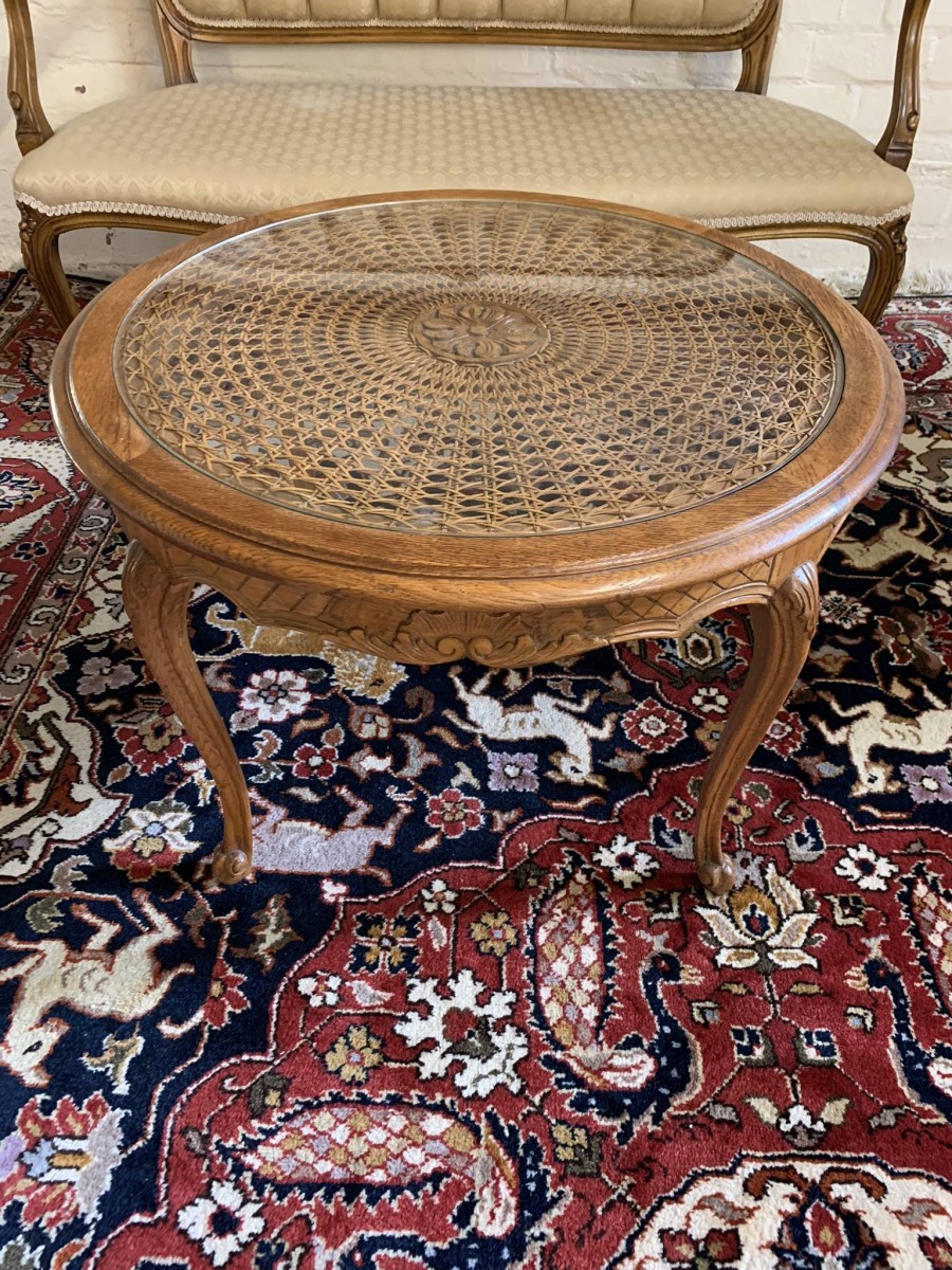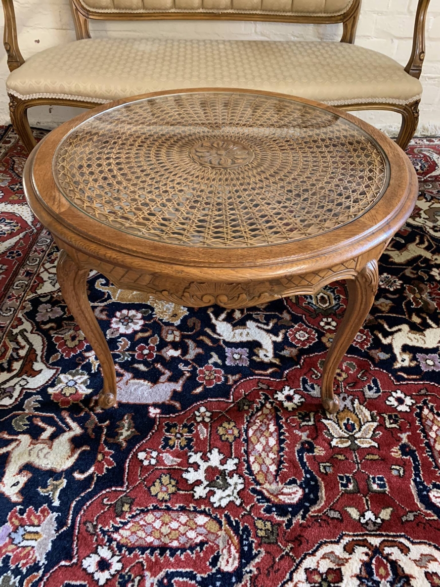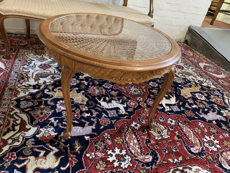 This lovely French coffee table is in excellent condition. The glass top sits above caning with carved central decoration. The table sits on fur carved cabriole legs and has carved decoration all the way round the table skirt.