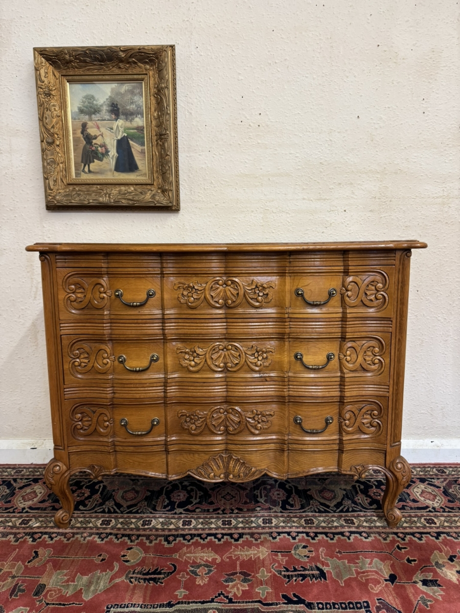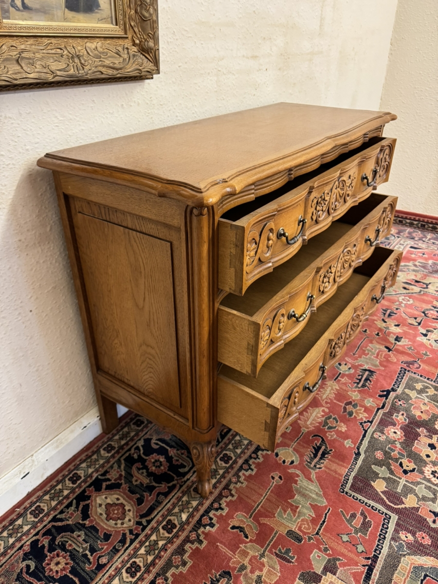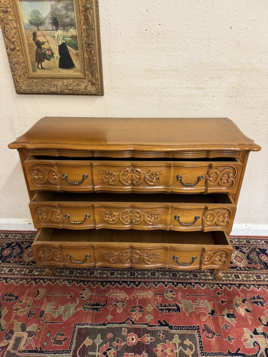 This fine French chest is in excellent condition. The shaped over sailing top sits above three serpentine shaped carved drawers, each drawer has a pair of brass handles. Fielded panelled sides, shaped skirt with central carving and standing on two carved cabriole shaped legs to the front.