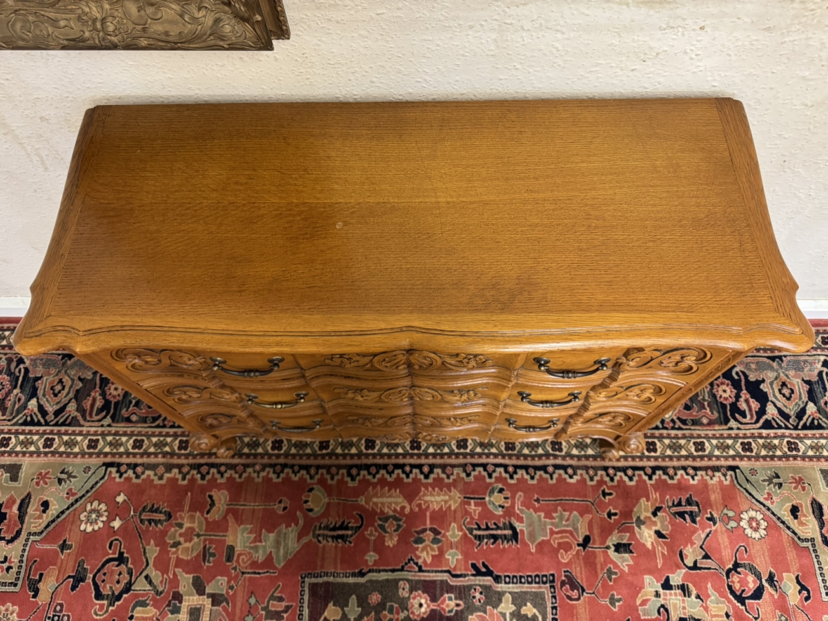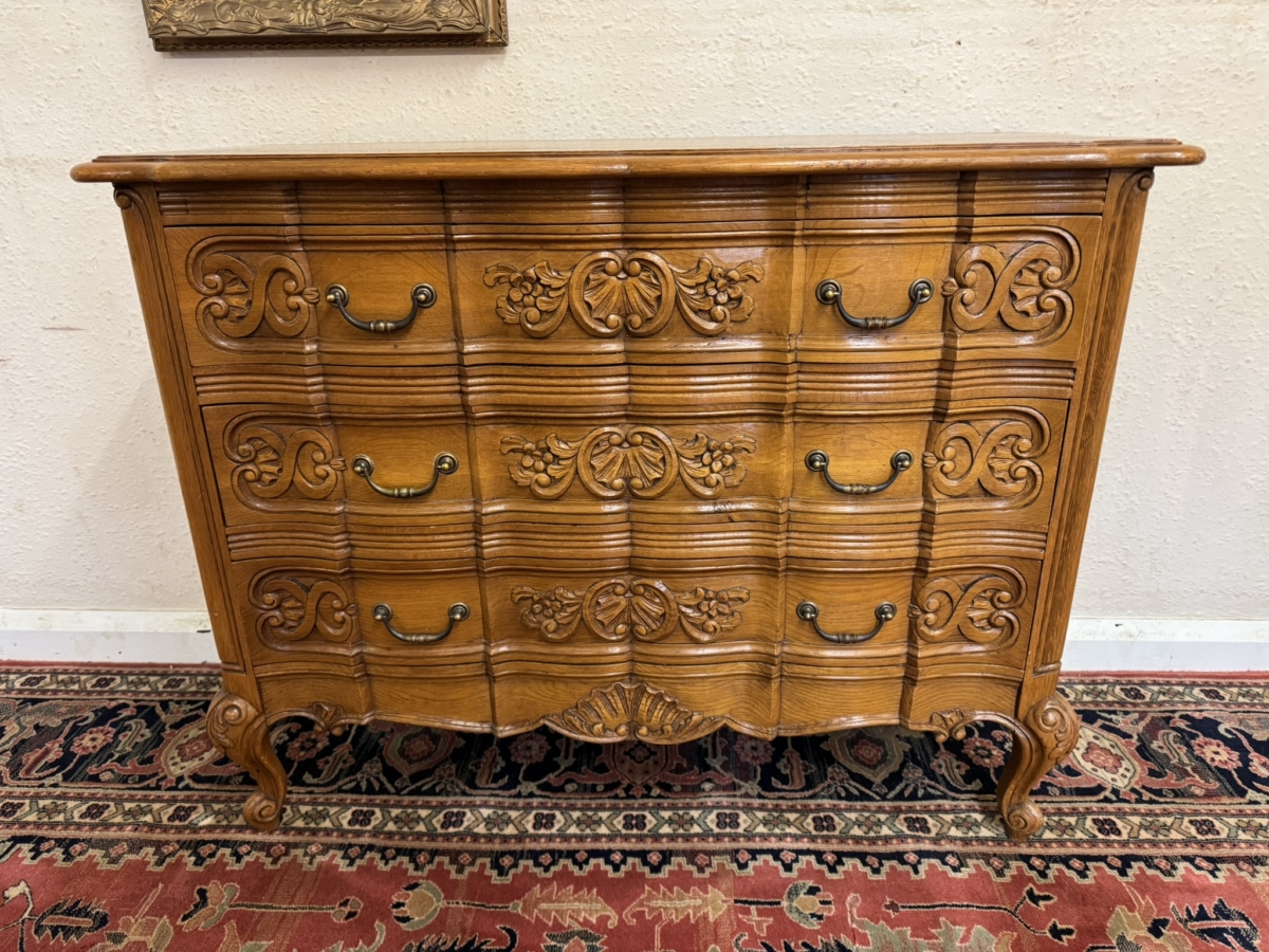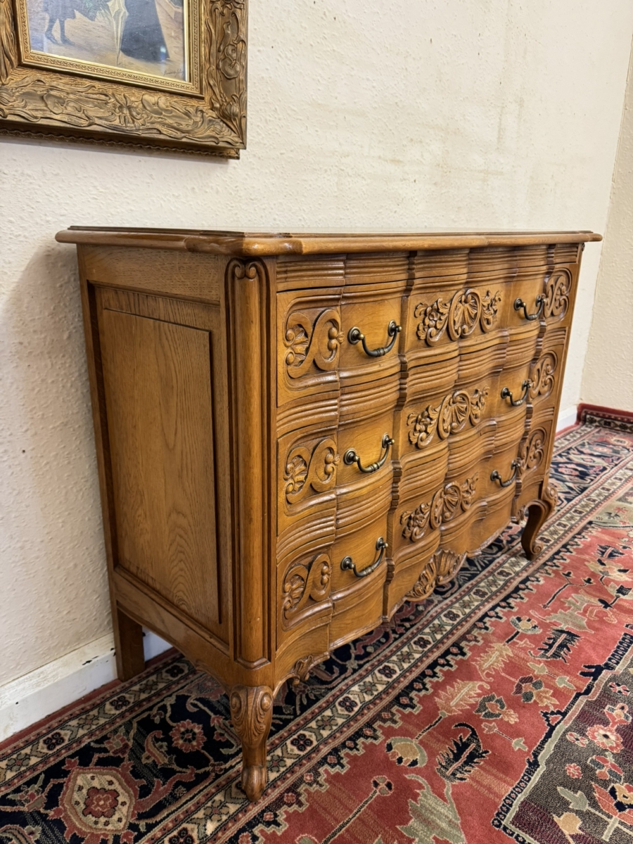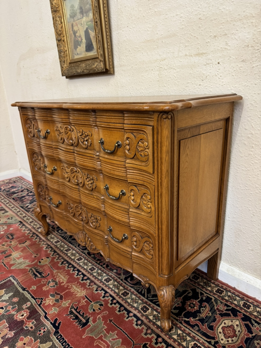 This fine French chest is in excellent condition. The shaped over sailing top sits above three serpentine shaped carved drawers, each drawer has a pair of brass handles. Fielded panelled sides, shaped skirt with central carving and standing on two carved cabriole shaped legs to the front.