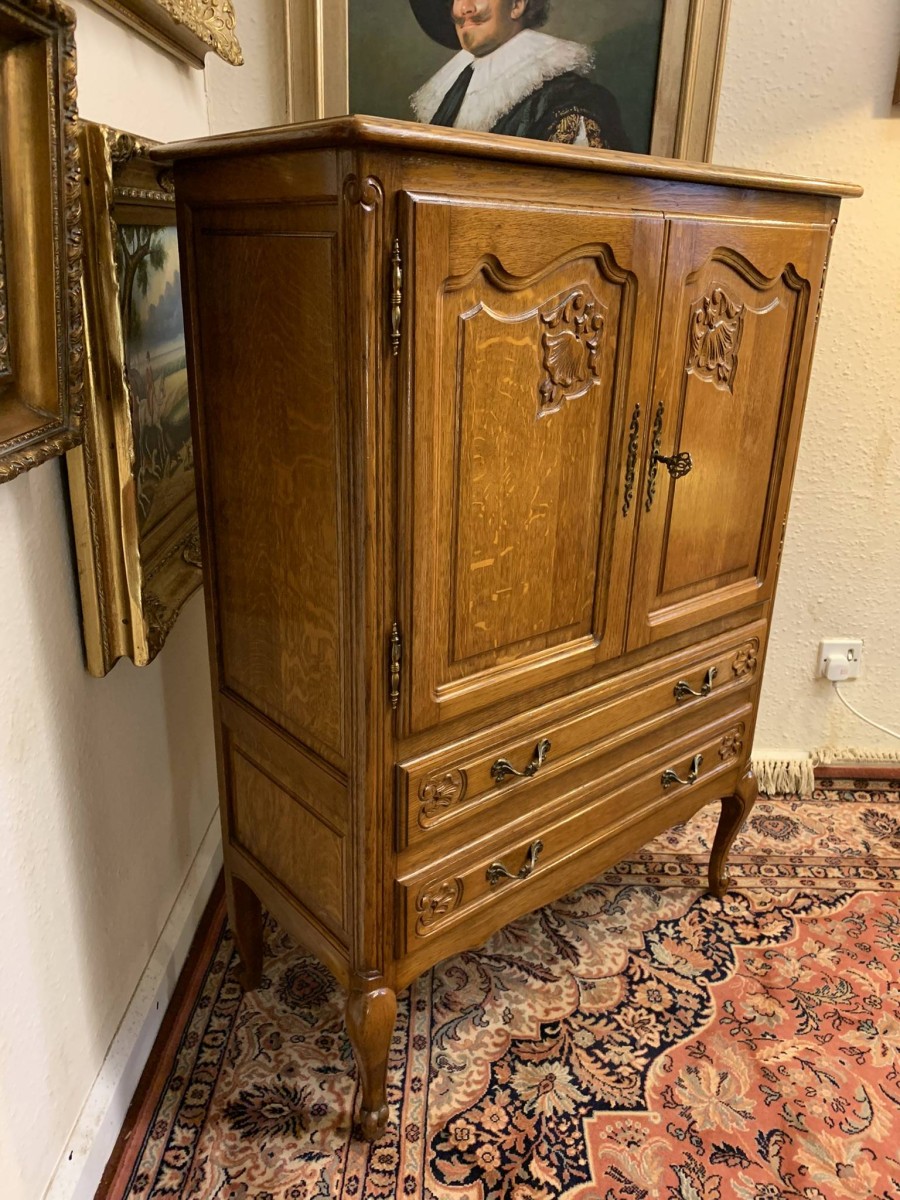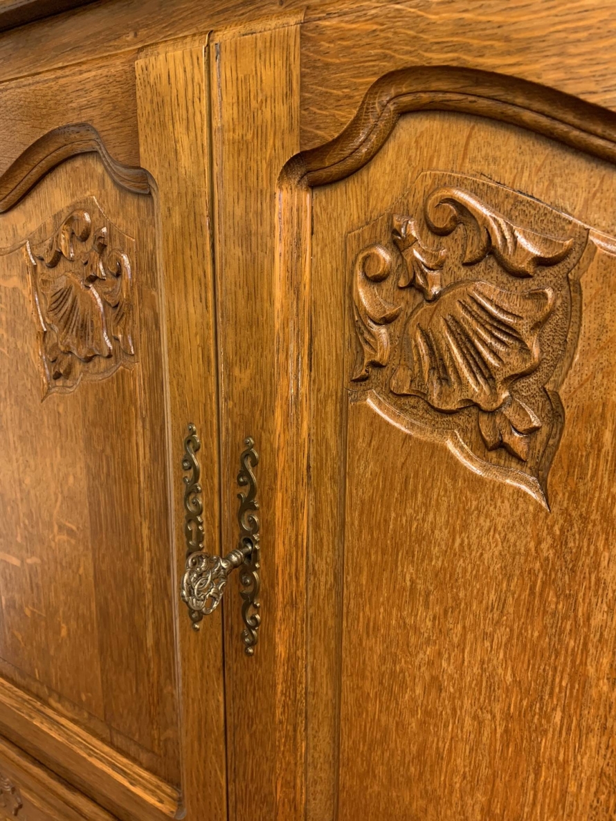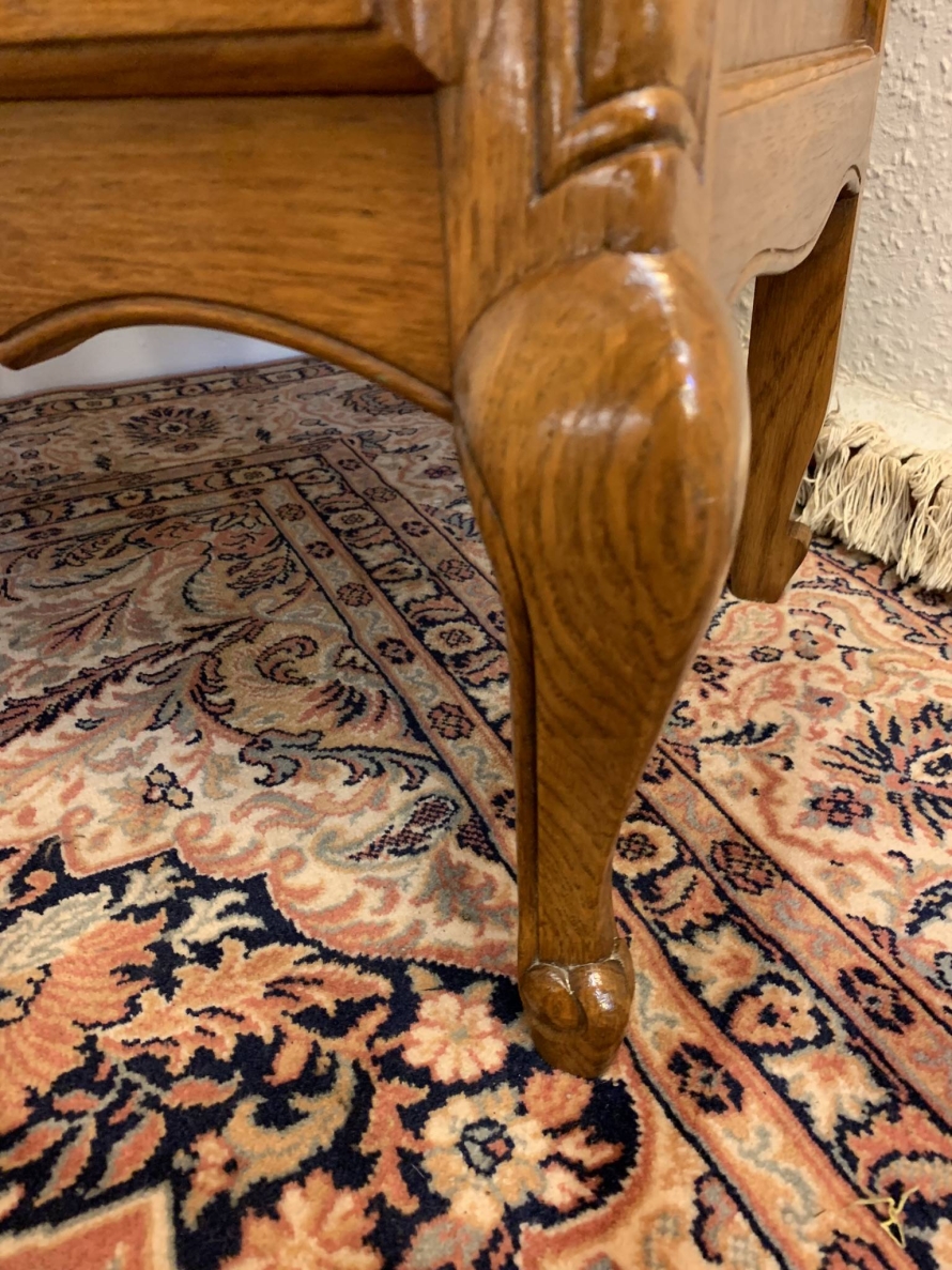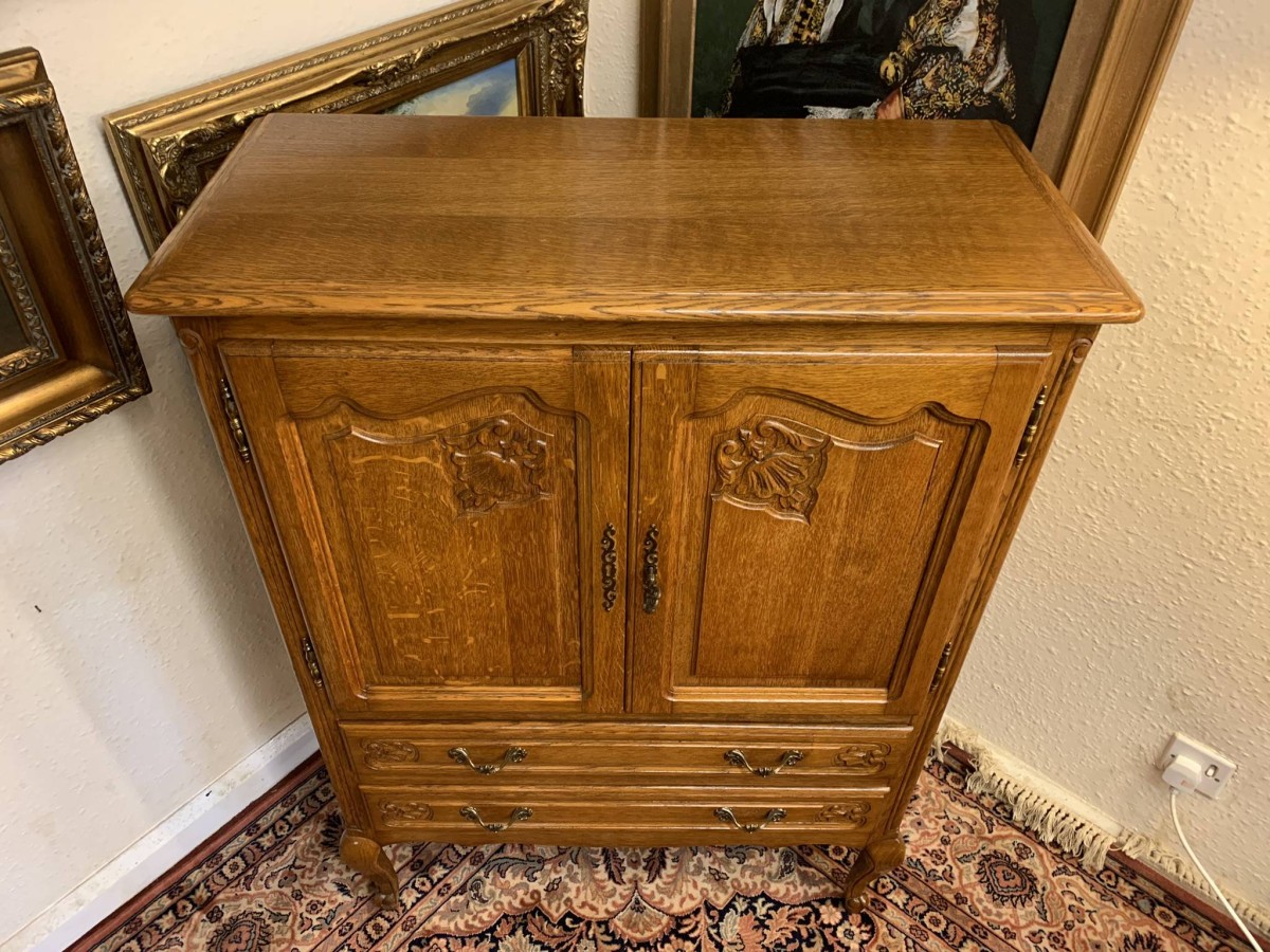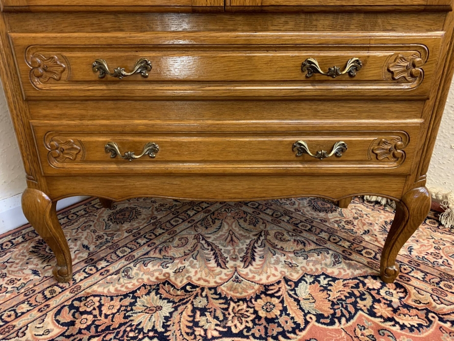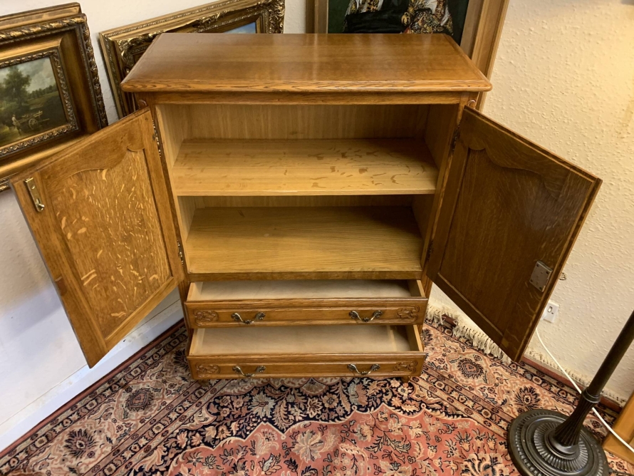The oversailing top has a cross banded edging. Below are a pair of lockable carved recessed panelled doors, each door having brass hinges and a decorative brass escutcheon. The doors open to reveal a removable shelf. Below are a pair of carved drawers, each drawer having a pair of ornate brass handles. Recessed panelled sides, shaped skirt this super item stands on two carved cabriole legs to the front.