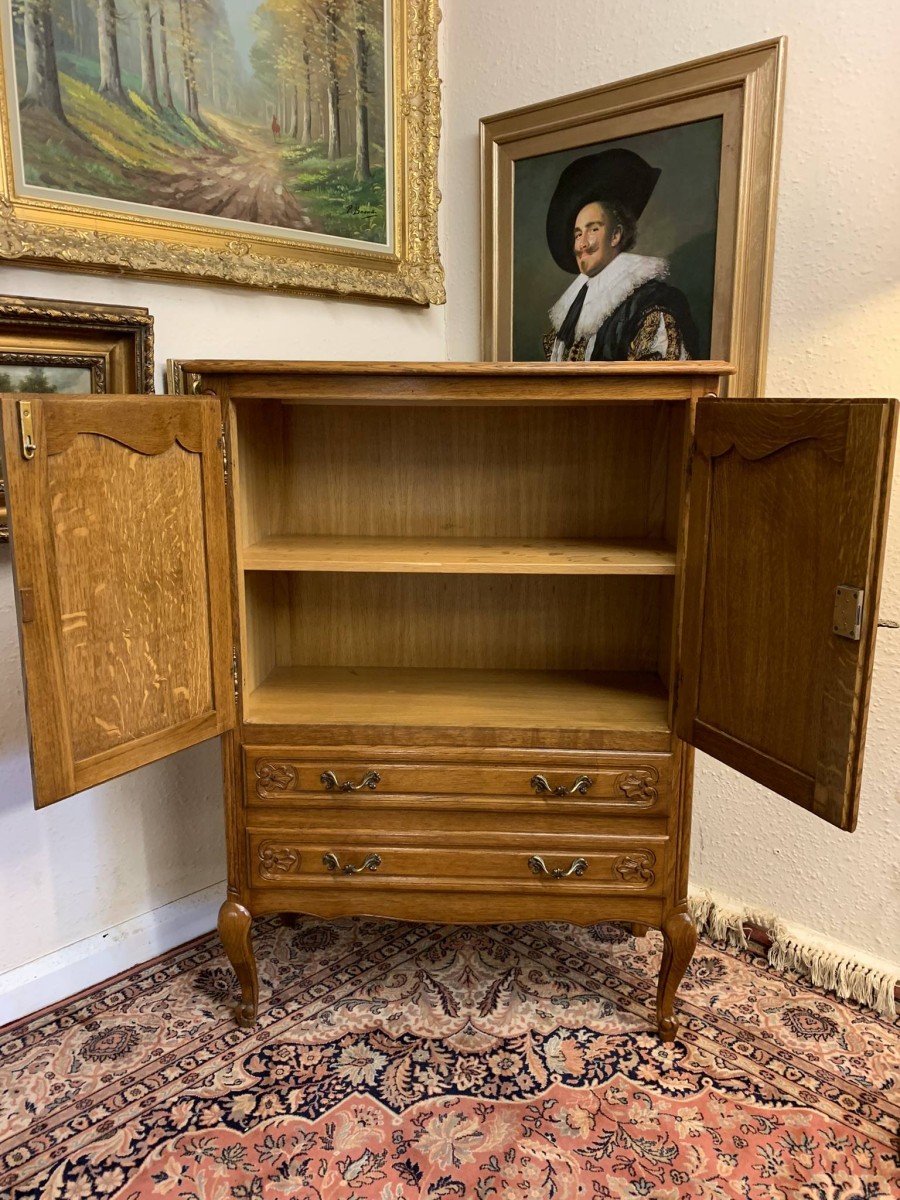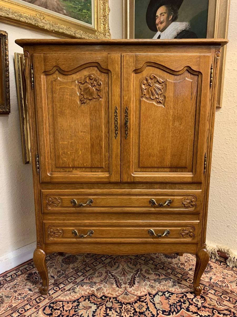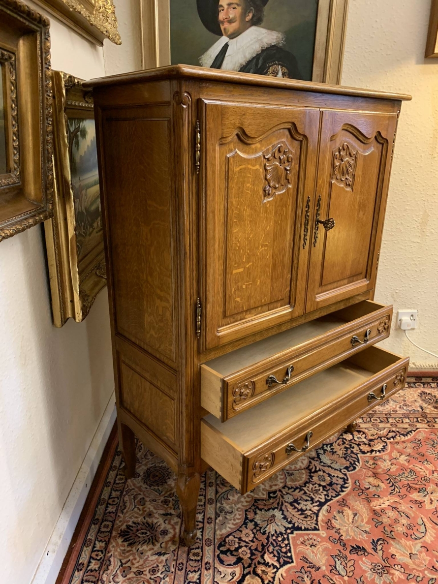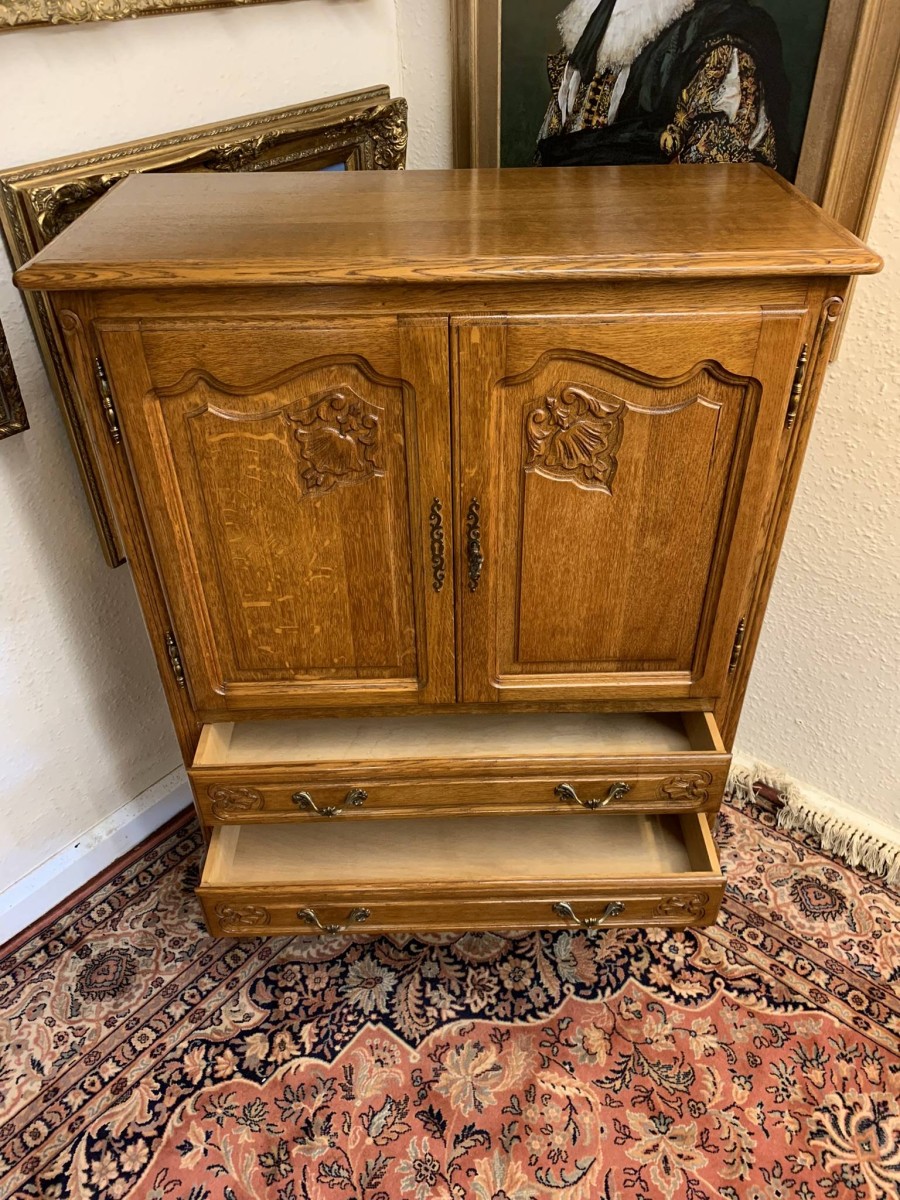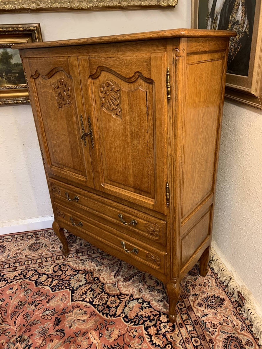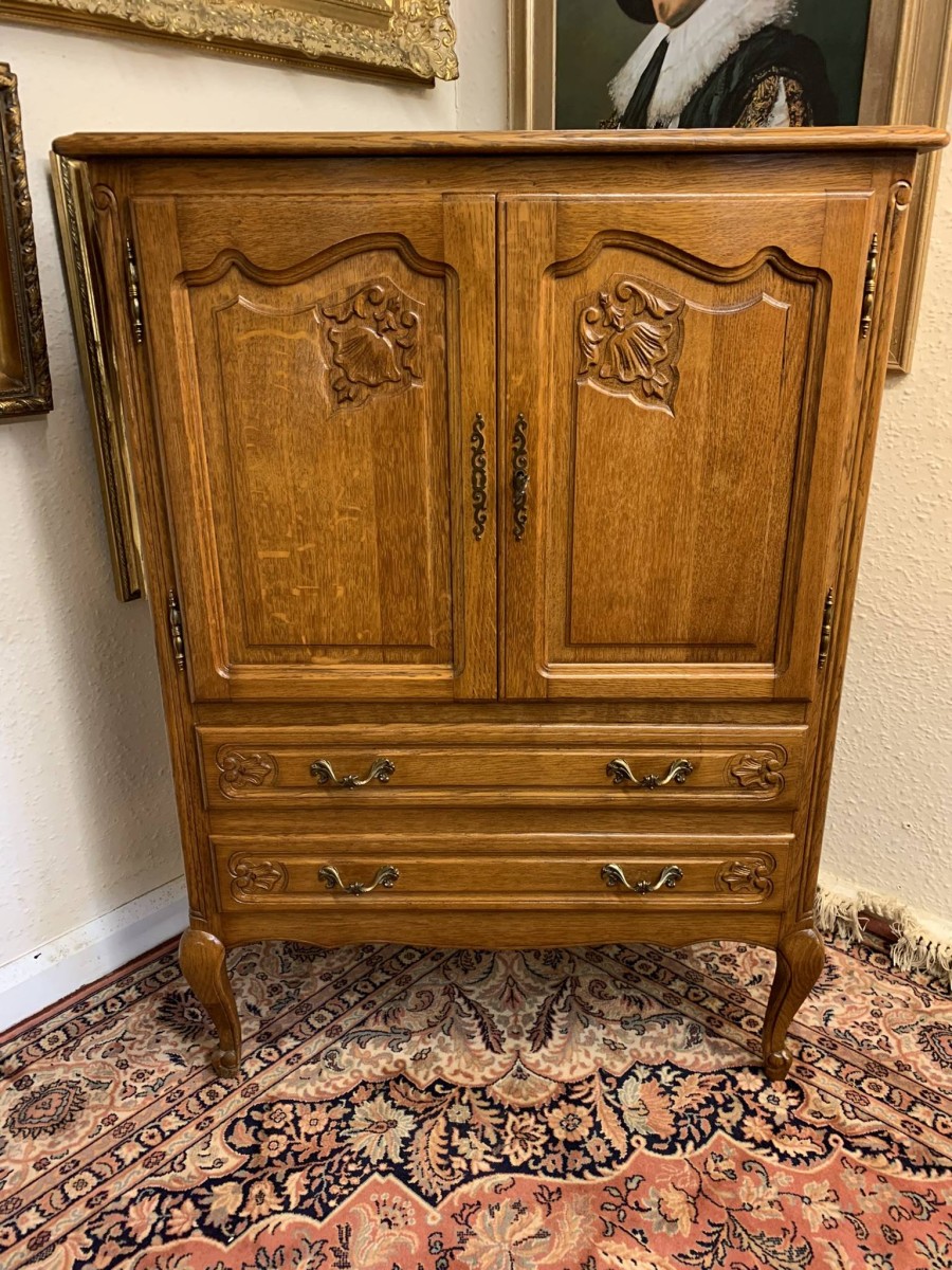 The oversailing top has a cross banded edging. Below are a pair of lockable carved recessed panelled doors, each door having brass hinges and a decorative brass escutcheon. The doors open to reveal a removable shelf. Below are a pair of carved drawers, each drawer having a pair of ornate brass handles. Recessed panelled sides, shaped skirt this super item stands on two carved cabriole legs to the front.