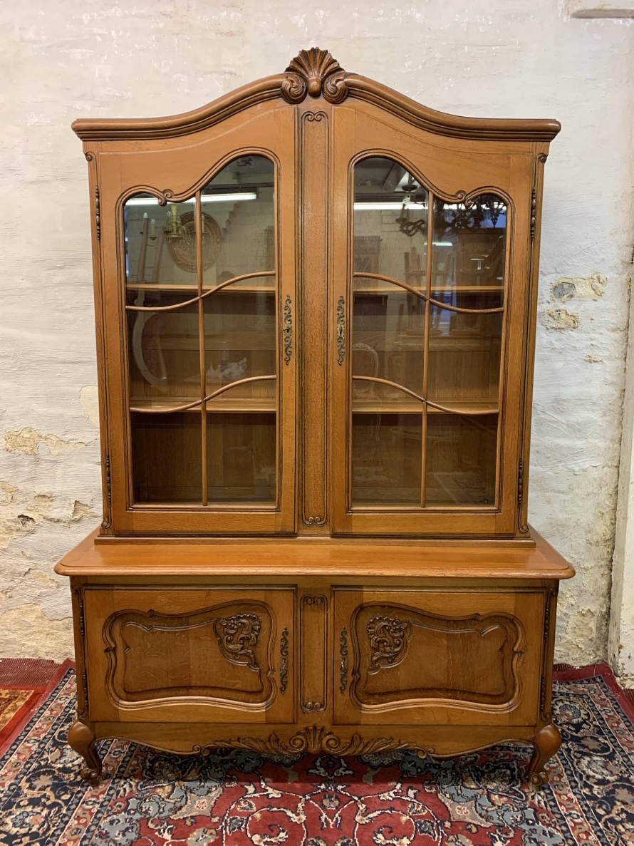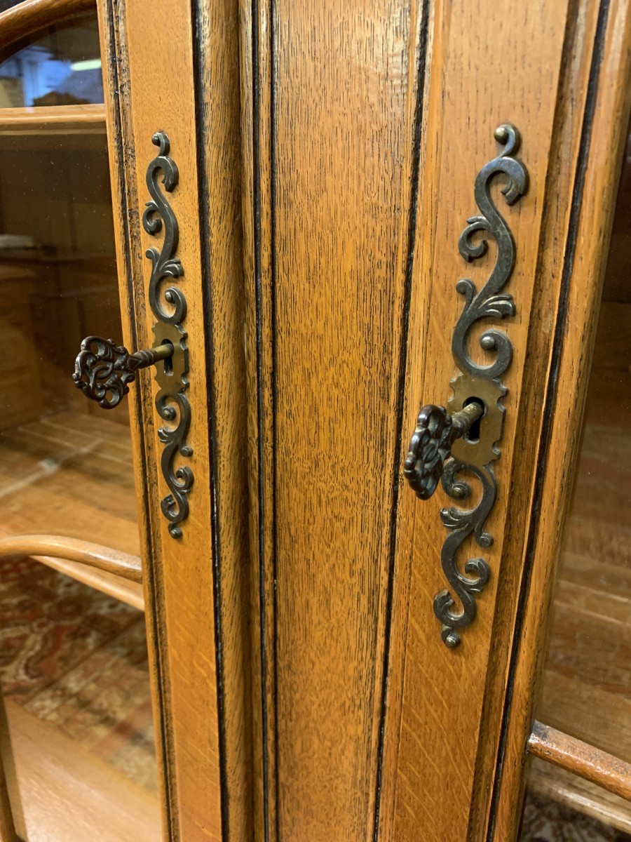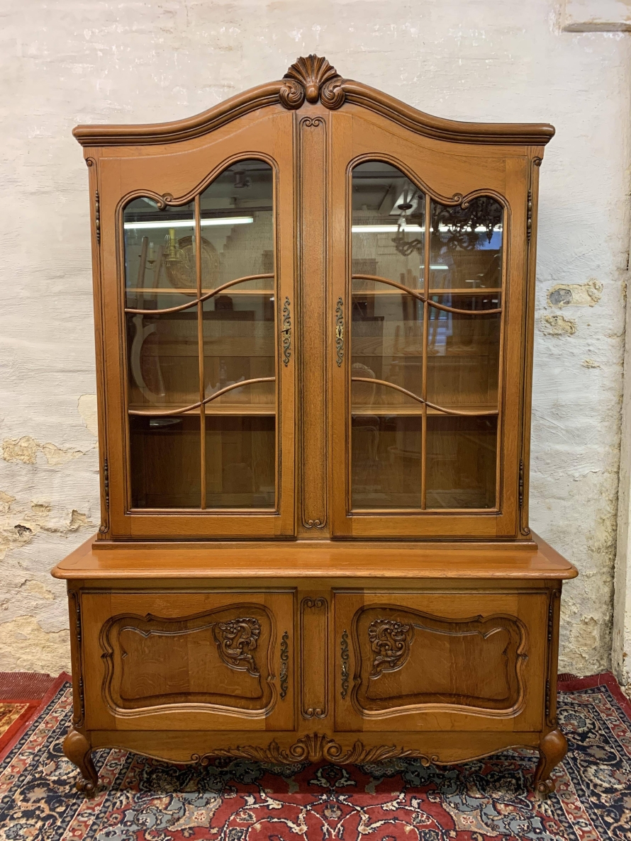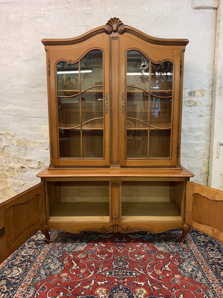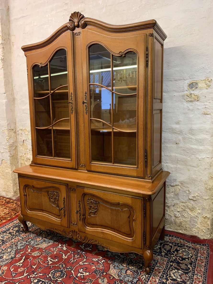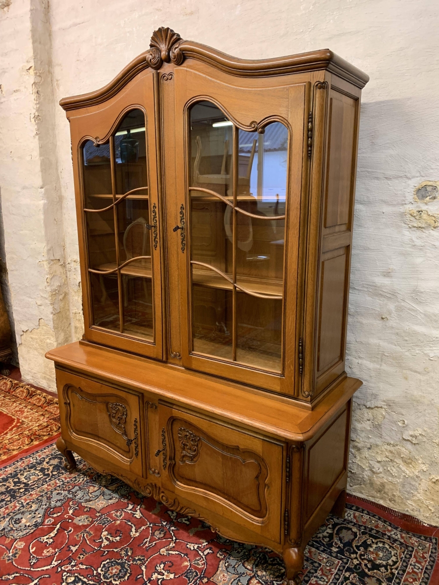 The top section has a oversailing top which rises to a central carving, below are a pair of lockable shaped glazed doors, each door having brass hinges, decorative brass escutcheon and key. The doors open to reveal two removable shelves. The base section having two carved lockable recessed panelled doors, each door having brass hinges, decorative brass escutcheon and key. Recessed panelled sides shaped skirt with decorative central carving this fabulous vitrine stands on two carved cabriole shaped legs to the front.