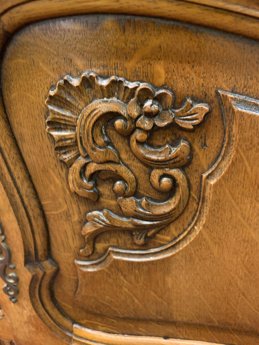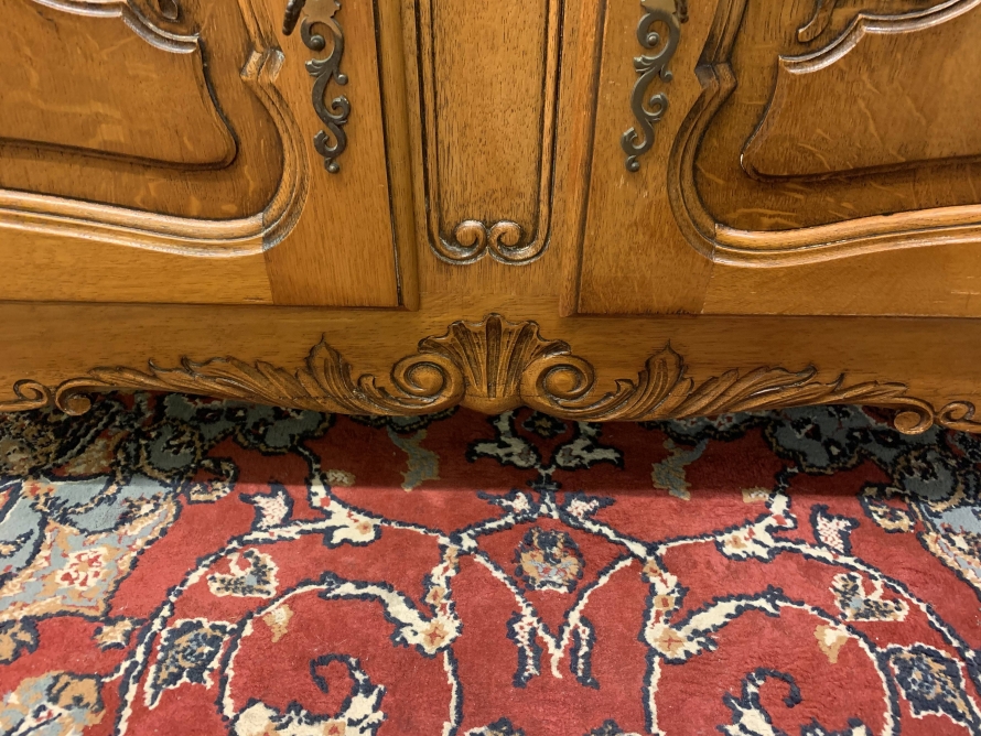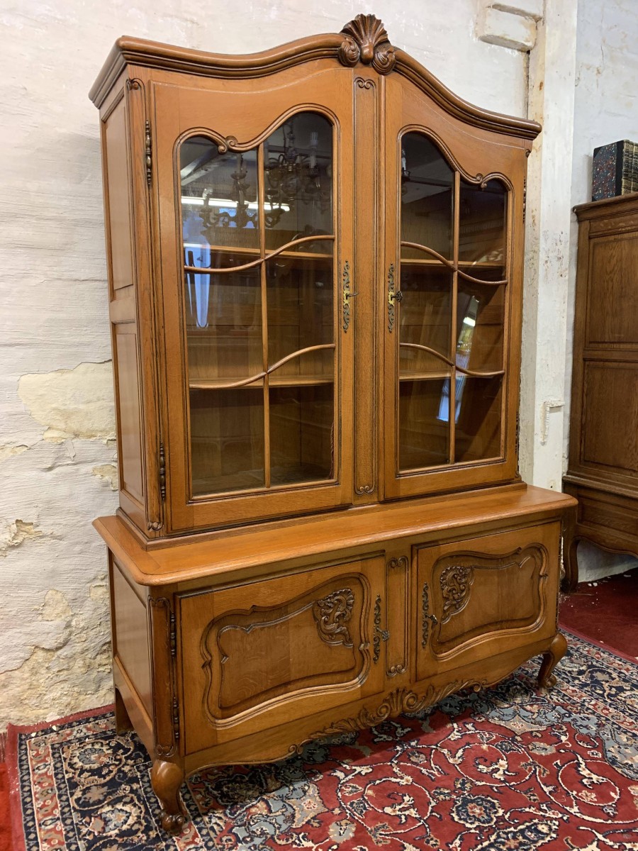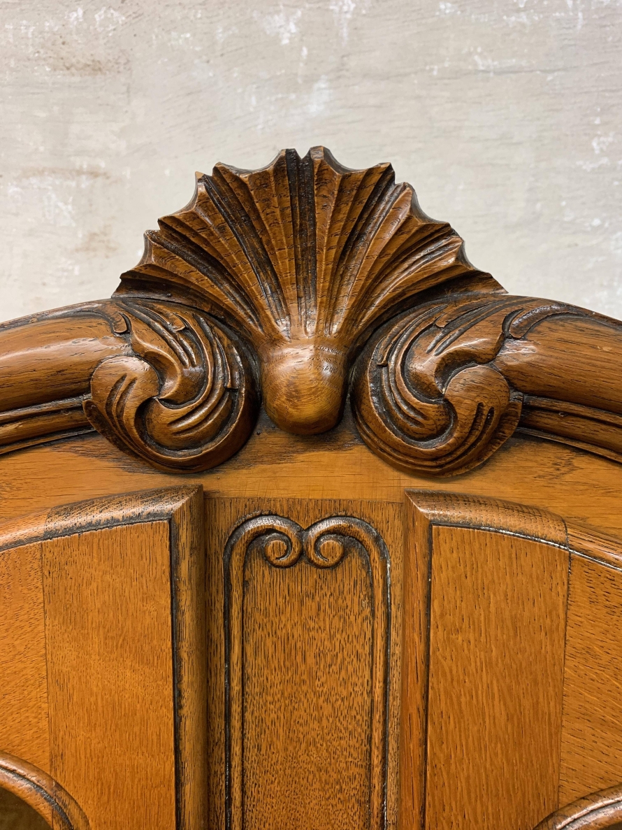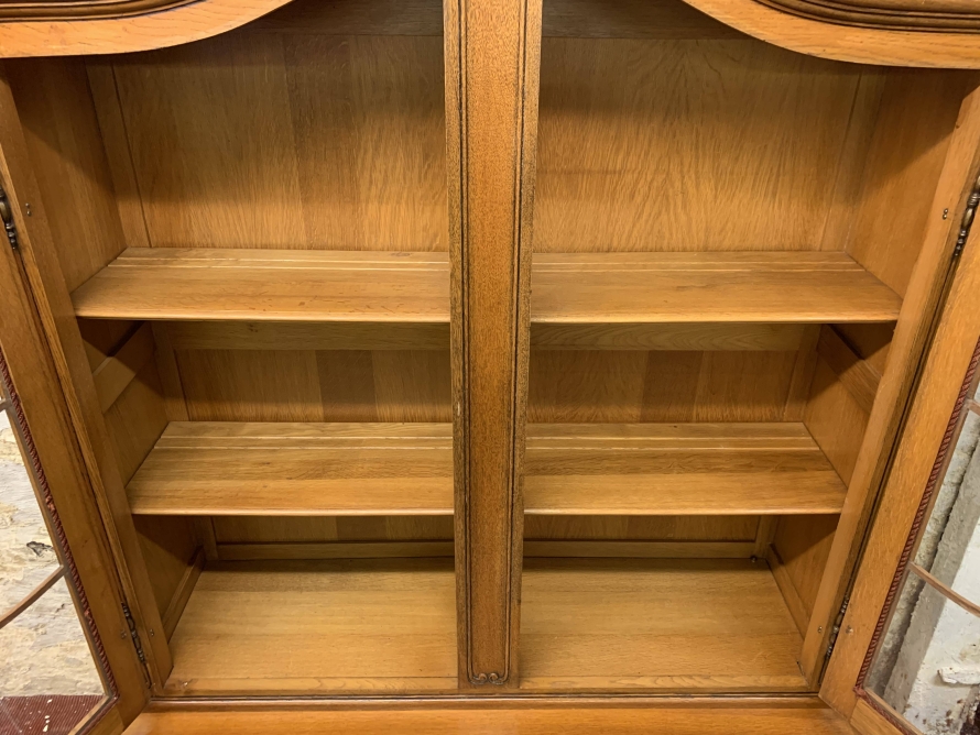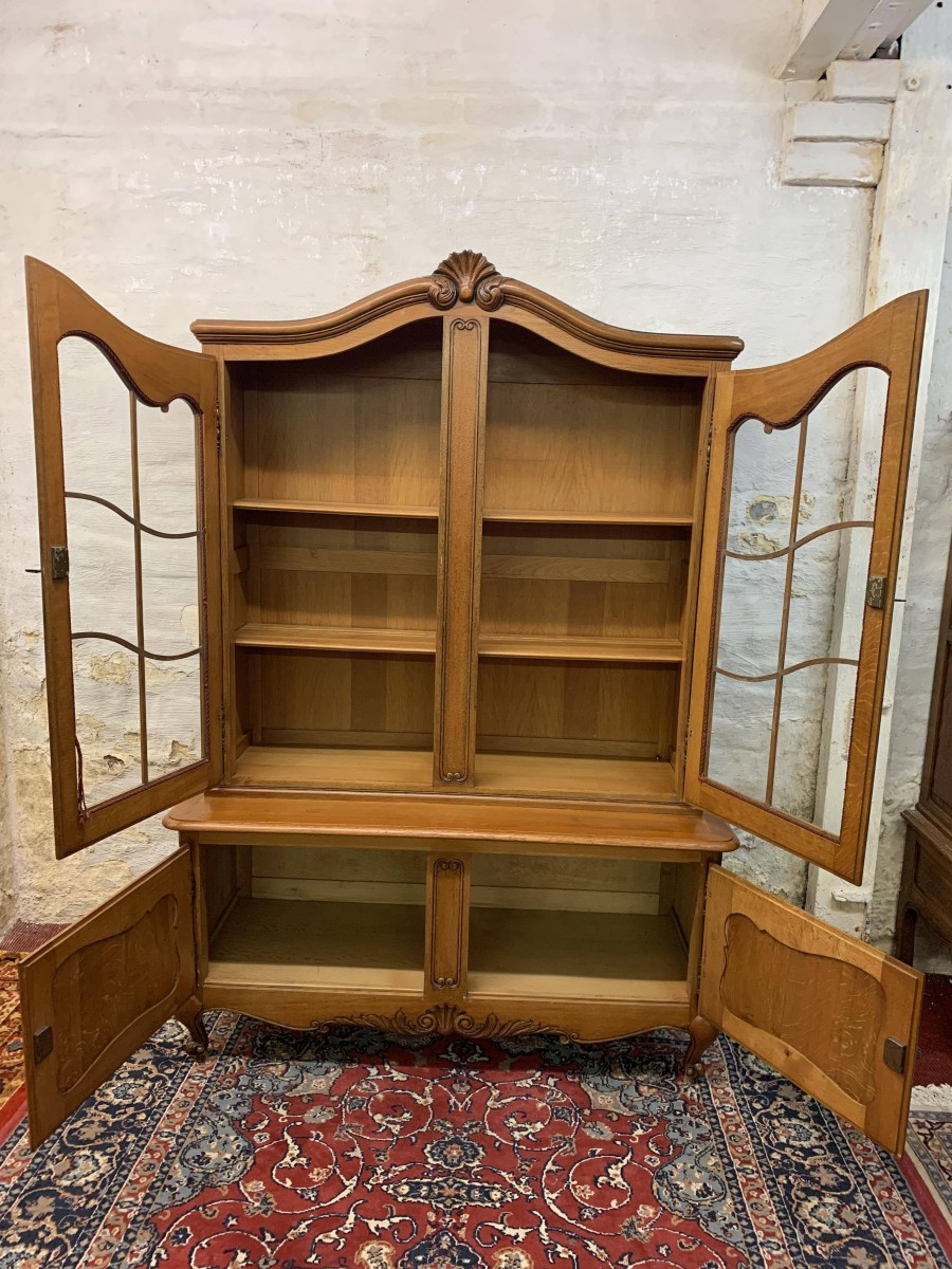 The top section has a oversailing top which rises to a central carving, below are a pair of lockable shaped glazed doors, each door having brass hinges, decorative brass escutcheon and key. The doors open to reveal two removable shelves. The base section having two carved lockable recessed panelled doors, each door having brass hinges, decorative brass escutcheon and key. Recessed panelled sides shaped skirt with decorative central carving this fabulous vitrine stands on two carved cabriole shaped legs to the front.