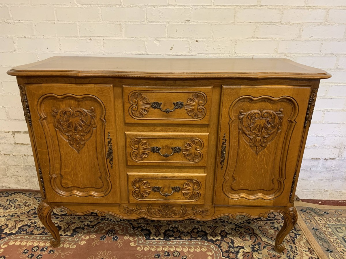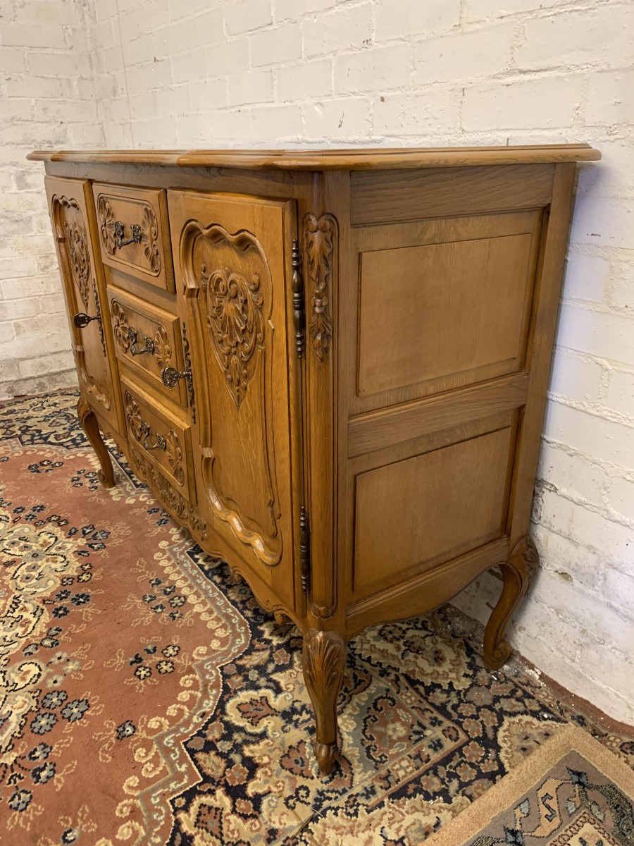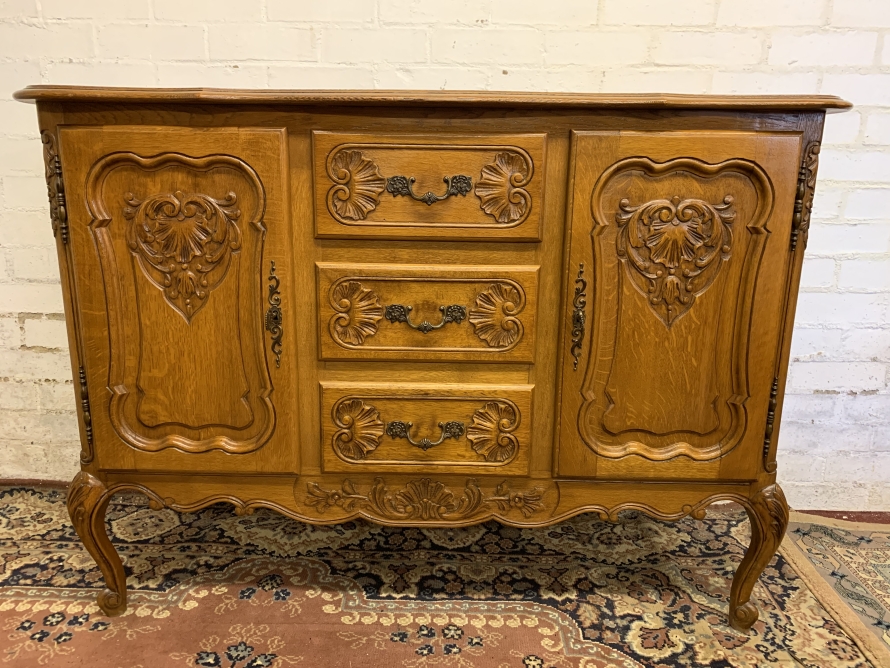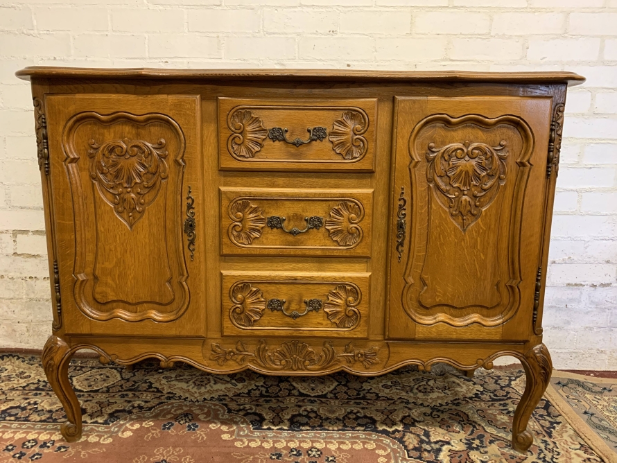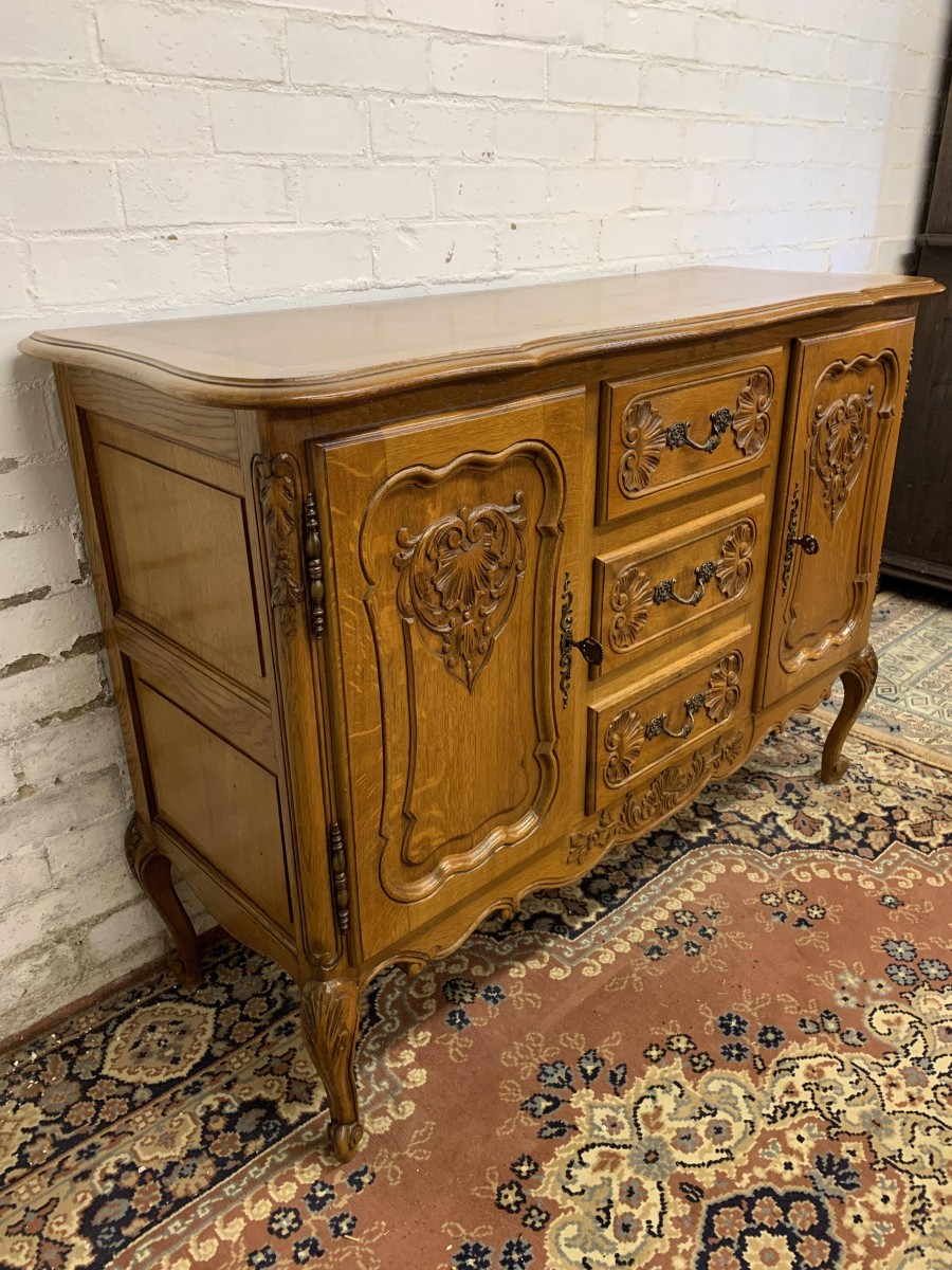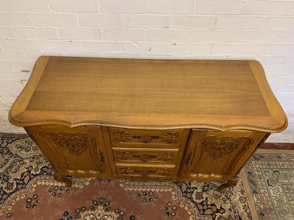 This neat sized French sideboard is in excellent condition. The shaped top sits above a central bank of three carved drawers, each drawer having a ornate handle. The central bank of drawers is flanked by a pair of carved recessed panelled lockable doors each door having brass hinges. The left-hand door opens to reveal good storage space, the right-hand door opens to reveal a removable shelf., Decorative brass escutcheon and key. Shaped skirt with decorative central carvings this super sideboard stands on four carved cabriole legs.