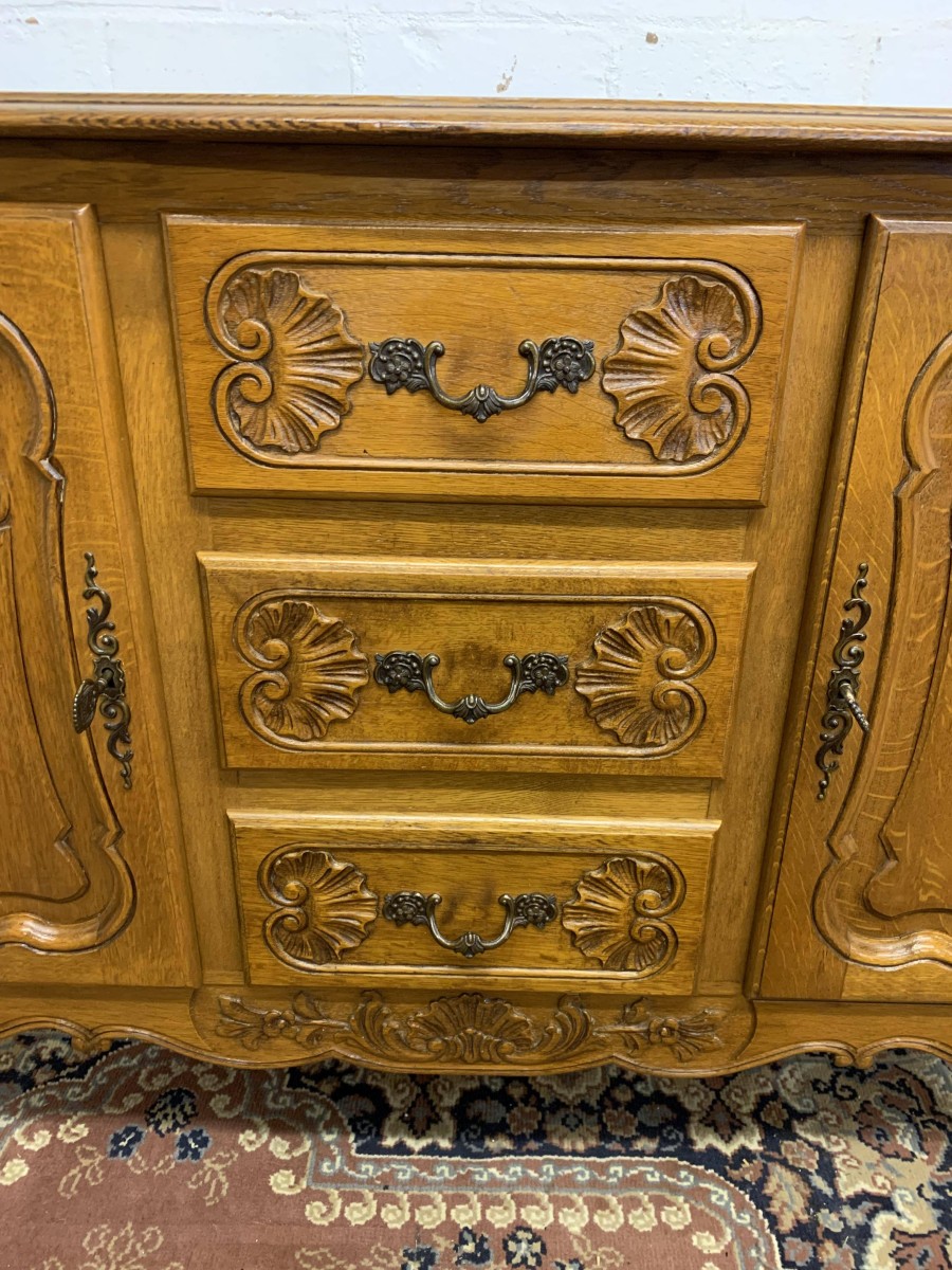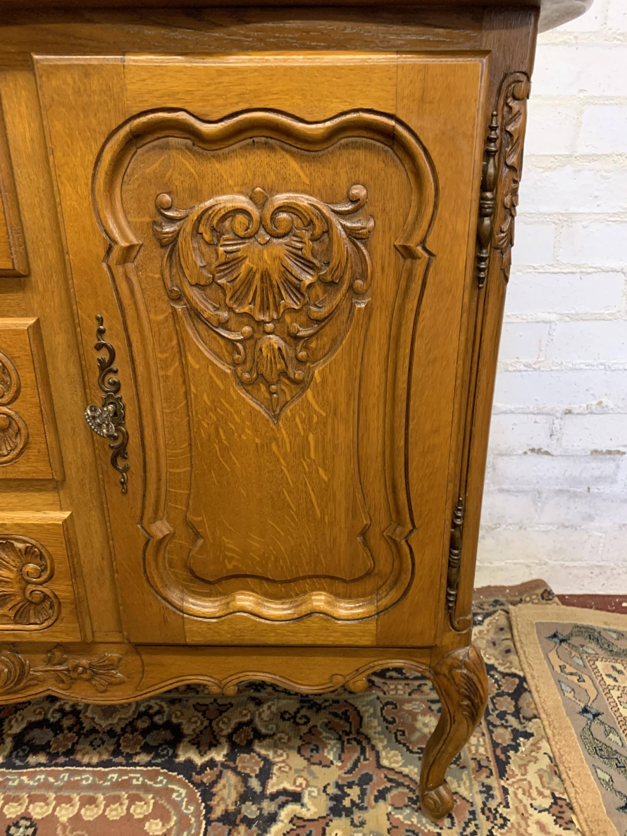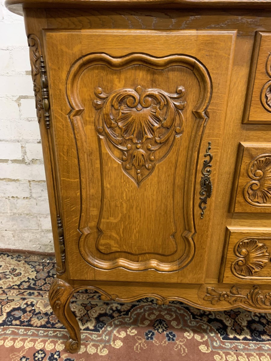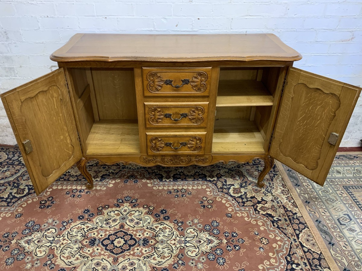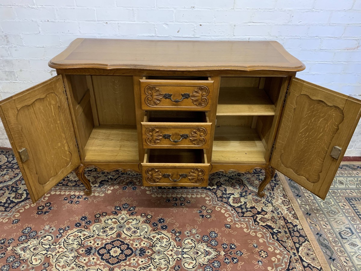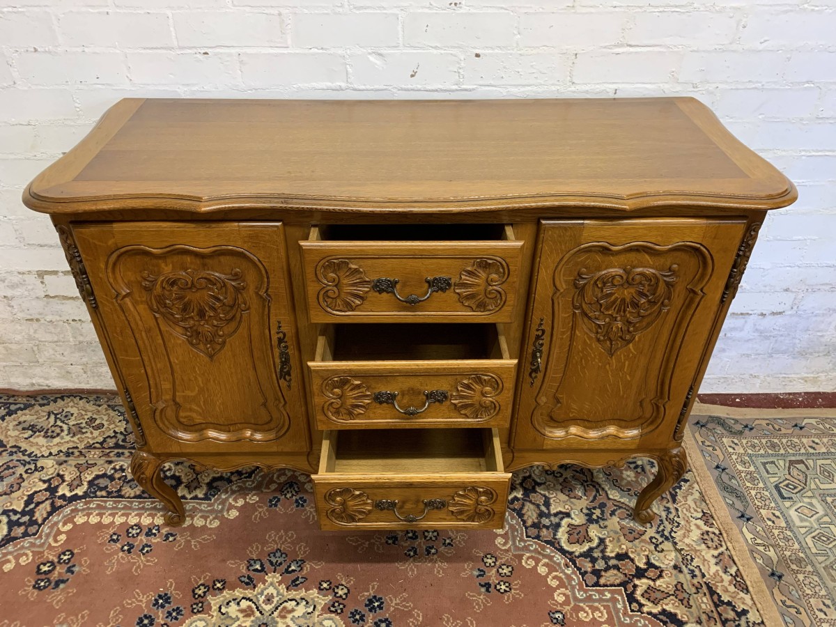 This neat sized French sideboard is in excellent condition. The shaped top sits above a central bank of three carved drawers, each drawer having a ornate handle. The central bank of drawers is flanked by a pair of carved recessed panelled lockable doors each door having brass hinges. The left-hand door opens to reveal good storage space, the right-hand door opens to reveal a removable shelf., Decorative brass escutcheon and key. Shaped skirt with decorative central carvings this super sideboard stands on four carved cabriole legs.