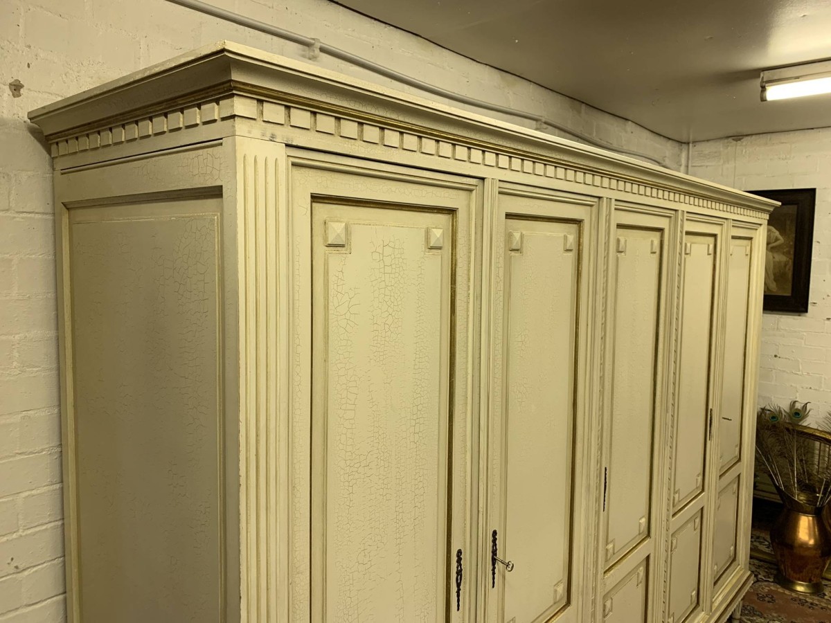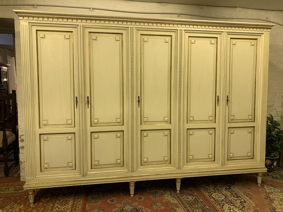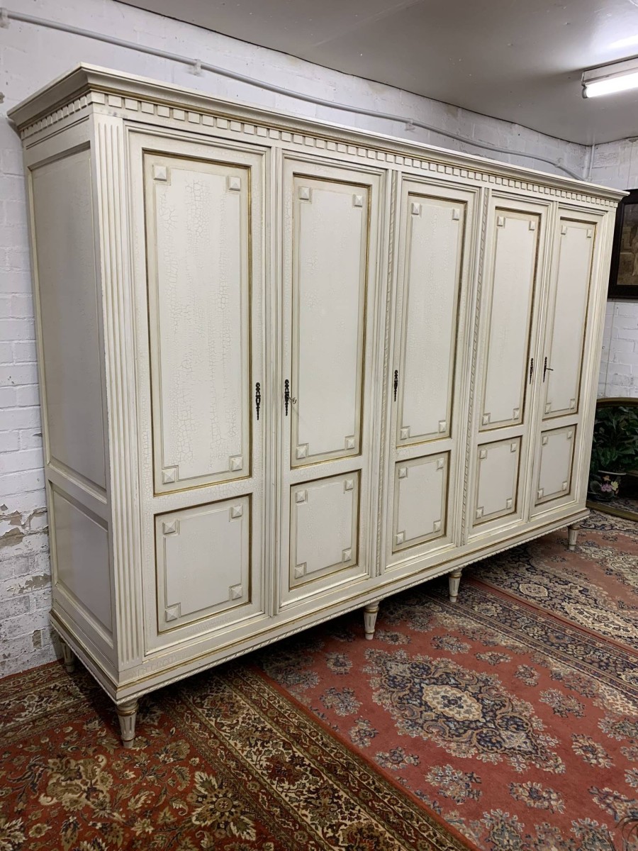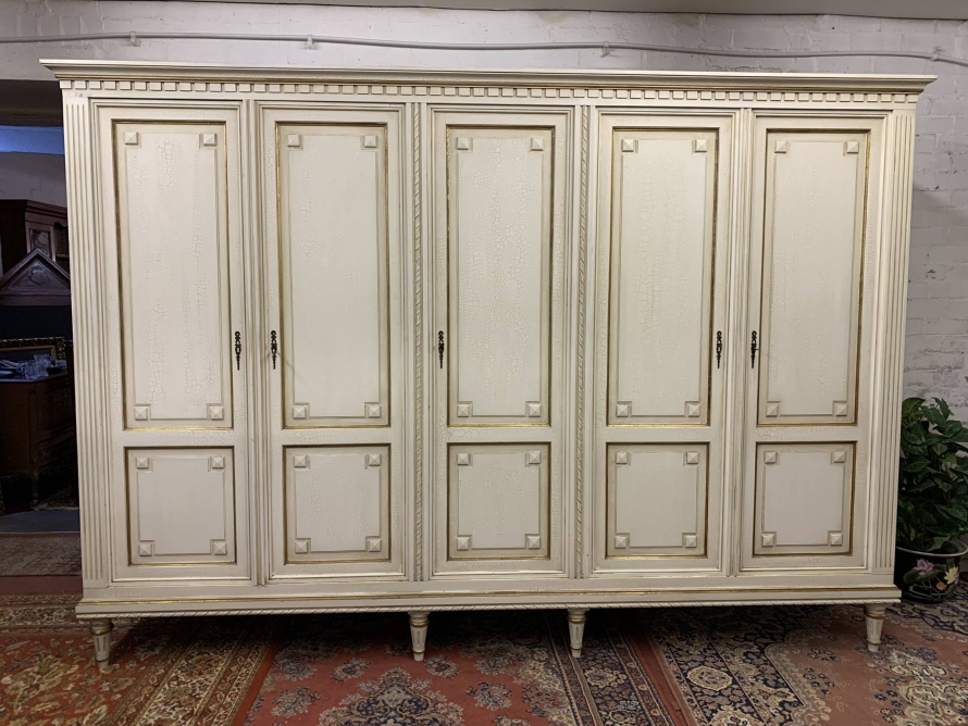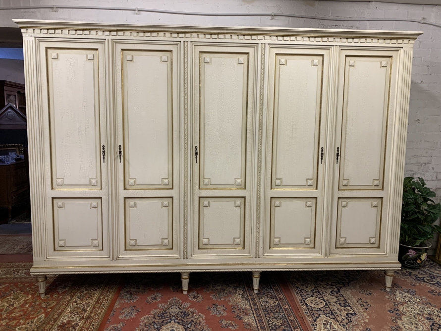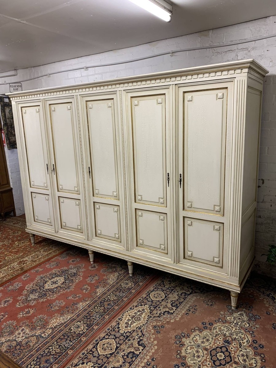 This stunning French armoire offers a fabulous amount of storage. The shaped oversailing top sits above five panelled lockable doors. The first pair of doors working from left to right open to reveal a shelf above a brass hanging rail. The central door opens to reveal four removable shelves. The right side pair of doors open to reveal a brass hanging rail with two large removable shelves below. Recessed panelled sides, carved skirt this fabulous armoire stands on six turned and tapered legs. Please note this armoire completely splits down for easy transportation and delivery into any home.