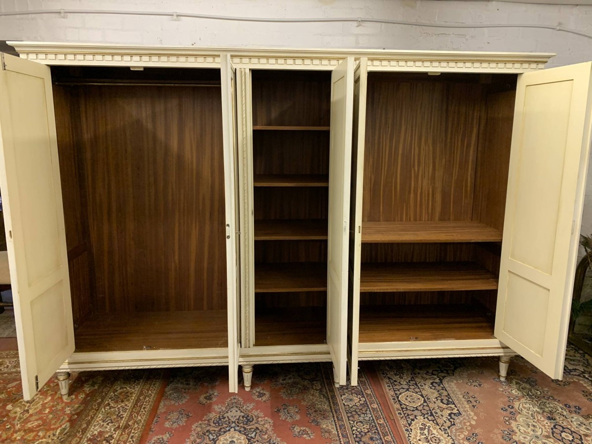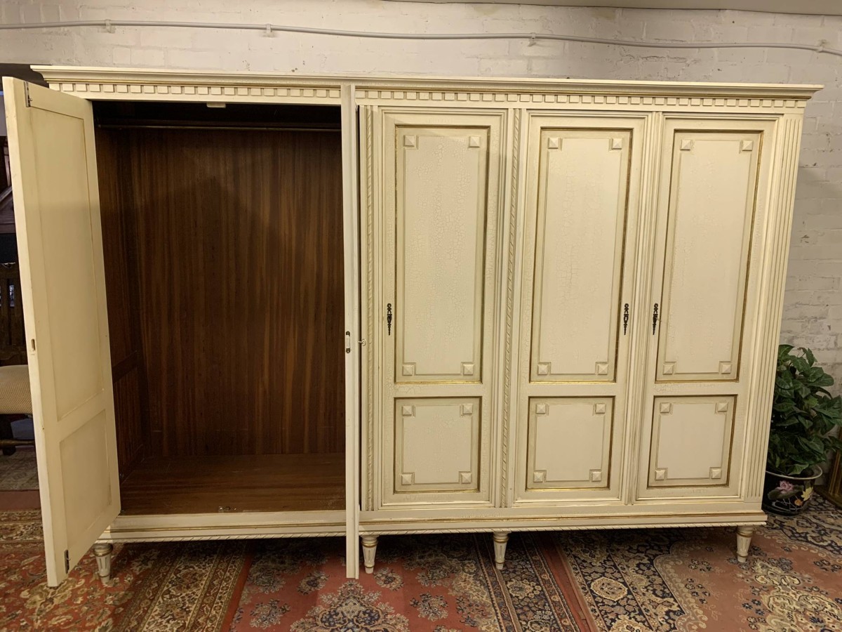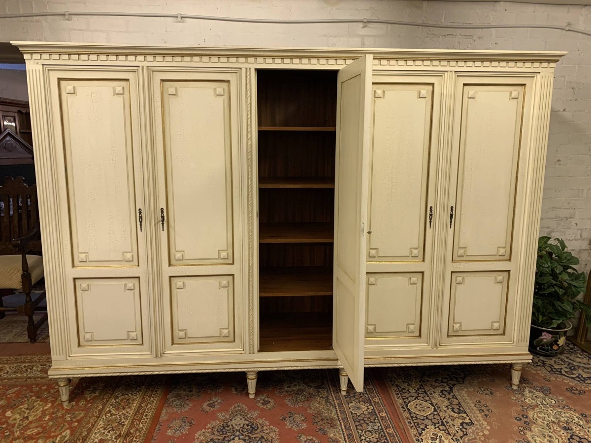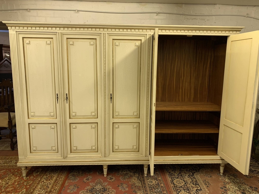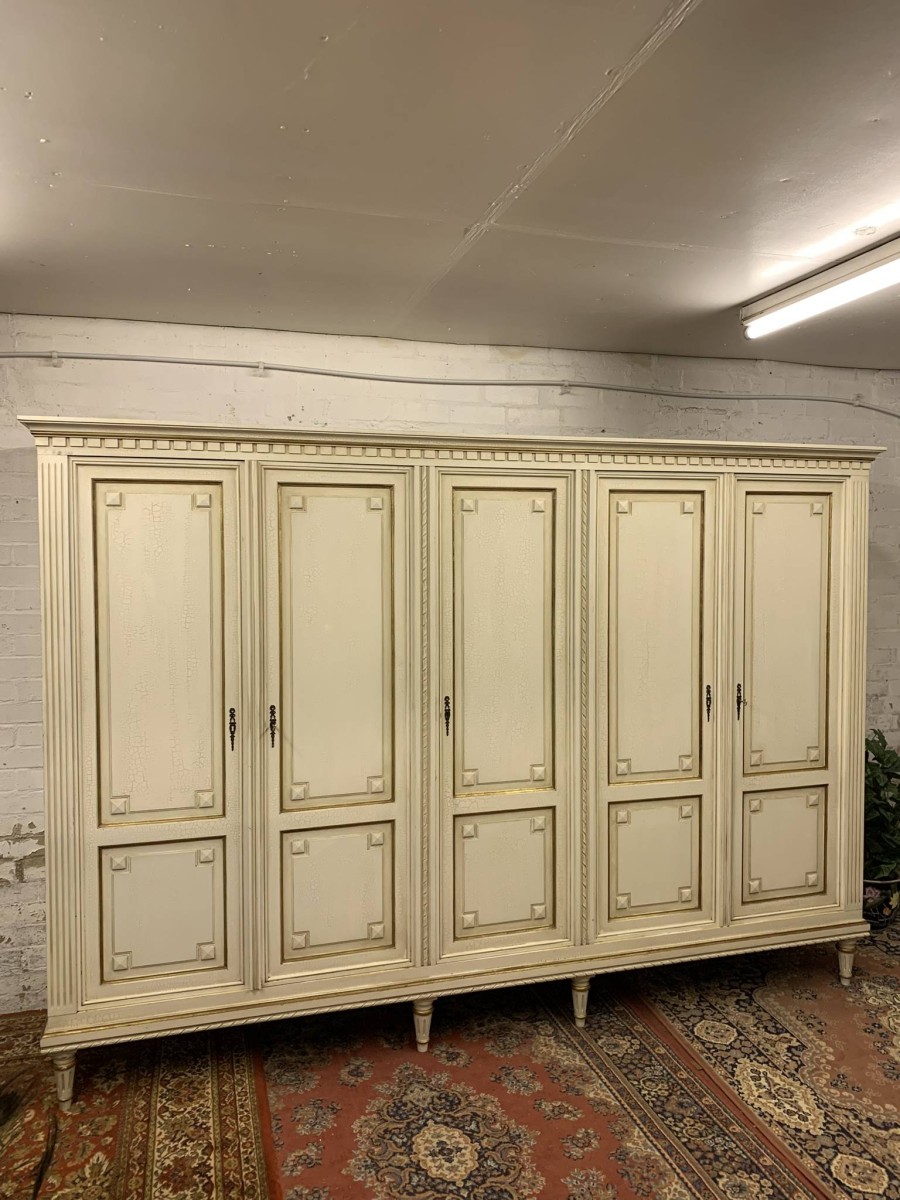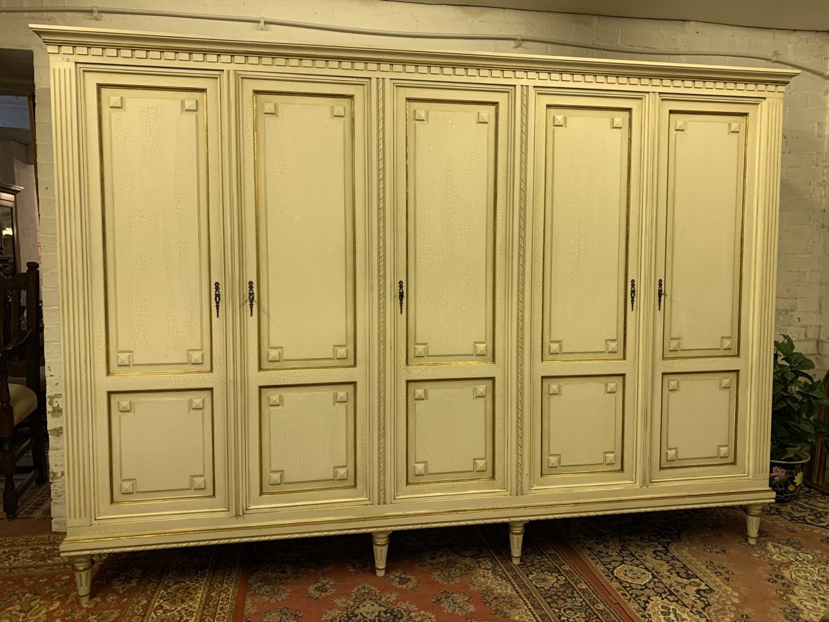 This stunning French armoire offers a fabulous amount of storage. The shaped oversailing top sits above five panelled lockable doors. The first pair of doors working from left to right open to reveal a shelf above a brass hanging rail. The central door opens to reveal four removable shelves. The right side pair of doors open to reveal a brass hanging rail with two large removable shelves below. Recessed panelled sides, carved skirt this fabulous armoire stands on six turned and tapered legs. Please note this armoire completely splits down for easy transportation and delivery into any home.