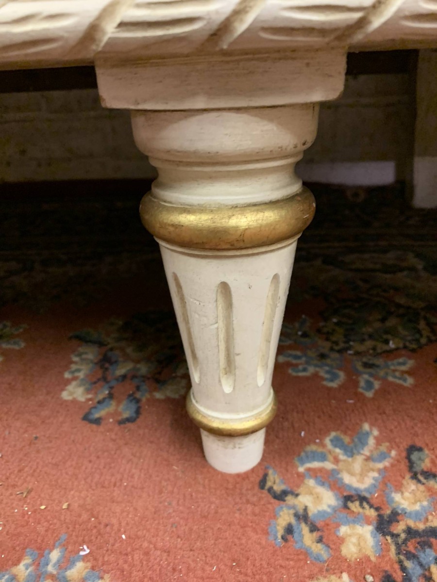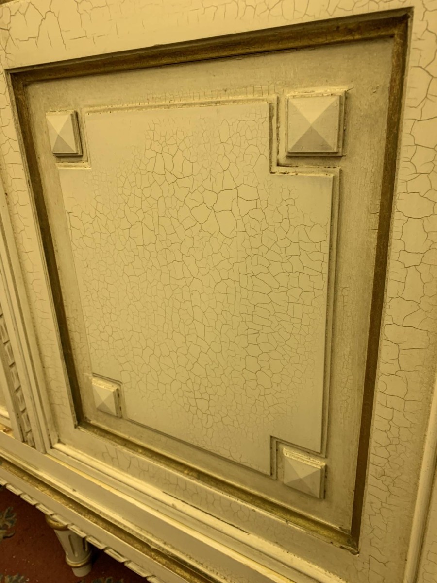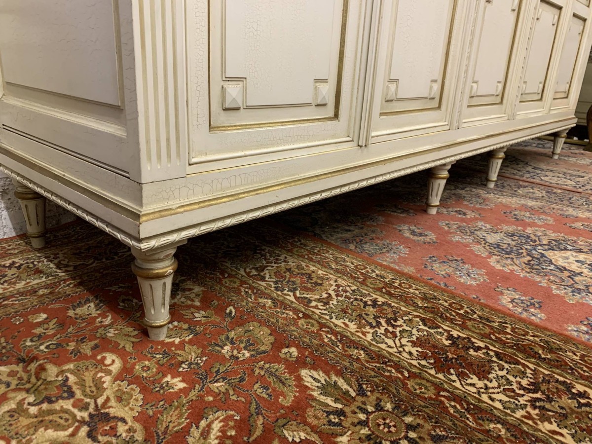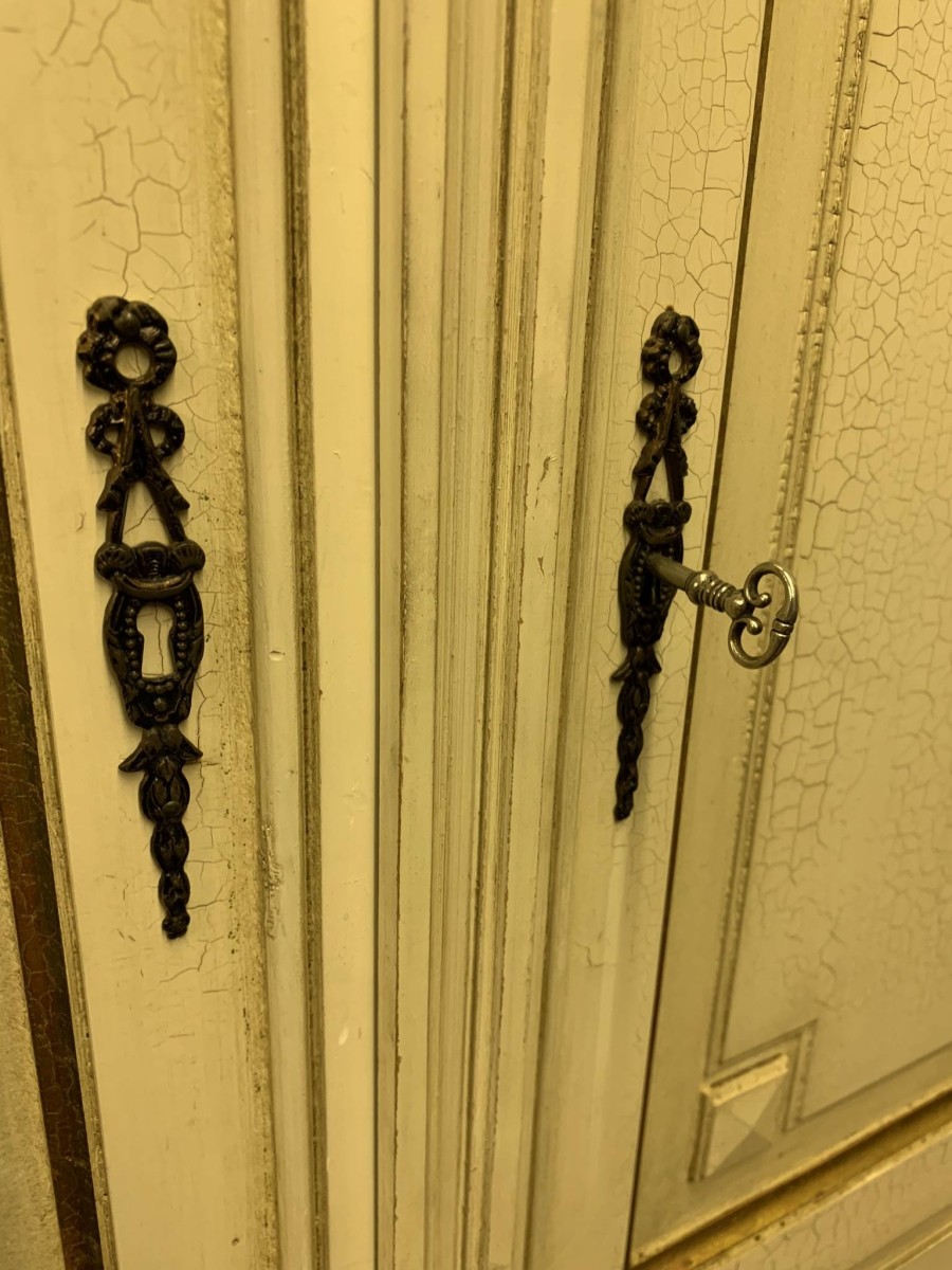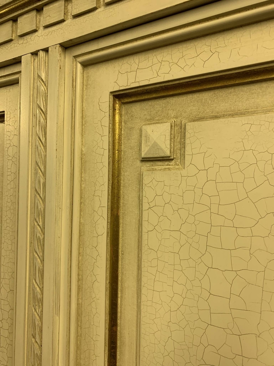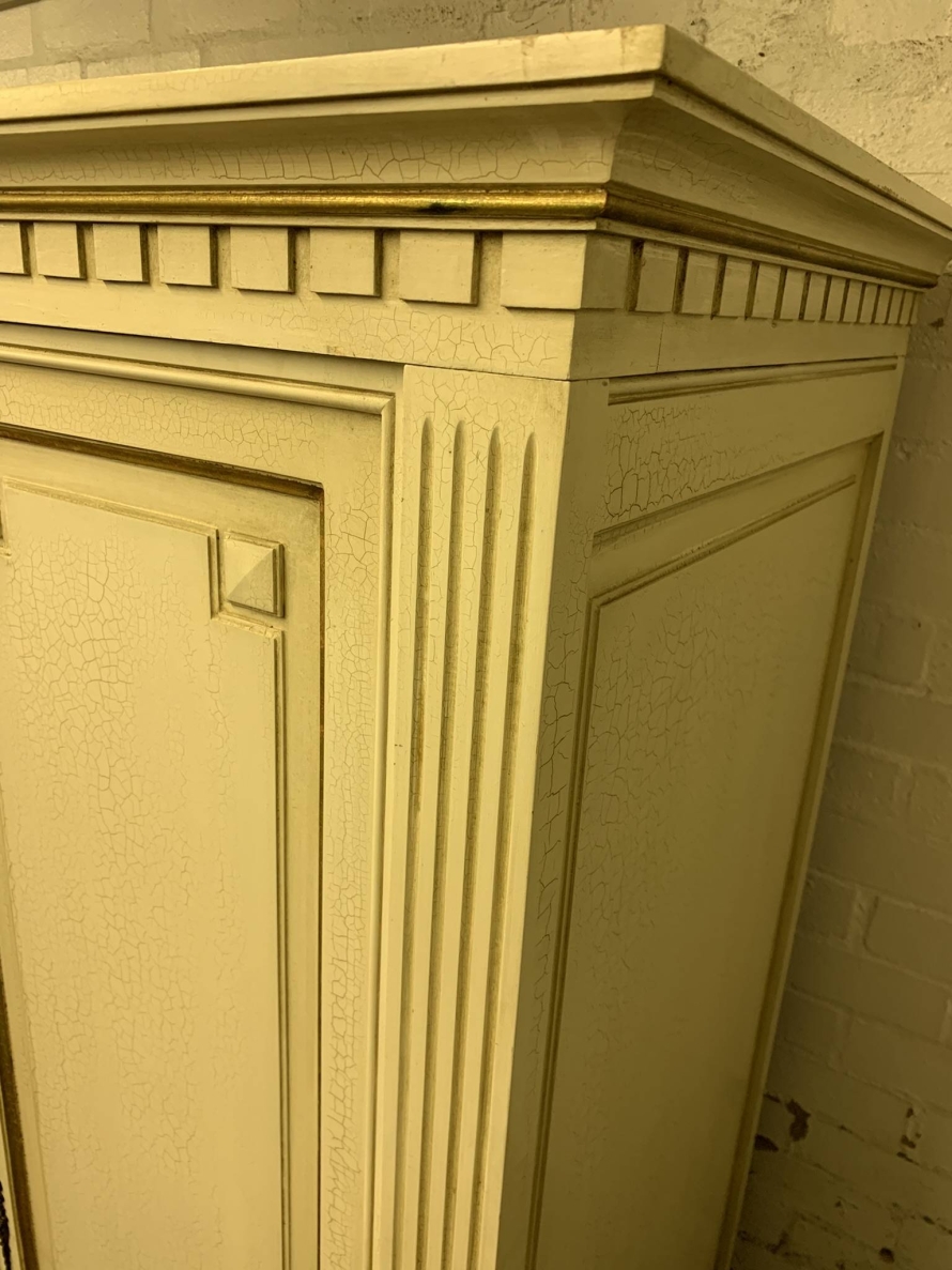 This stunning French armoire offers a fabulous amount of storage. The shaped oversailing top sits above five panelled lockable doors. The first pair of doors working from left to right open to reveal a shelf above a brass hanging rail. The central door opens to reveal four removable shelves. The right side pair of doors open to reveal a brass hanging rail with two large removable shelves below. Recessed panelled sides, carved skirt this fabulous armoire stands on six turned and tapered legs. Please note this armoire completely splits down for easy transportation and delivery into any home.