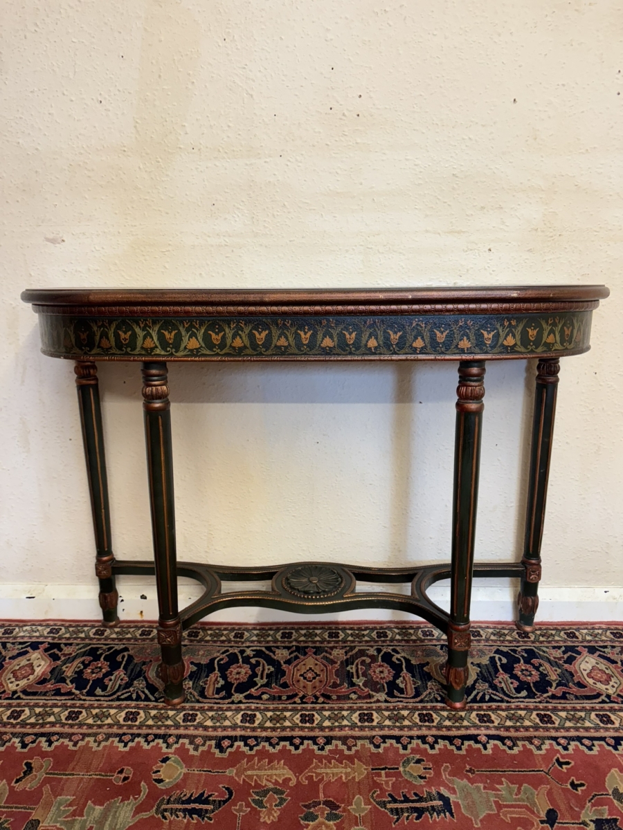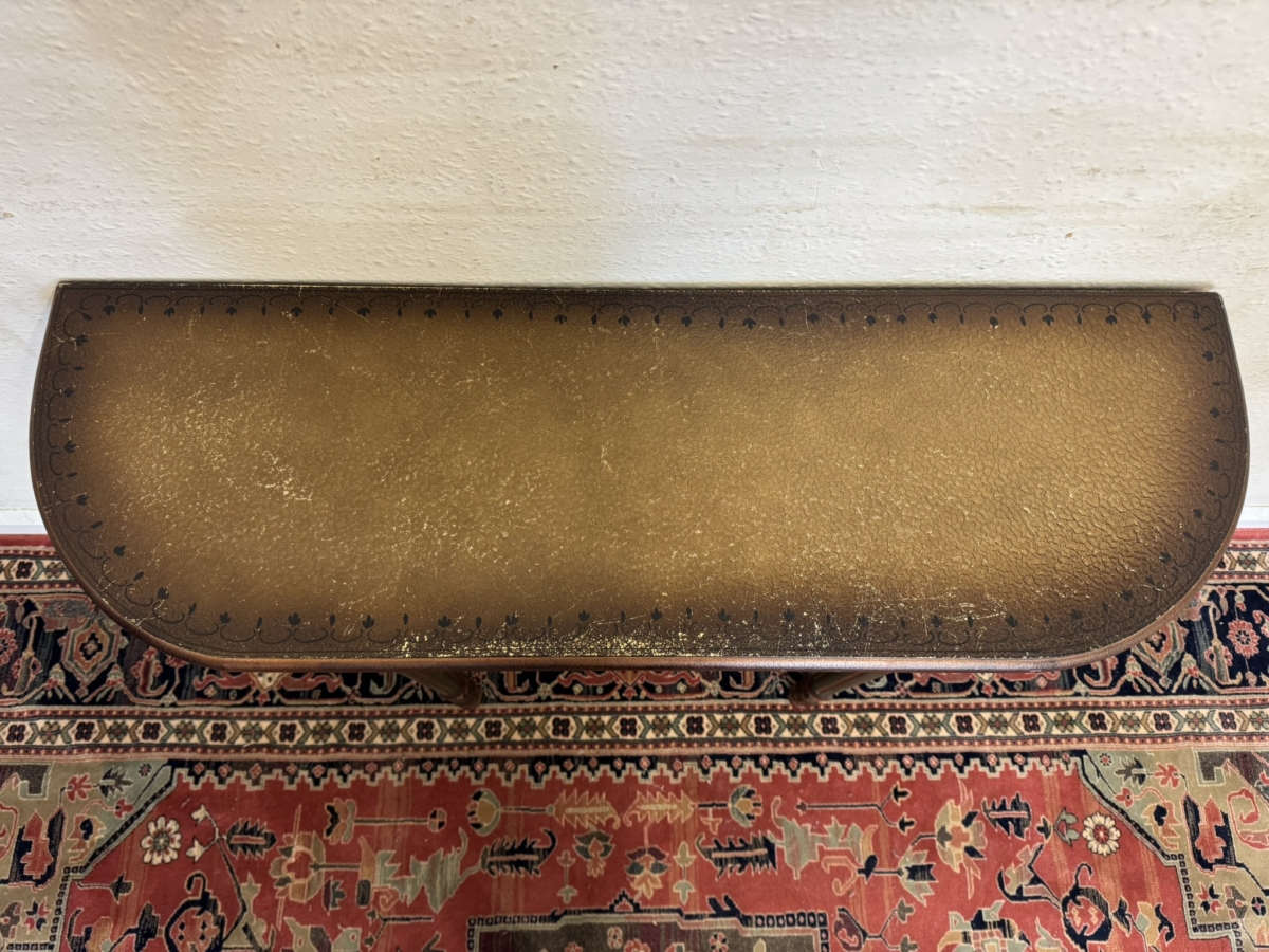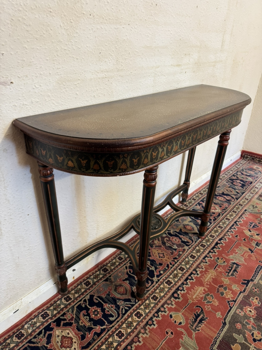 The over sailing top has a decorative freeze to the front. Four turned legs, shaped stretcher support with decorative carving and standing on four turned feet.