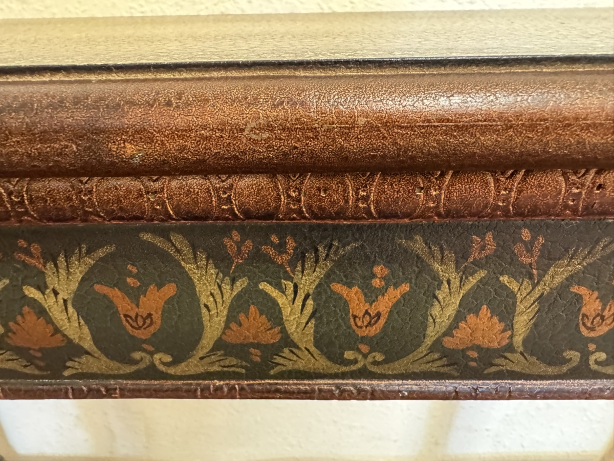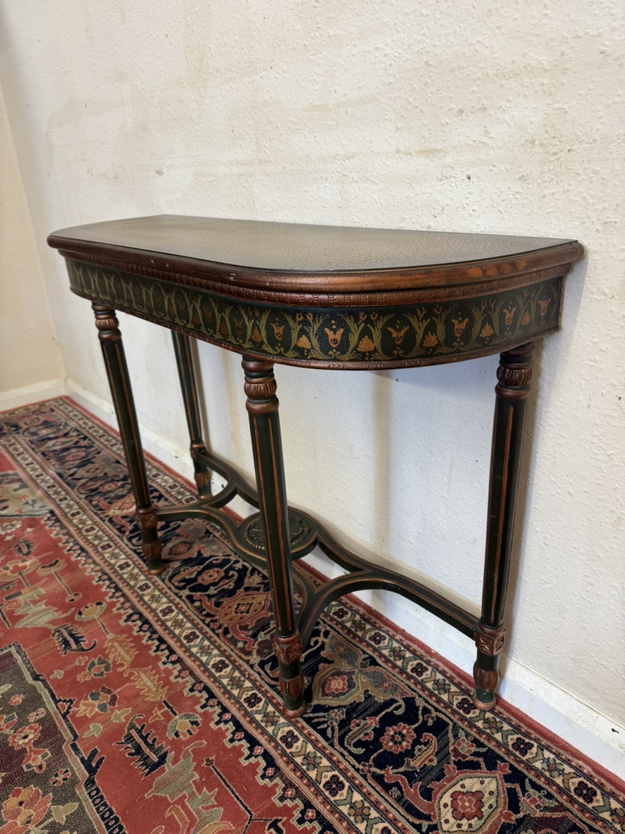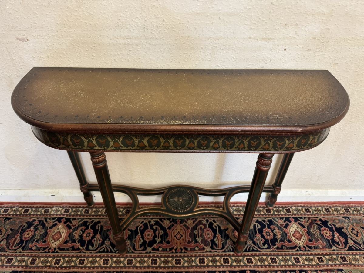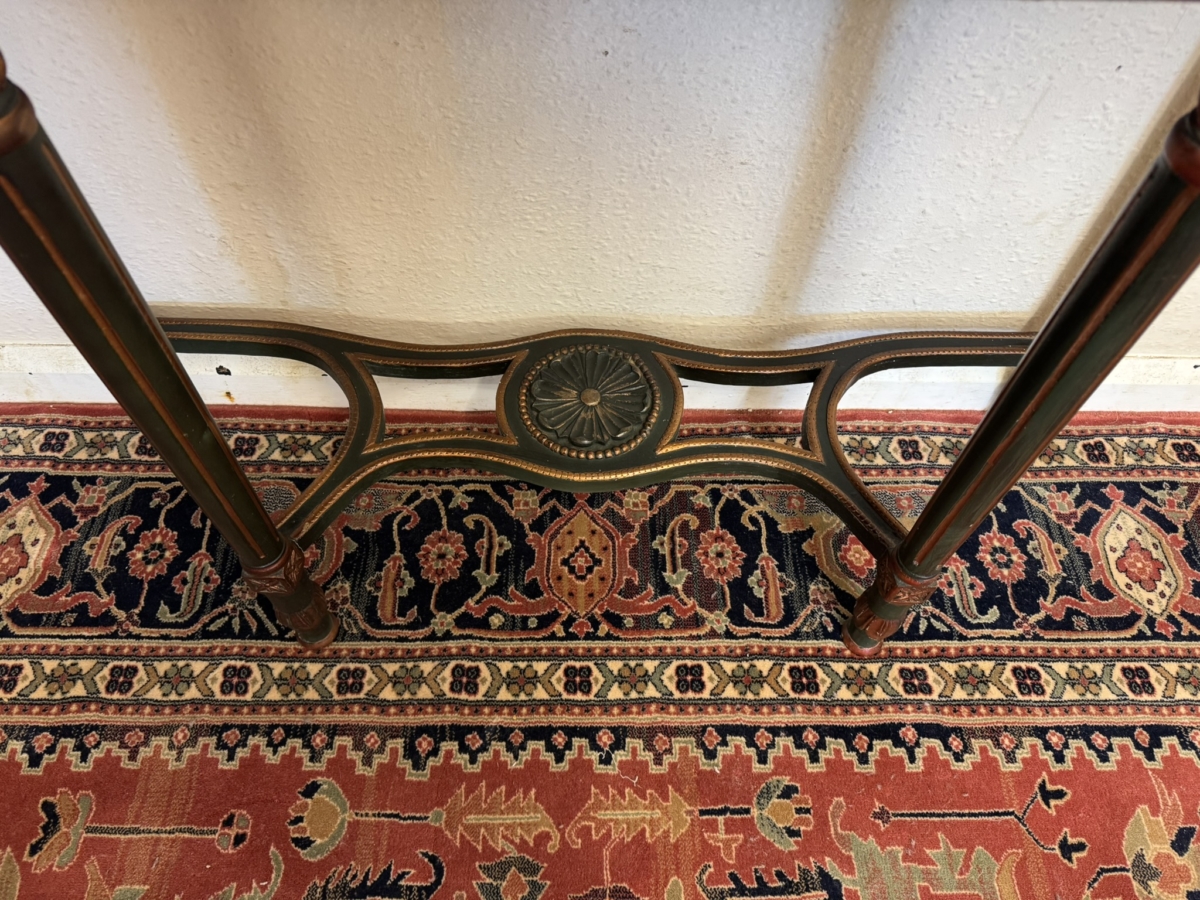 The over sailing top has a decorative freeze to the front. Four turned legs, shaped stretcher support with decorative carving and standing on four turned feet.