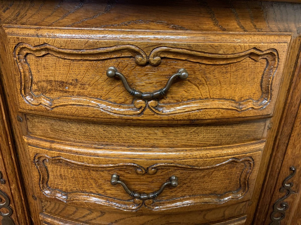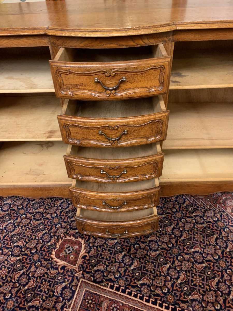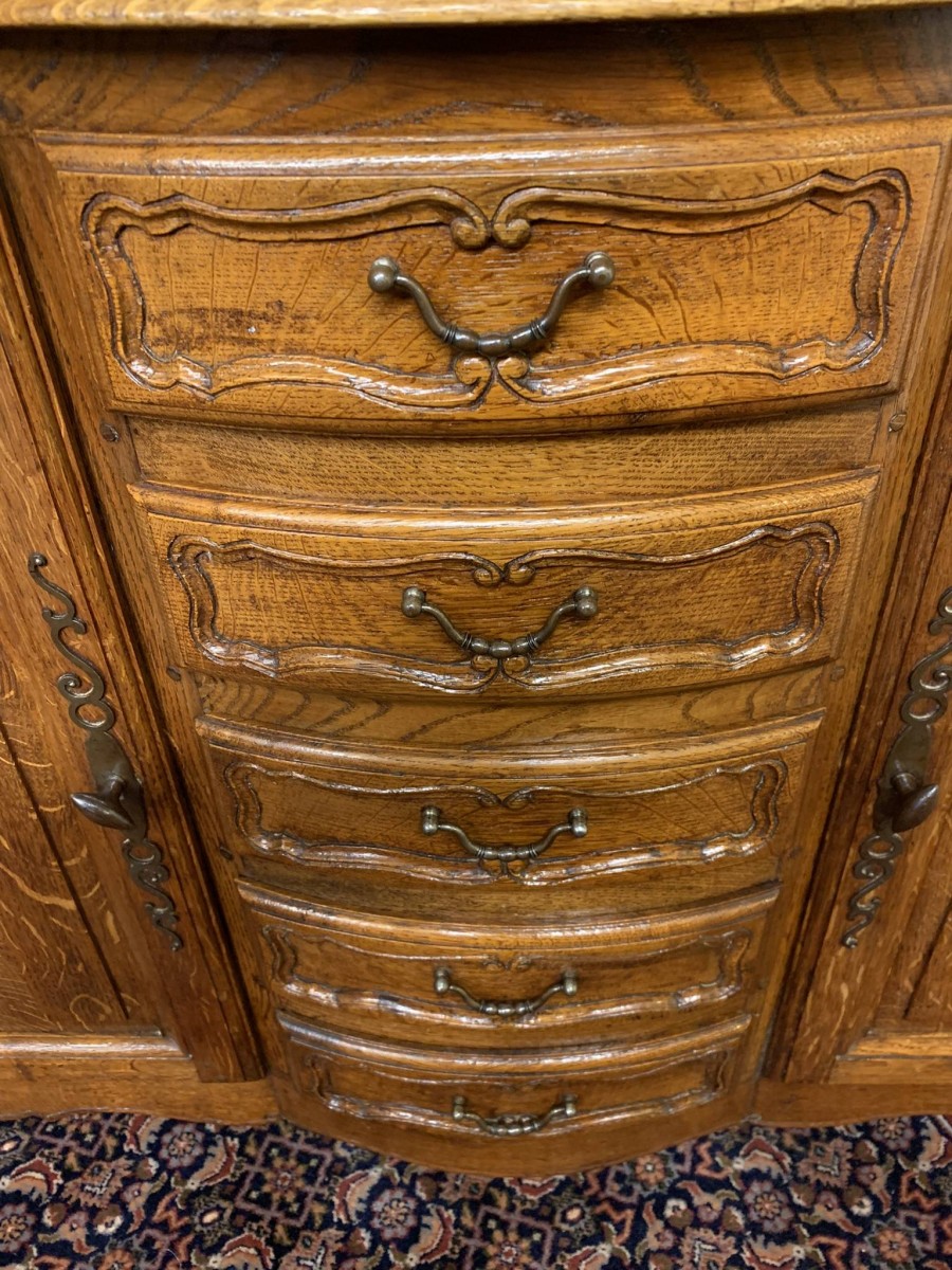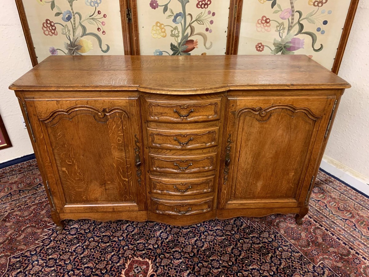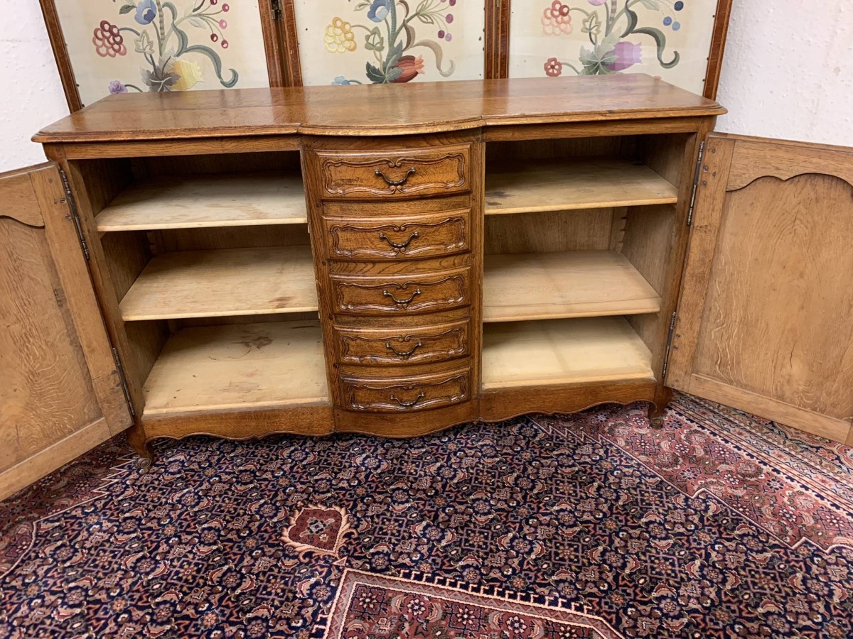 This neat -sized dresser is made in glorious solid oak. The shaped oversailing top sits above a central bank of five curved drawers, each drawer having a brass handle. The central drawers are flanked by a pair of lockable shaped recessed panelled cupboard doors, each door opens to reveal two adjustable and removable shelves. Recessed panelled sides, this fabulous dresser stands on two carved cabriole shaped legs to the front.