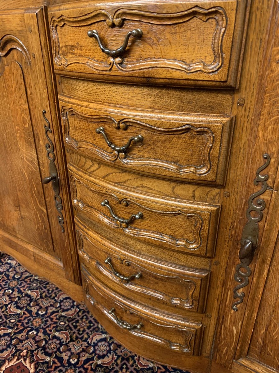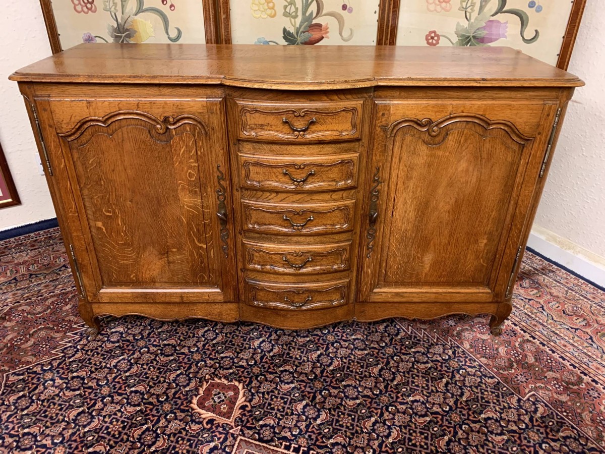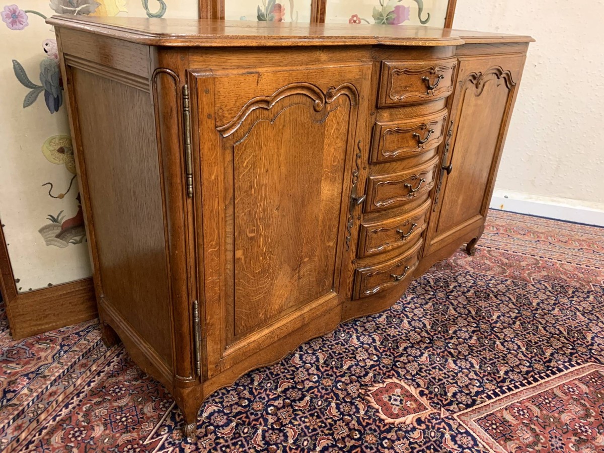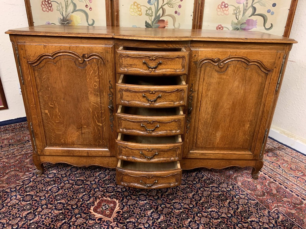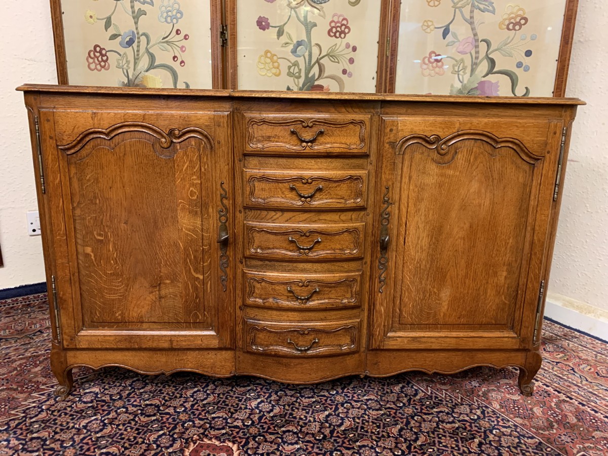This neat -sized dresser is made in glorious solid oak. The shaped oversailing top sits above a central bank of five curved drawers, each drawer having a brass handle. The central drawers are flanked by a pair of lockable shaped recessed panelled cupboard doors, each door opens to reveal two adjustable and removable shelves. Recessed panelled sides, this fabulous dresser stands on two carved cabriole shaped legs to the front.