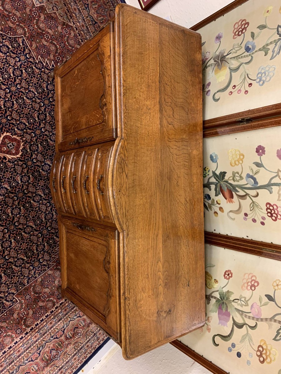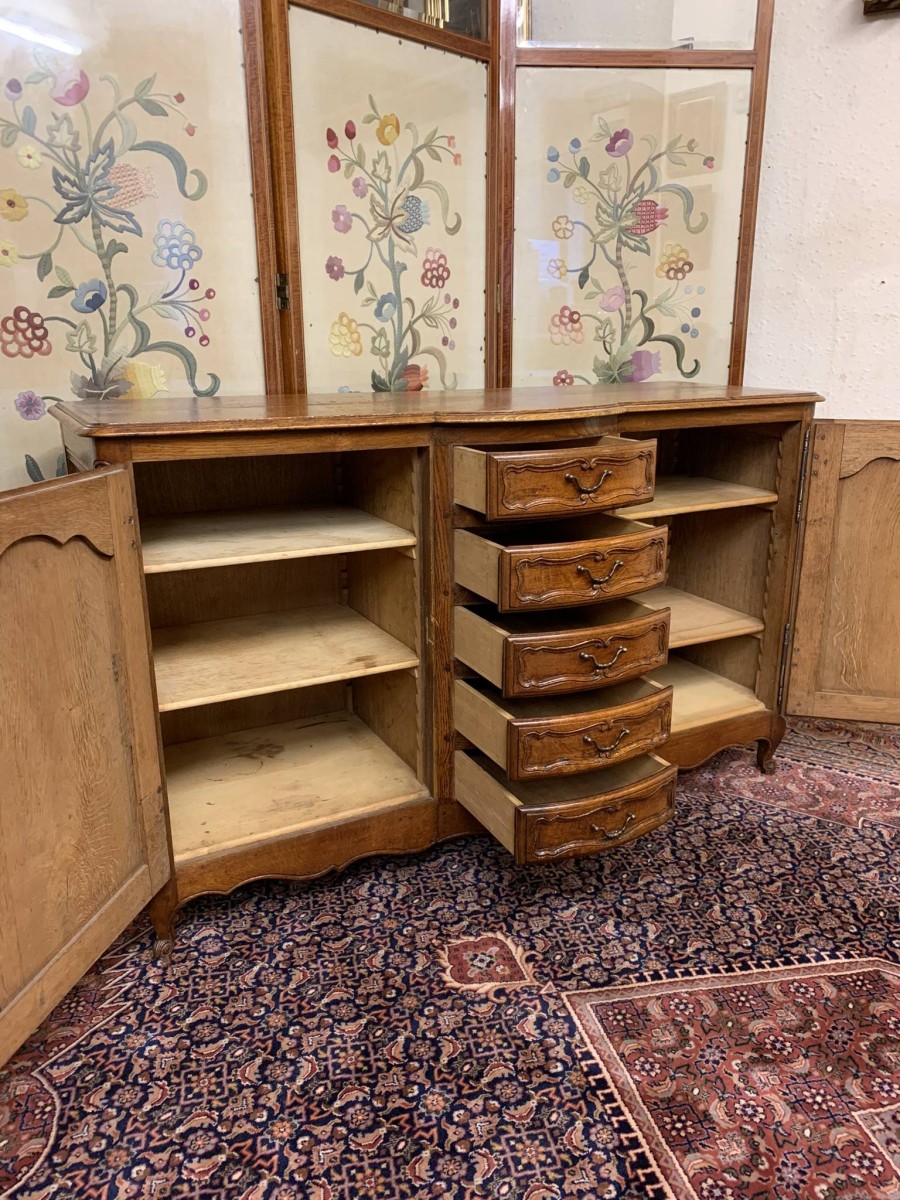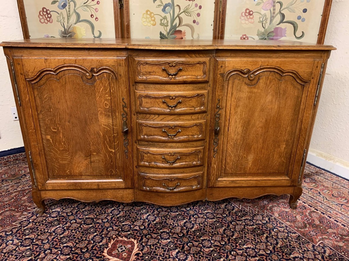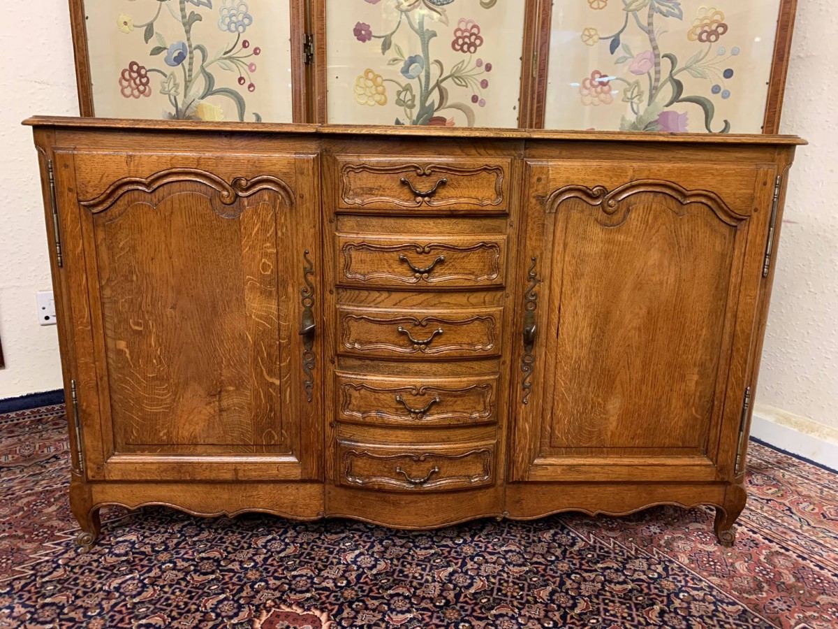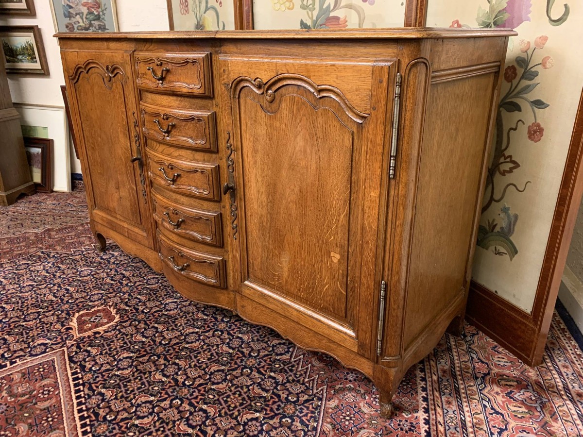 This neat -sized dresser is made in glorious solid oak. The shaped oversailing top sits above a central bank of five curved drawers, each drawer having a brass handle. The central drawers are flanked by a pair of lockable shaped recessed panelled cupboard doors, each door opens to reveal two adjustable and removable shelves. Recessed panelled sides, this fabulous dresser stands on two carved cabriole shaped legs to the front.