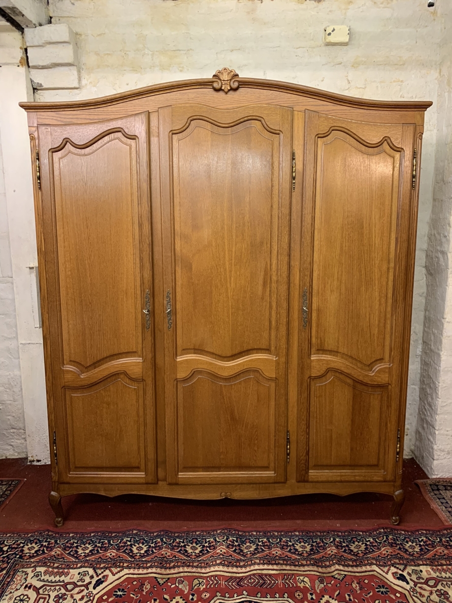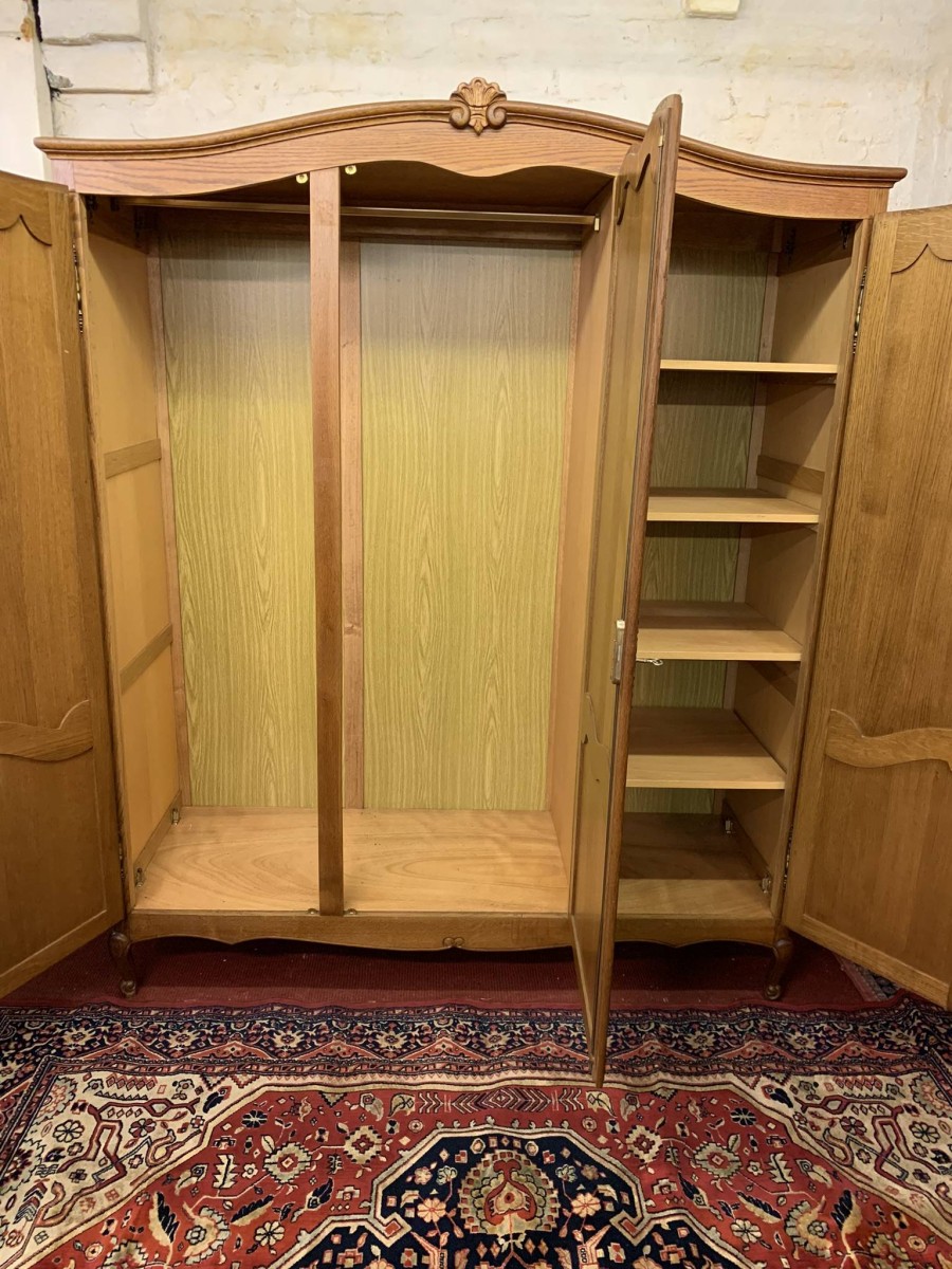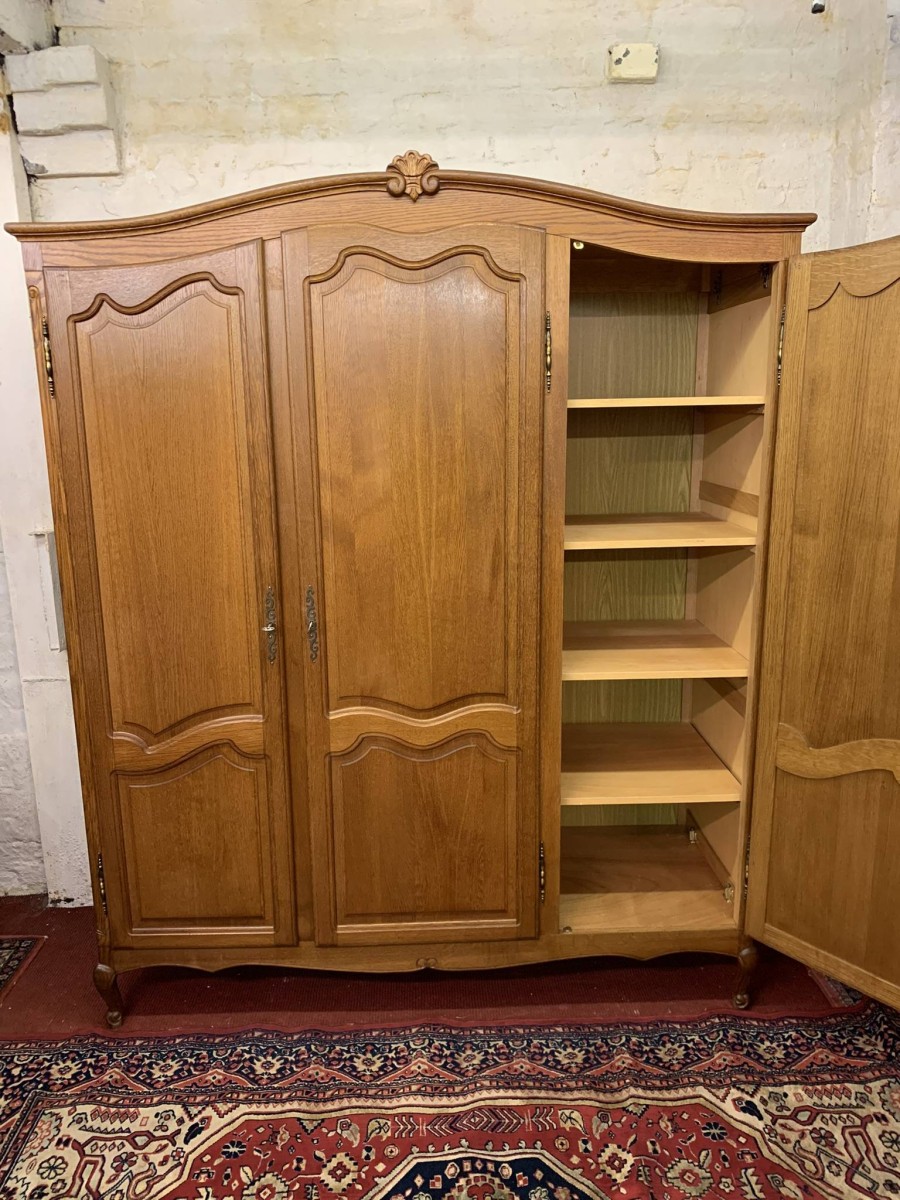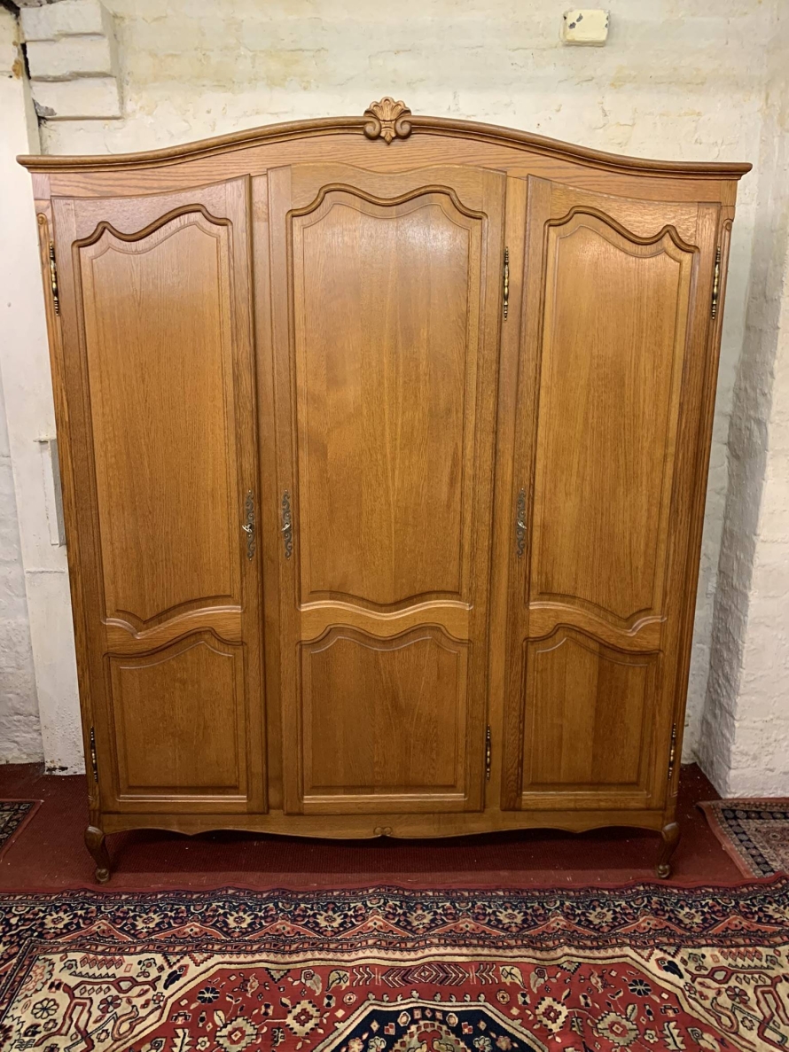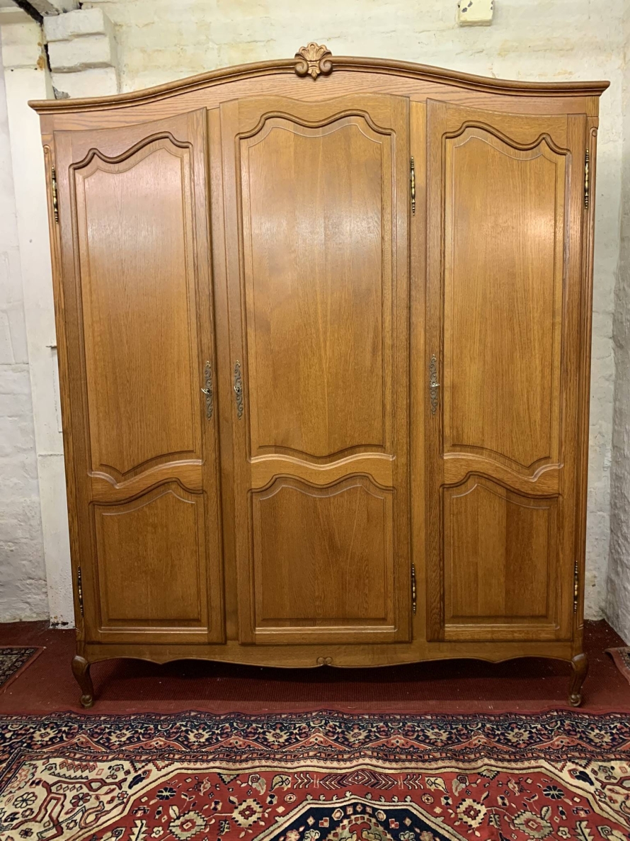 The shaped oversailing top rises to a decorative central carving. Below are three lockable doors, each door having brass hinges, brass escutcheon and brass key. The left-hand door and central door open to reveal a hanging rail. The right-hand door opens to reveal four removable shelves. Recessed panelled sides, shaped skirt this super armoire stands on carved cabriole legs to the front. Please note this armoire completely splits down for easy transportation and delivery into any home.