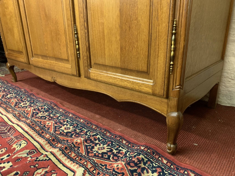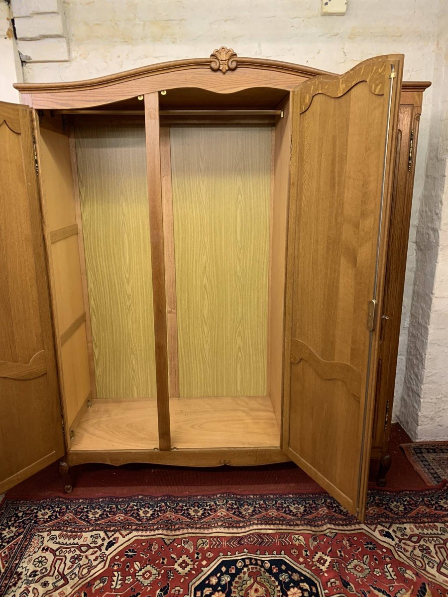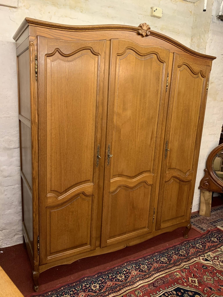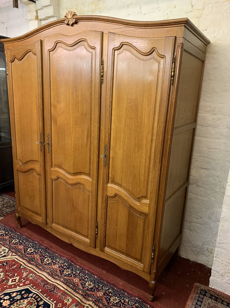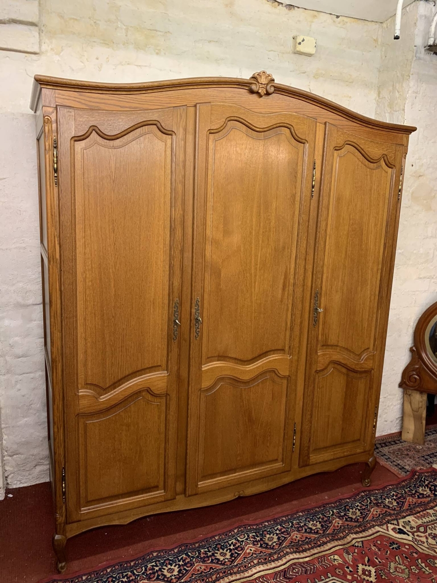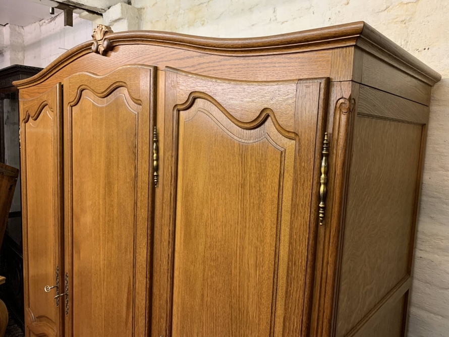 The shaped oversailing top rises to a decorative central carving. Below are three lockable doors, each door having brass hinges, brass escutcheon and brass key. The left-hand door and central door open to reveal a hanging rail. The right-hand door opens to reveal four removable shelves. Recessed panelled sides, shaped skirt this super armoire stands on carved cabriole legs to the front. Please note this armoire completely splits down for easy transportation and delivery into any home.