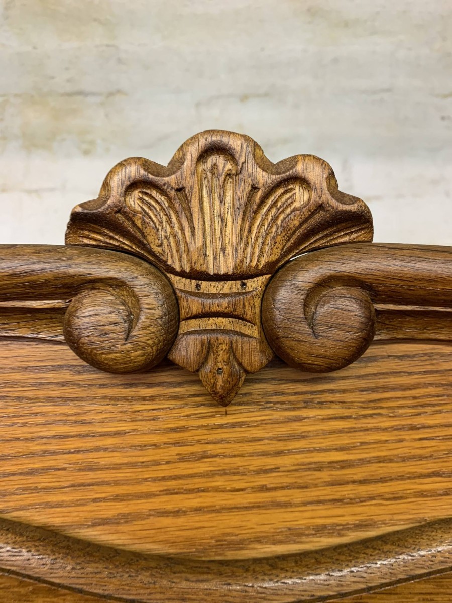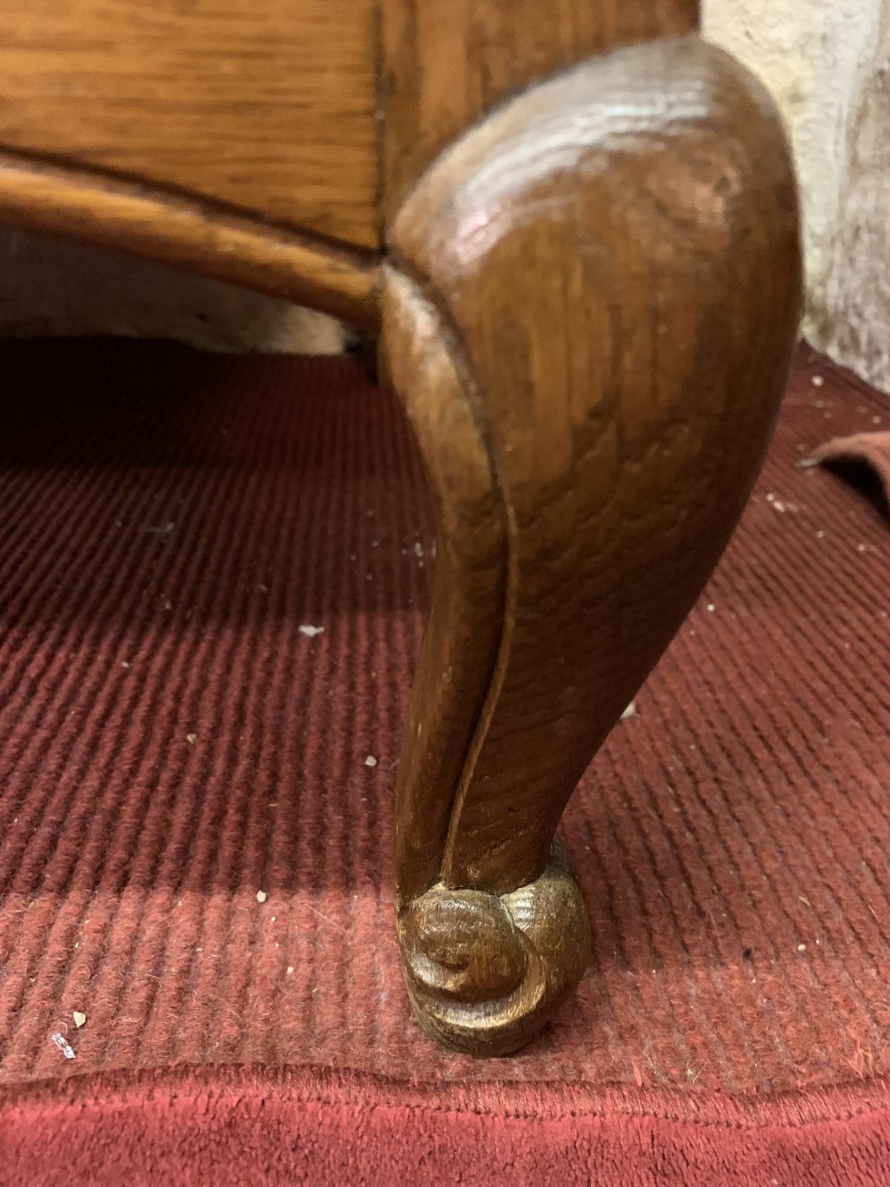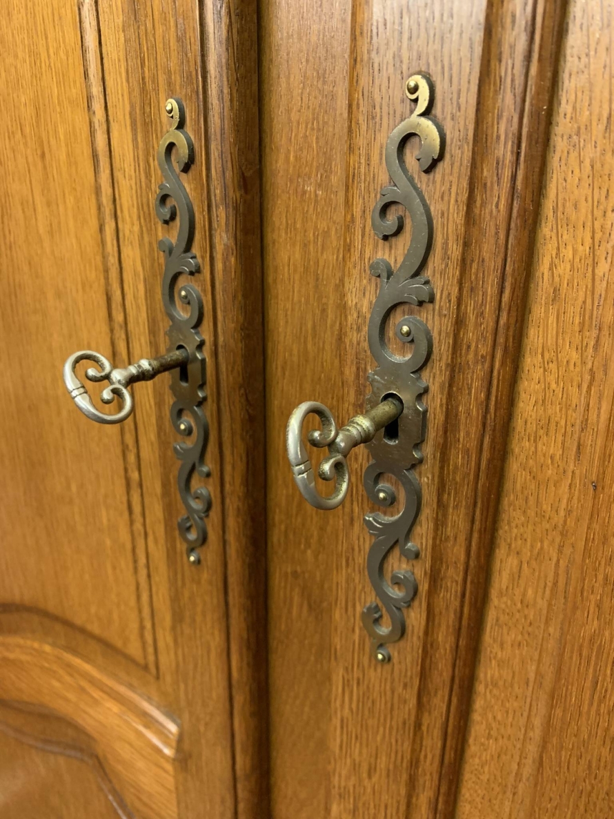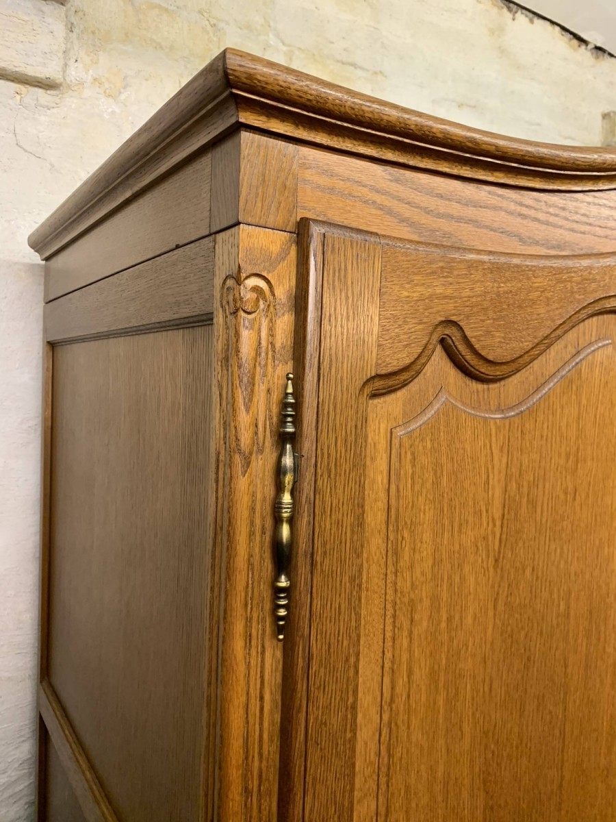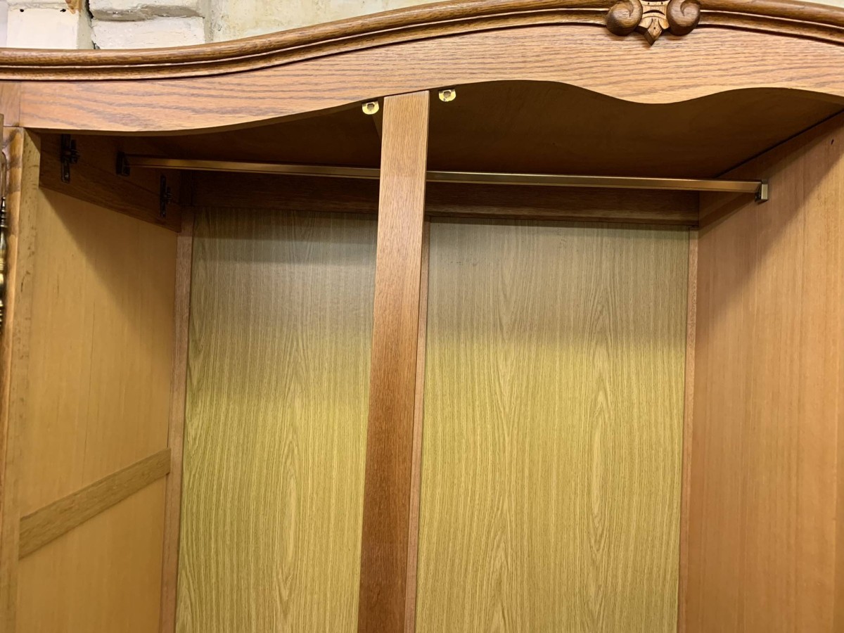 The shaped oversailing top rises to a decorative central carving. Below are three lockable doors, each door having brass hinges, brass escutcheon and brass key. The left-hand door and central door open to reveal a hanging rail. The right-hand door opens to reveal four removable shelves. Recessed panelled sides, shaped skirt this super armoire stands on carved cabriole legs to the front. Please note this armoire completely splits down for easy transportation and delivery into any home.