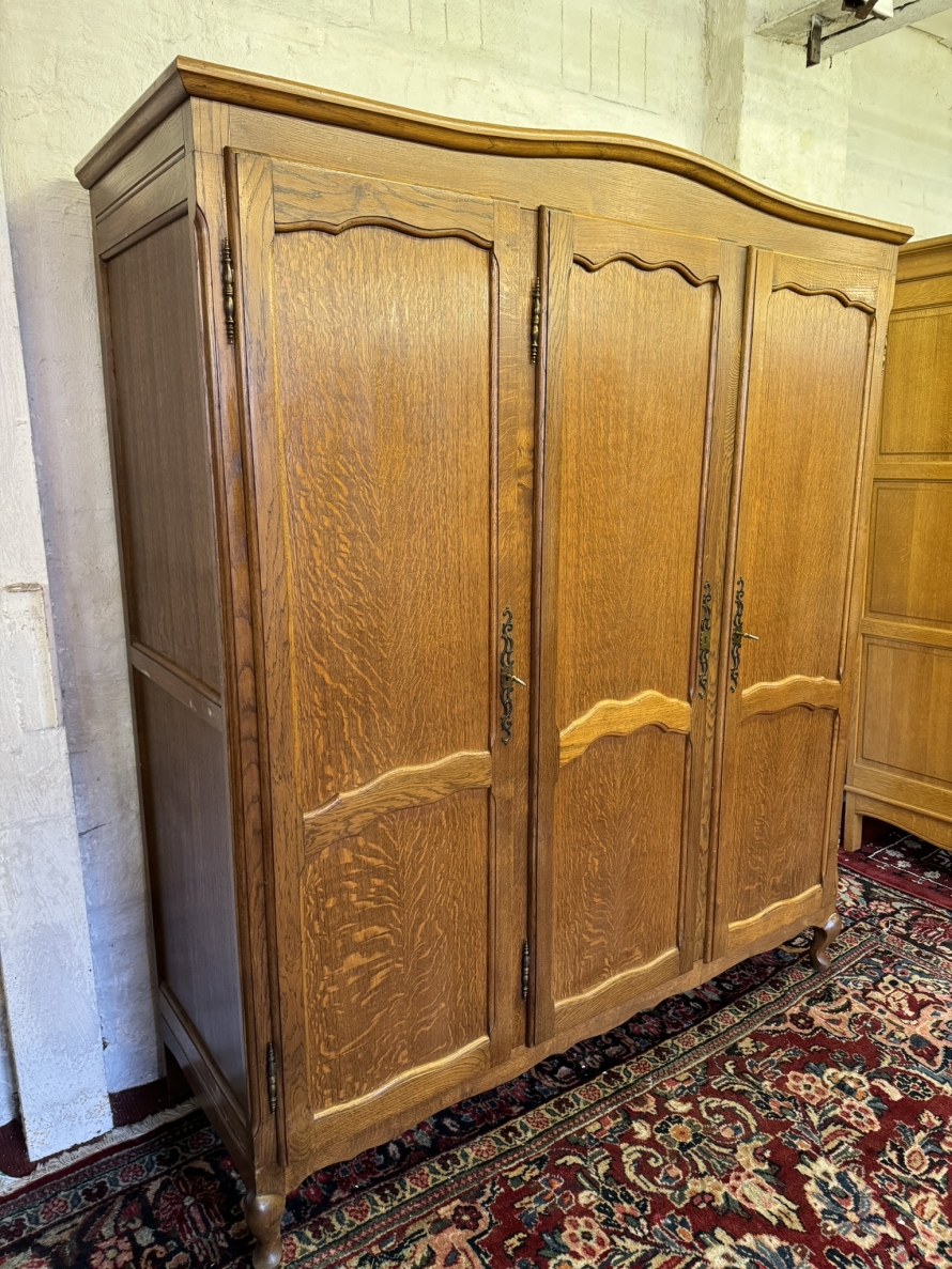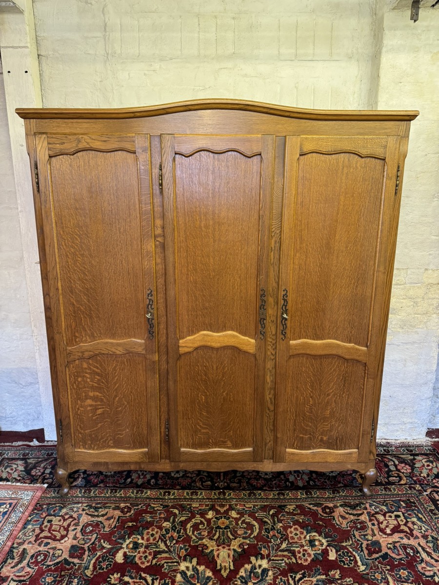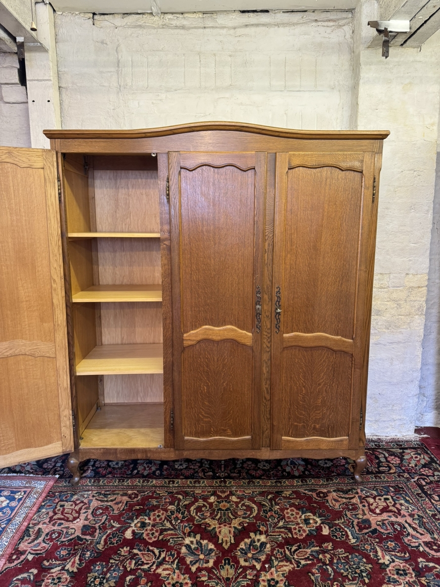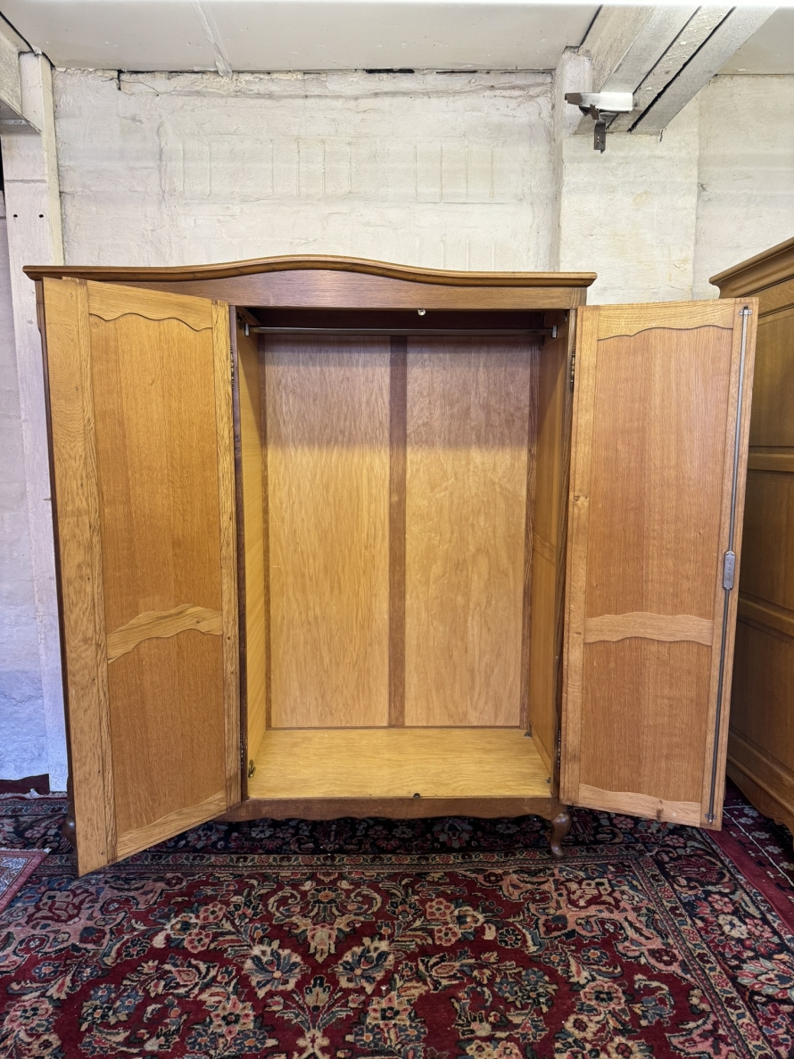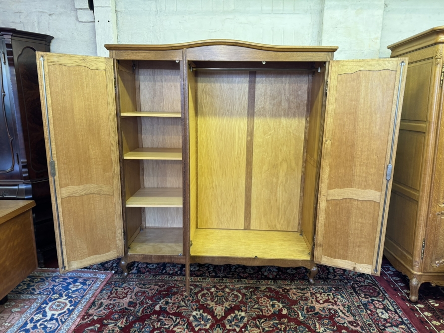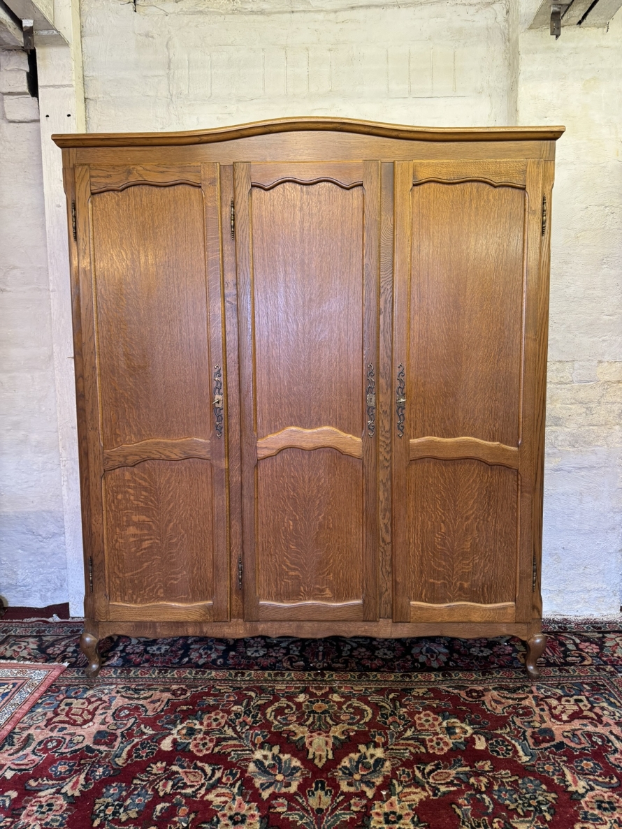 The shaped oversailing top sits above three recessed panelled lockable doors, each door having brass hinges and decorative brass escutcheon. The left-hand door opens to reveal three adjustable and removable shelves, the central door and right-hand door open to reveal a hanging rail. Recessed panelled sides, shaped skirt this fabulous armoire stands on two cabriole shaped legs to the front. Please note this armoire completely splits down for easy transportation and delivery into any home.