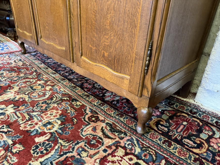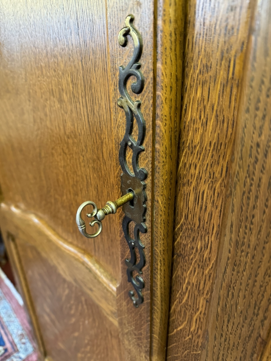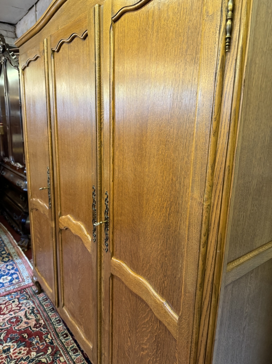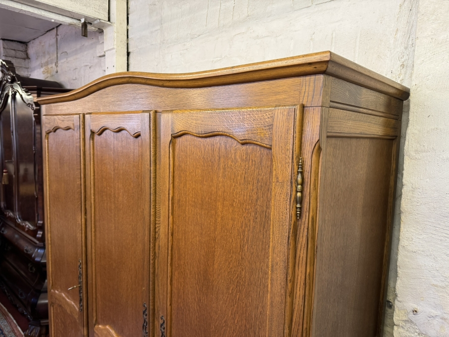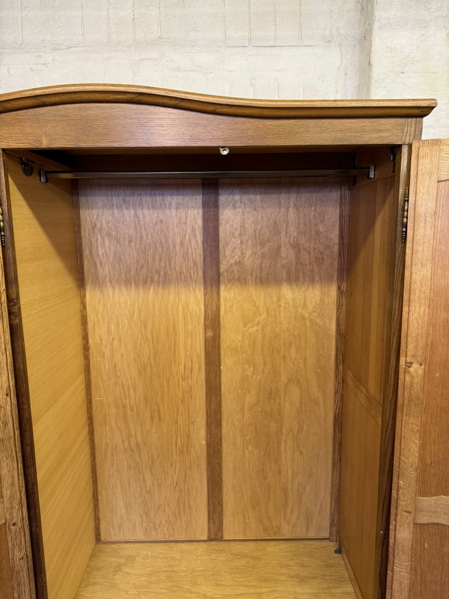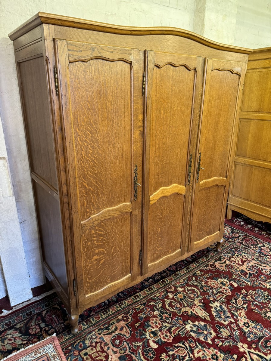 The shaped oversailing top sits above three recessed panelled lockable doors, each door having brass hinges and decorative brass escutcheon. The left-hand door opens to reveal three adjustable and removable shelves, the central door and right-hand door open to reveal a hanging rail. Recessed panelled sides, shaped skirt this fabulous armoire stands on two cabriole shaped legs to the front. Please note this armoire completely splits down for easy transportation and delivery into any home.