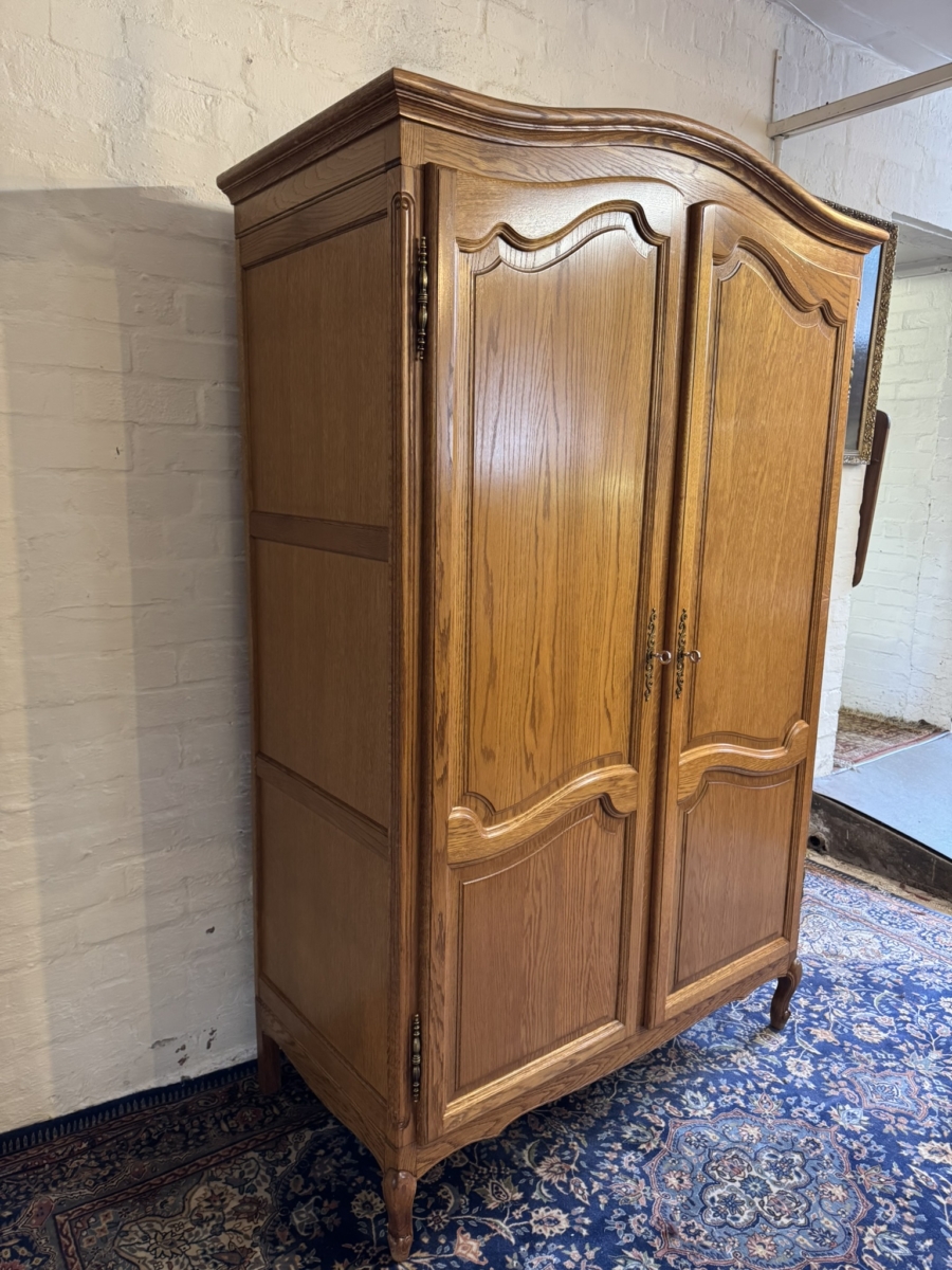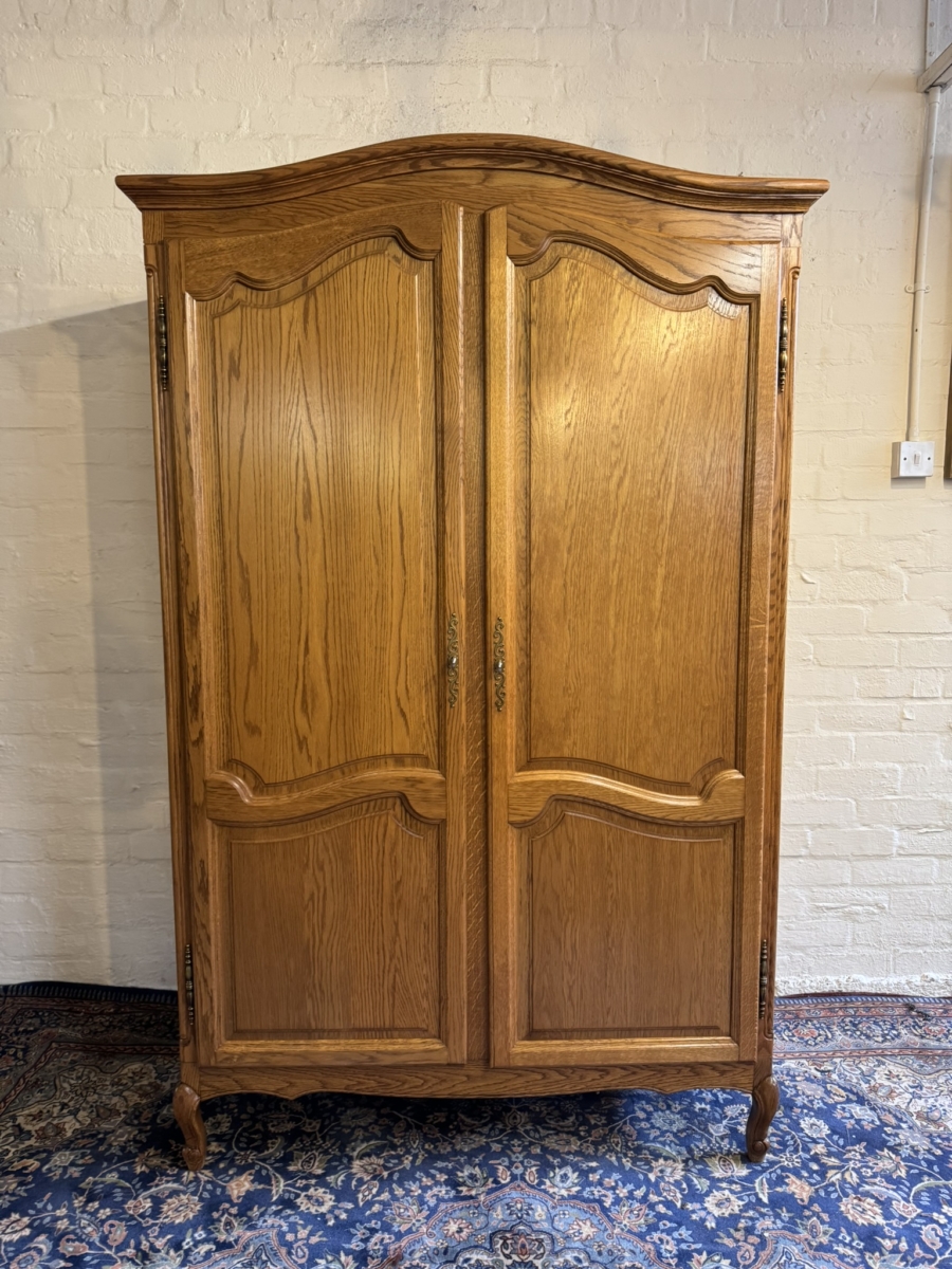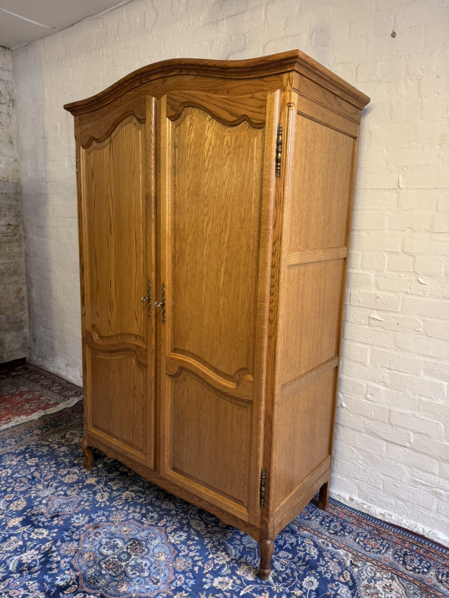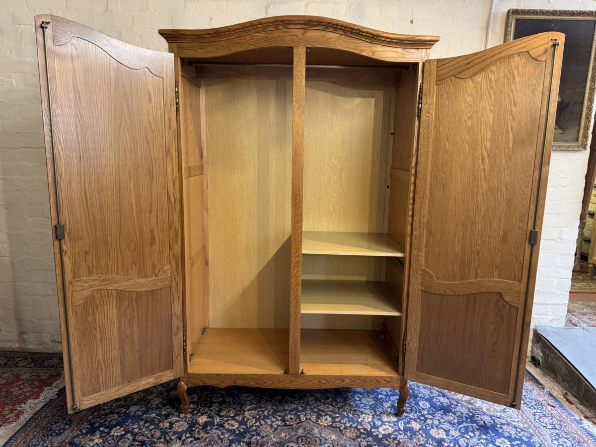 The shaped over sailing top sits above a pair of shaped recessed panelled lockable doors, each door having brass hinges, key and ornate escutcheon. The left-hand door opens to reveal a hanging rail, the right-hand door opens to reveal a hanging rail above two removable shelves. Recessed panelled sides and standing on carved cabriole shaped legs to the front. The armoire is in excellent condition. Please note this armoire completely splits down for easy transportation and delivery into any home.