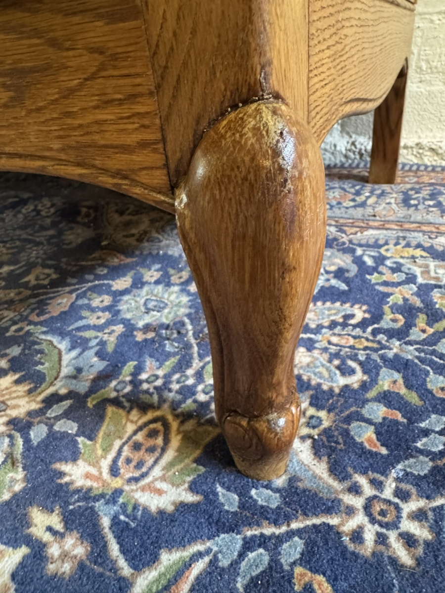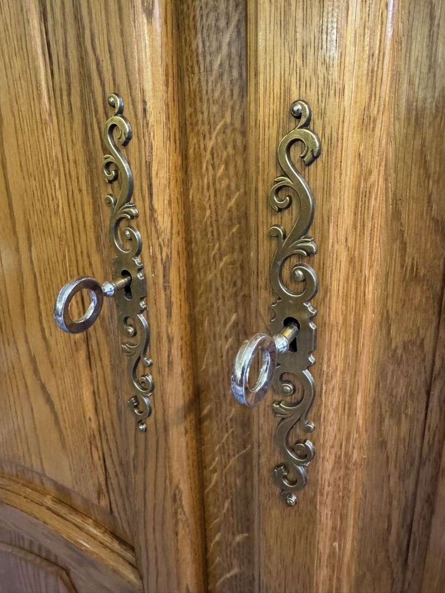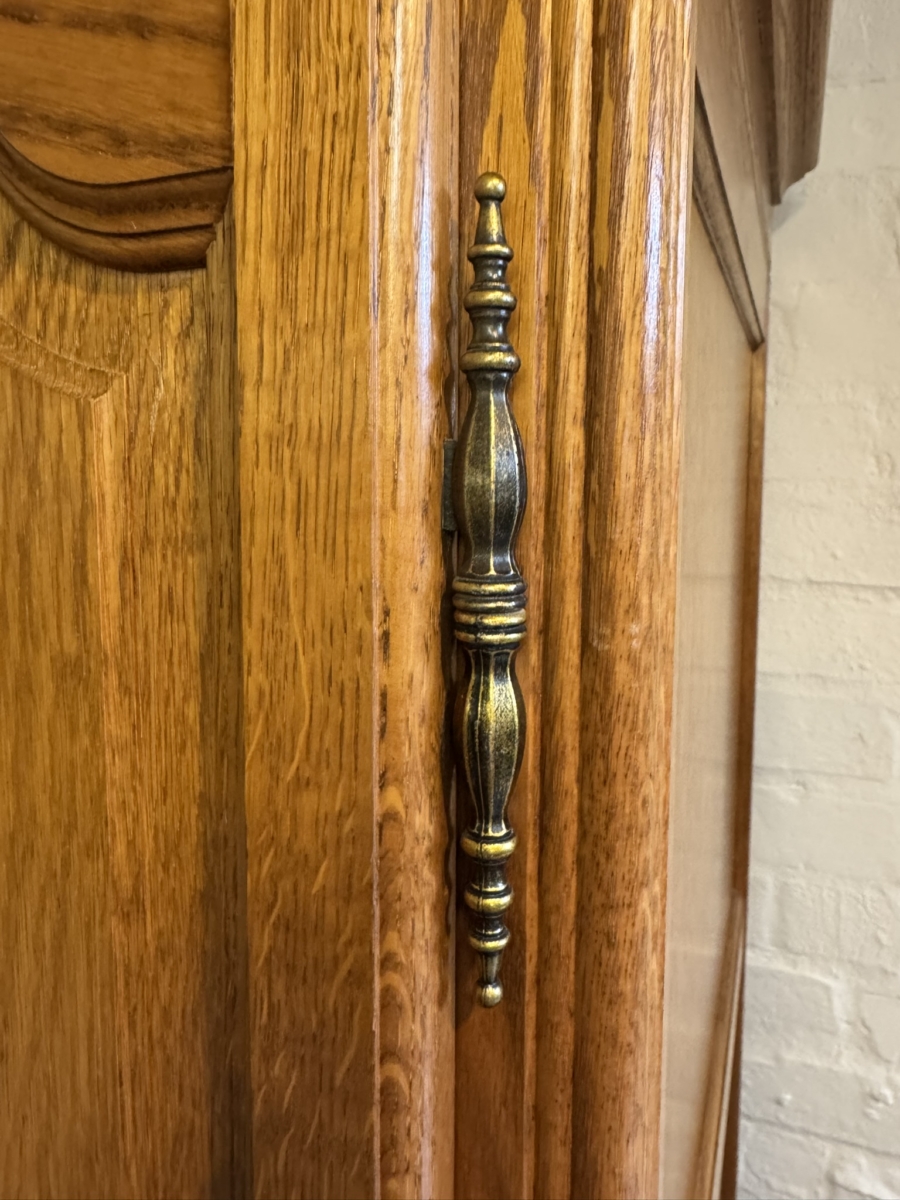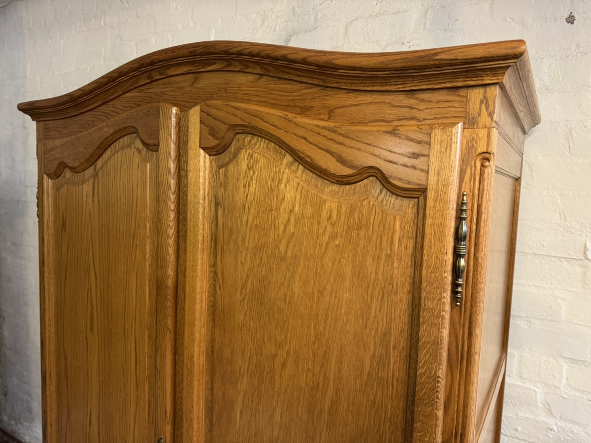 The shaped over sailing top sits above a pair of shaped recessed panelled lockable doors, each door having brass hinges, key and ornate escutcheon. The left-hand door opens to reveal a hanging rail, the right-hand door opens to reveal a hanging rail above two removable shelves. Recessed panelled sides and standing on carved cabriole shaped legs to the front. The armoire is in excellent condition. Please note this armoire completely splits down for easy transportation and delivery into any home.