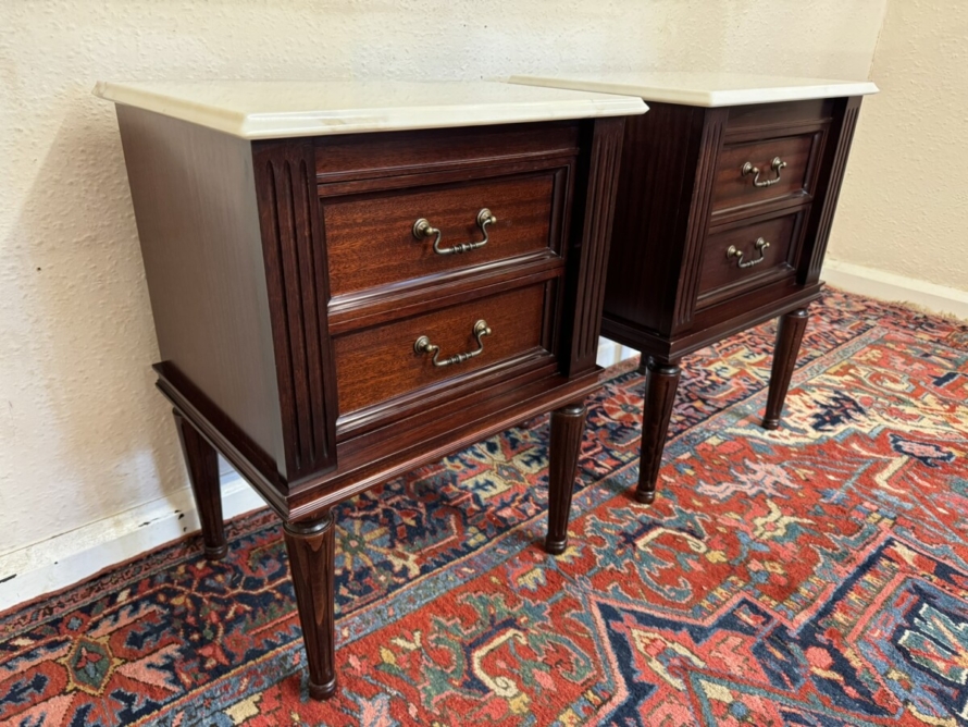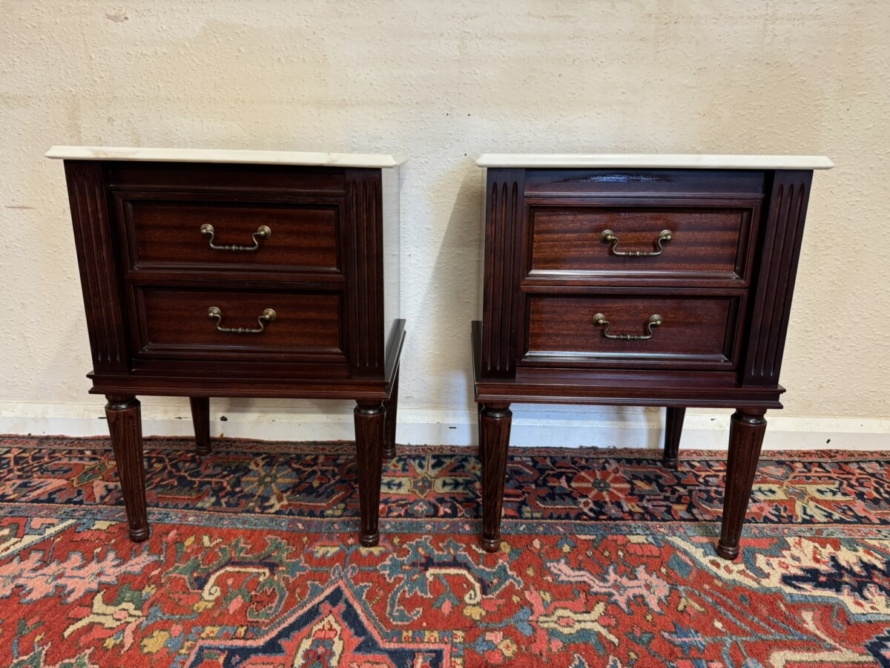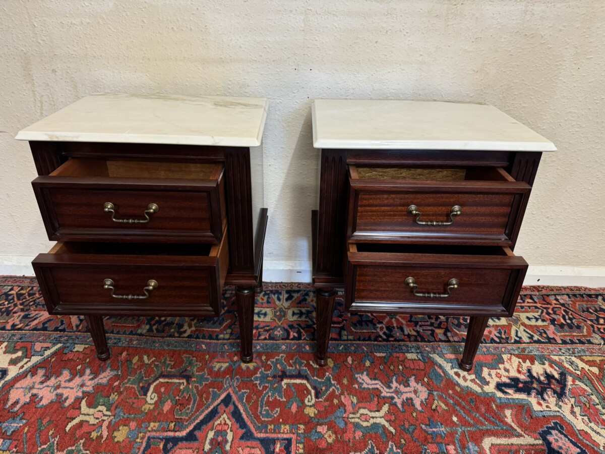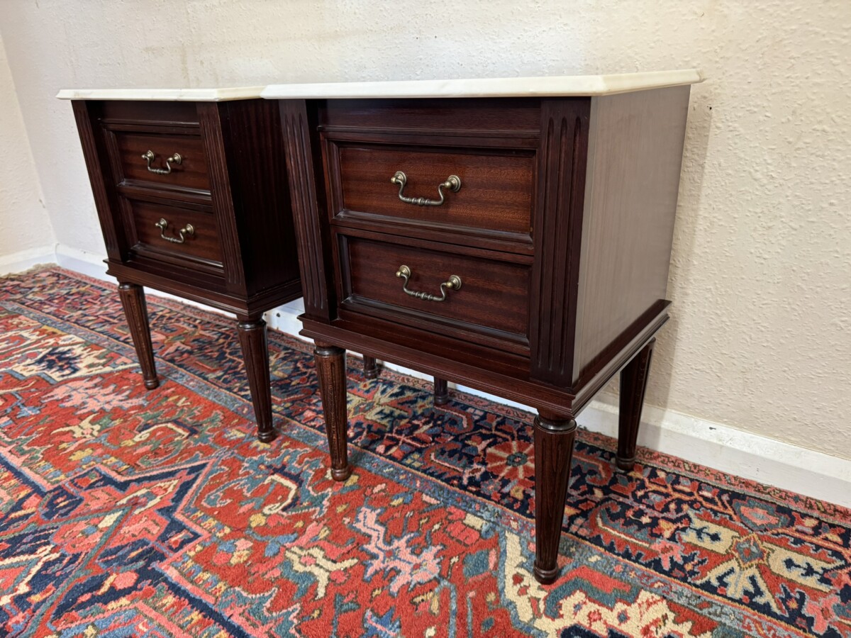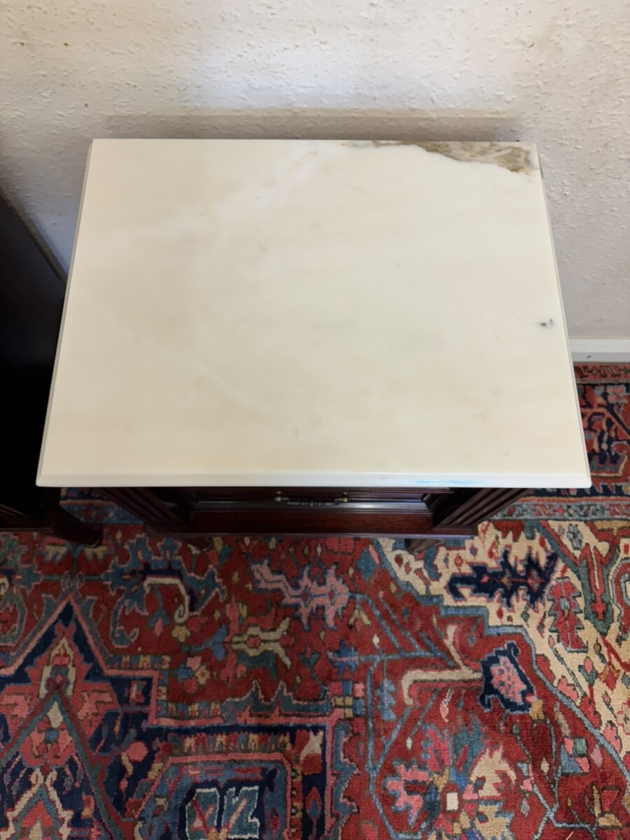 The marble top sits above a pair of drawers, each drawer having a drop handle. Reeded decoration to the sides and standing on four tapered reeded legs on turned feet.