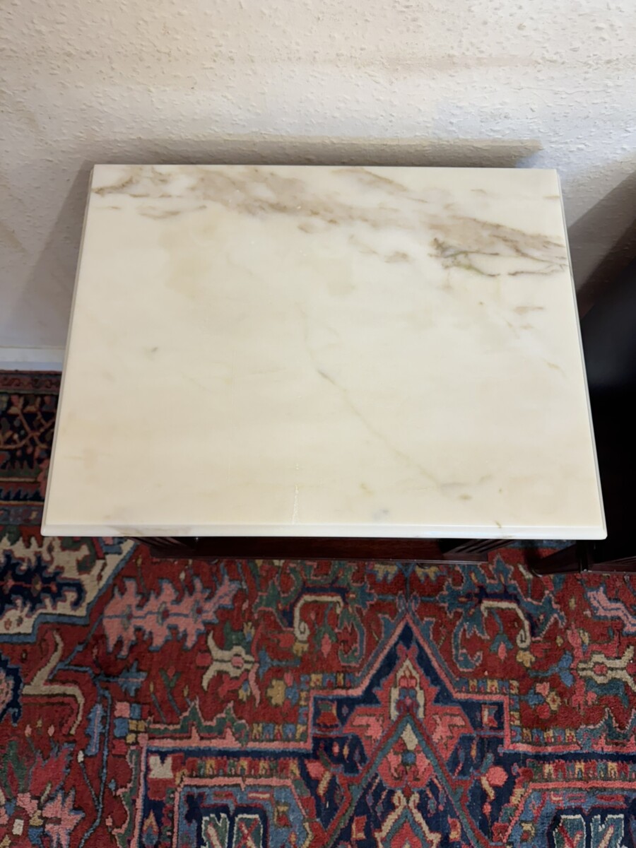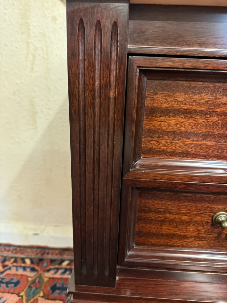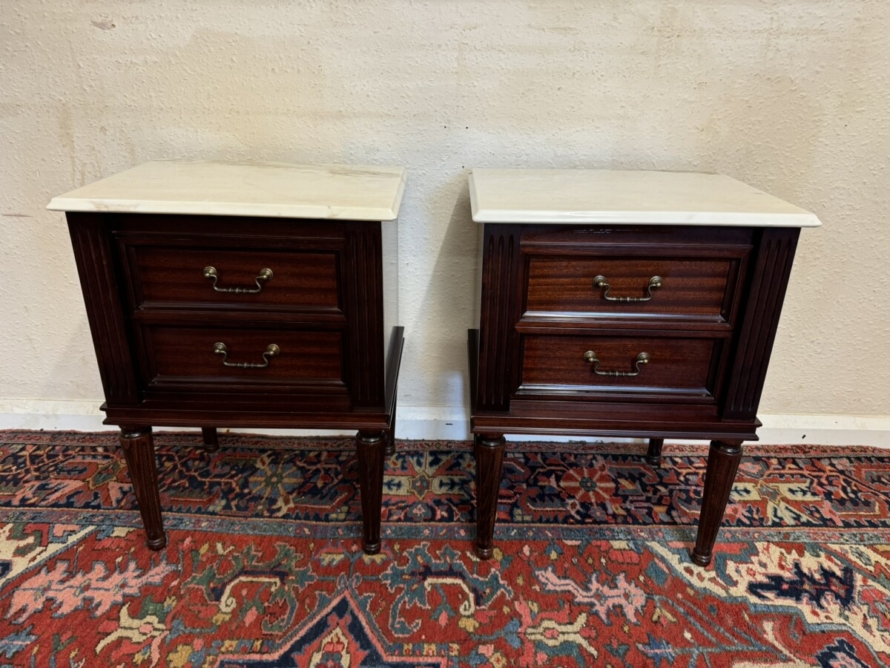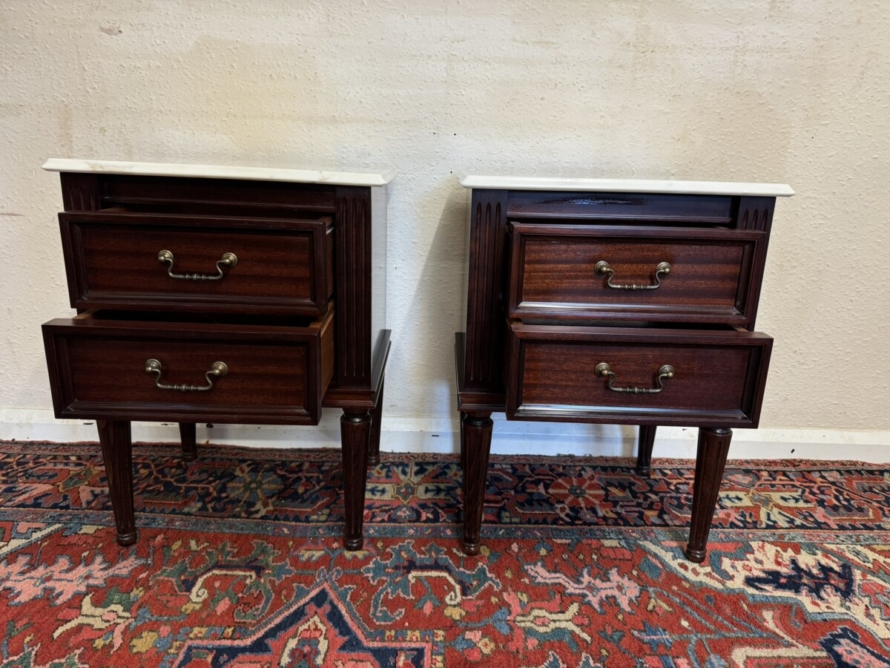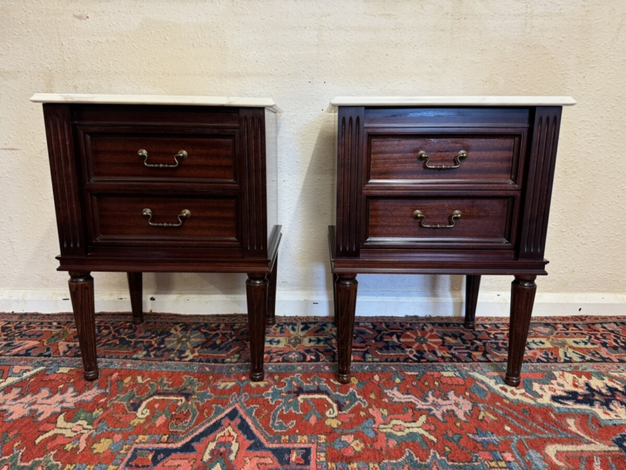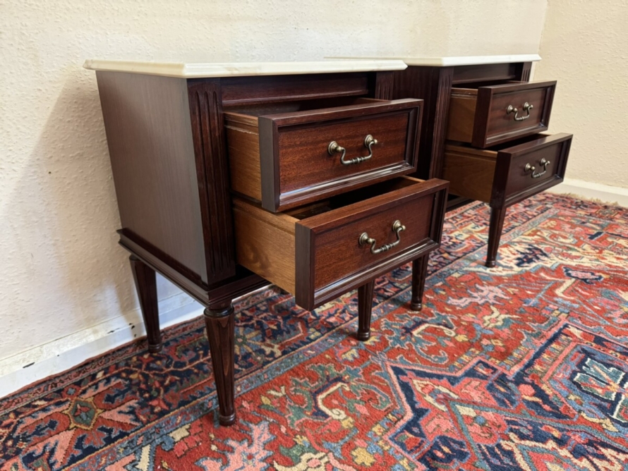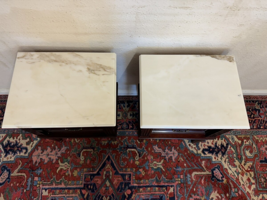 The marble top sits above a pair of drawers, each drawer having a drop handle. Reeded decoration to the sides and standing on four tapered reeded legs on turned feet.