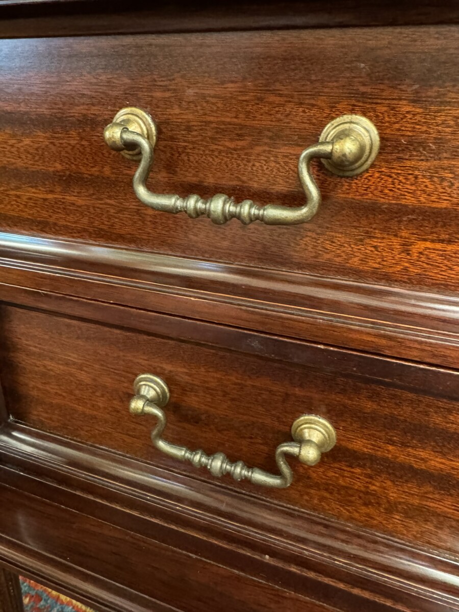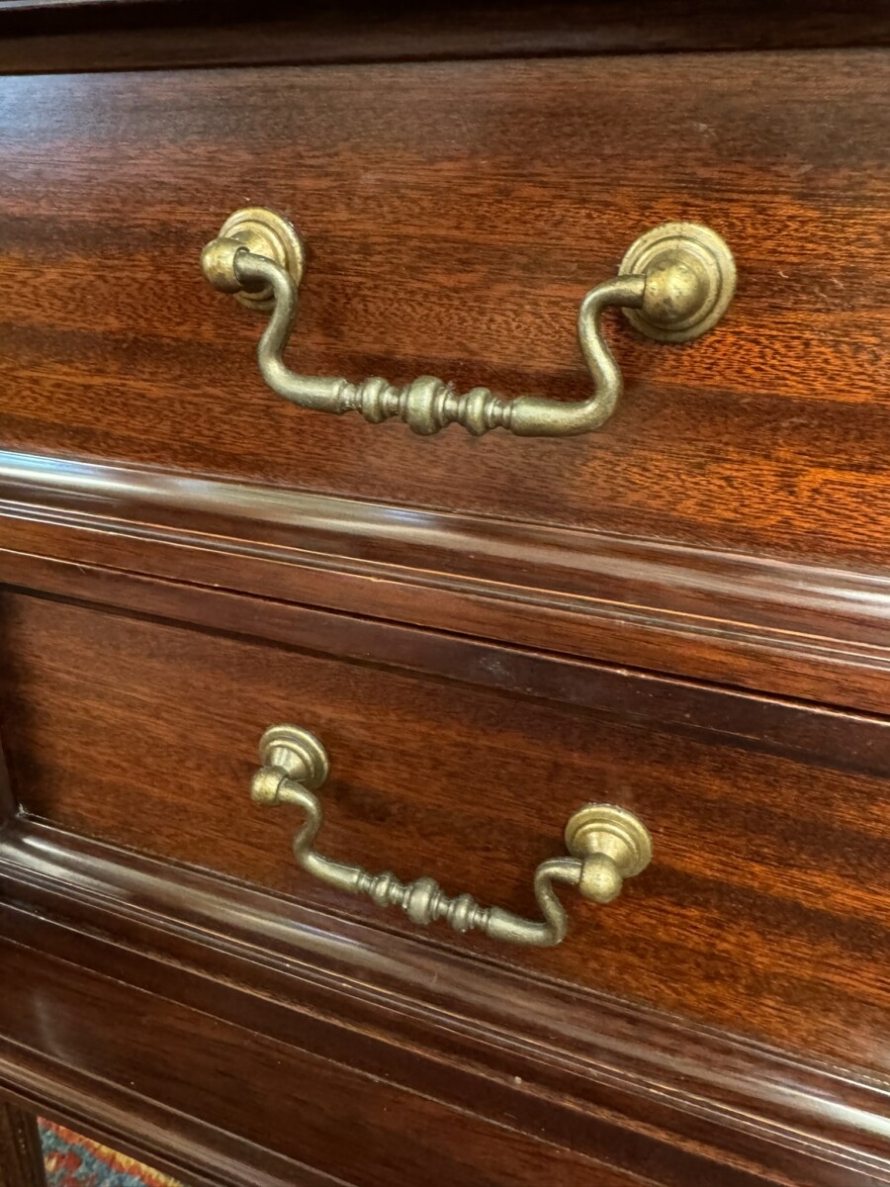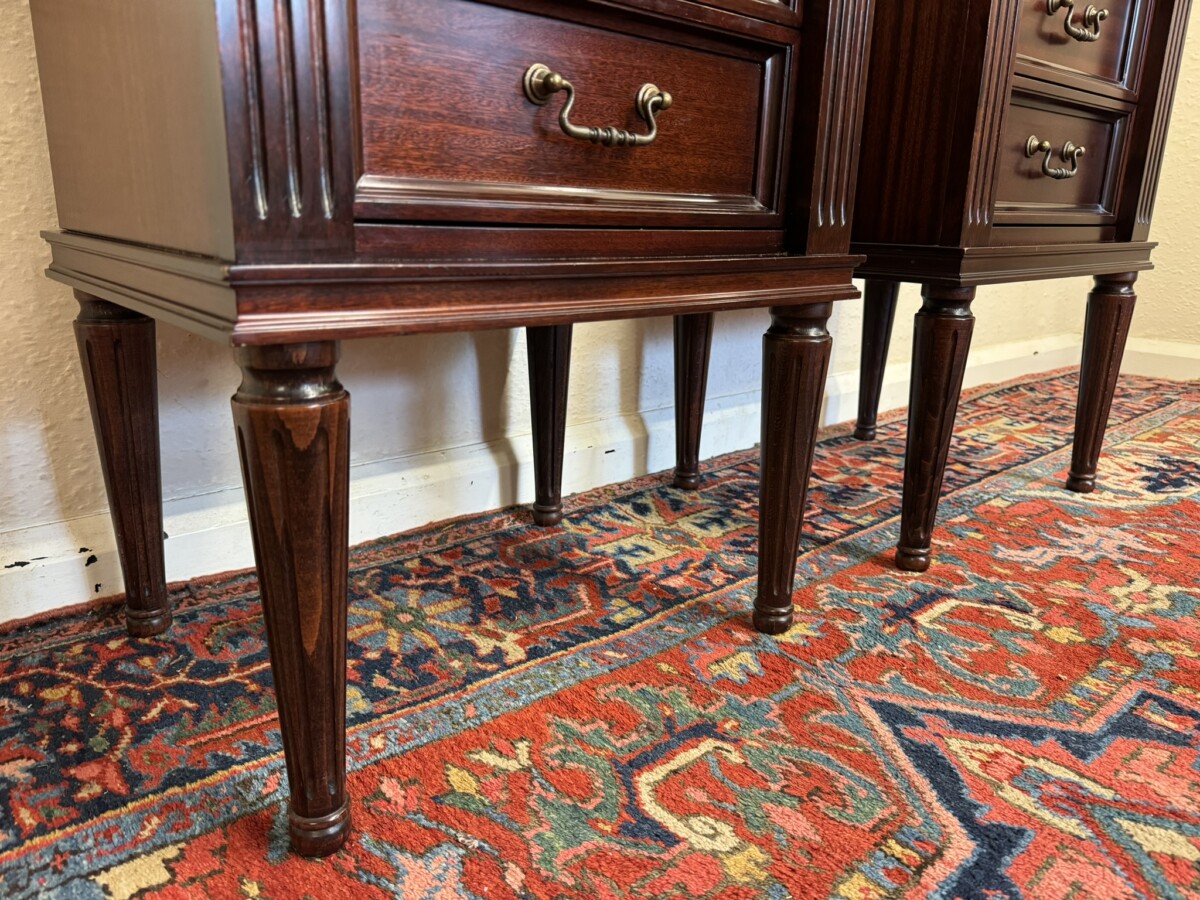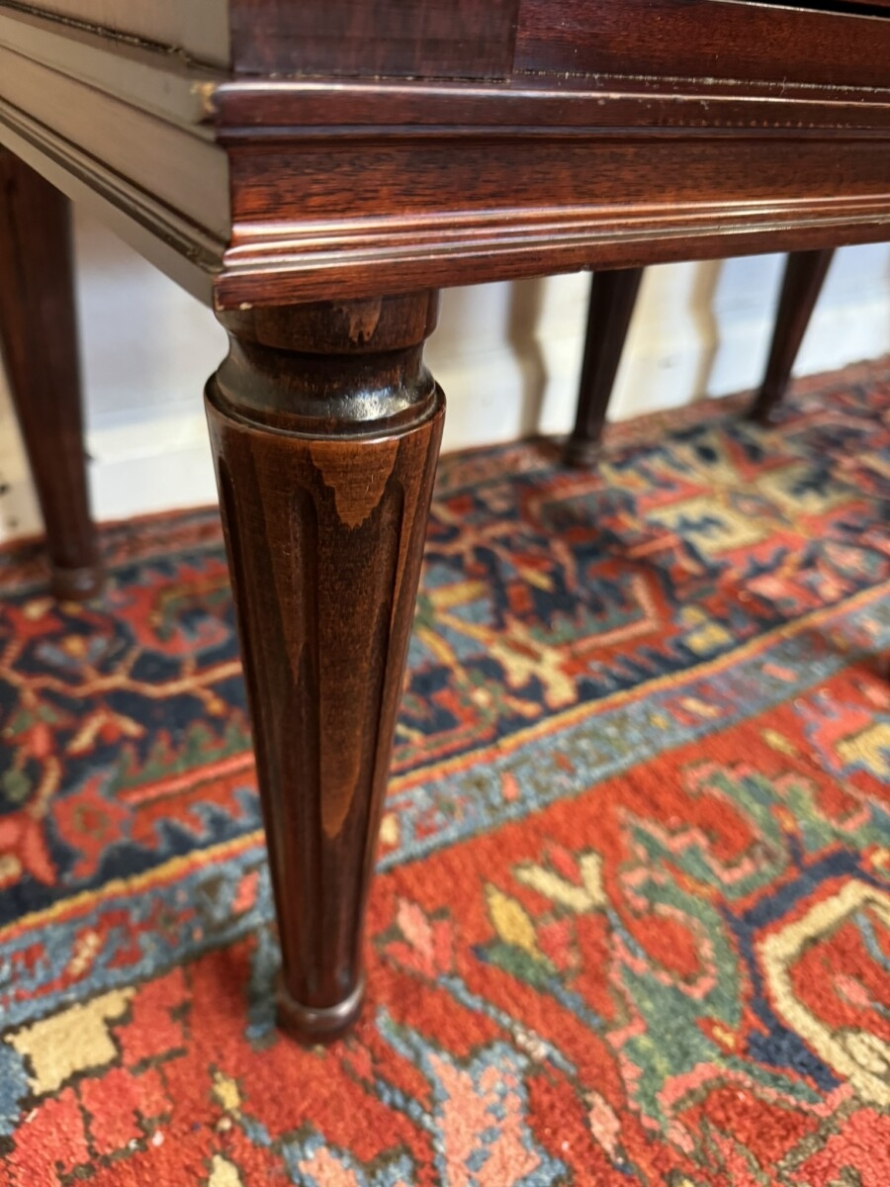 The marble top sits above a pair of drawers, each drawer having a drop handle. Reeded decoration to the sides and standing on four tapered reeded legs on turned feet.