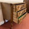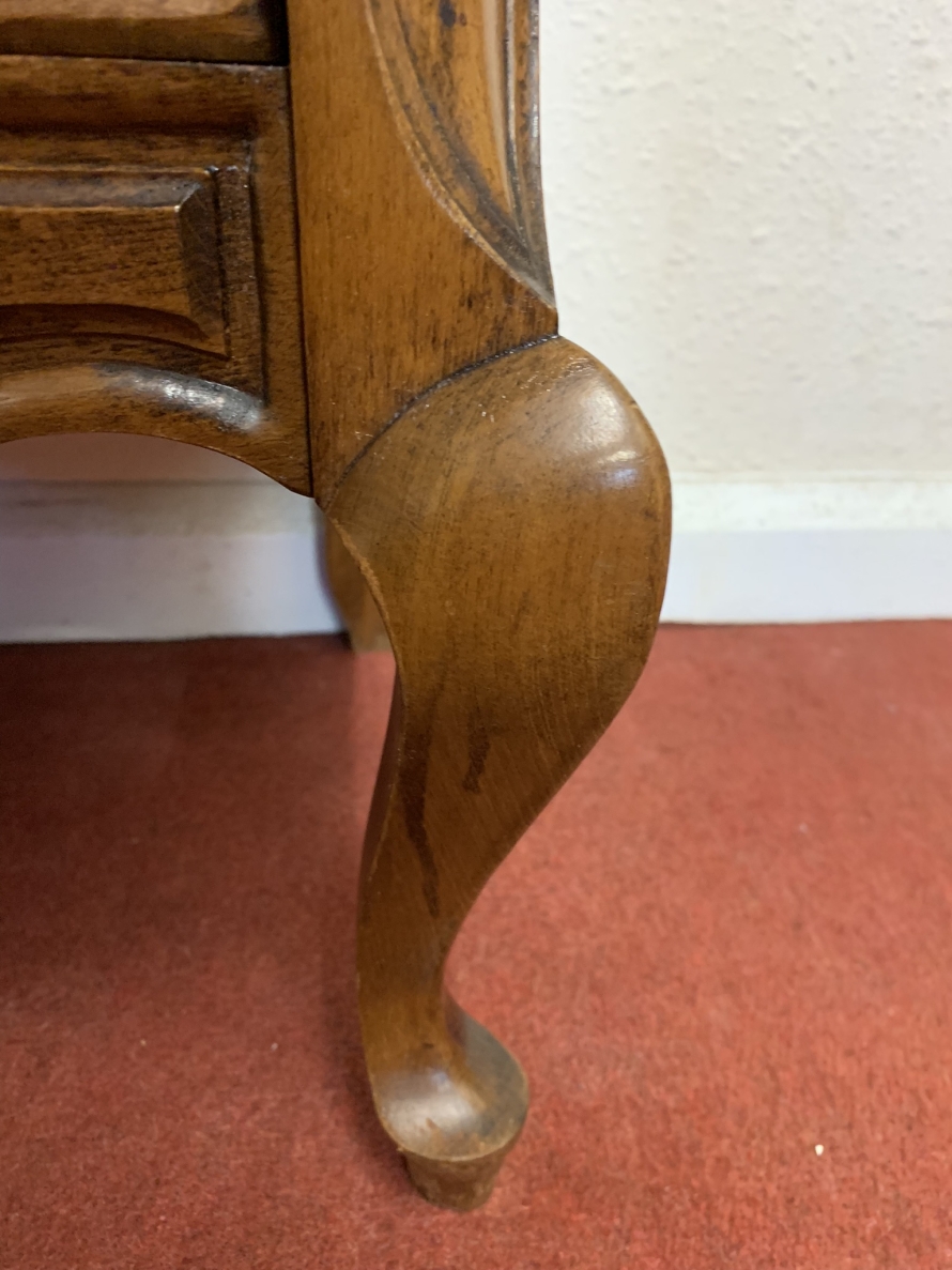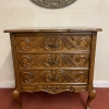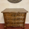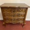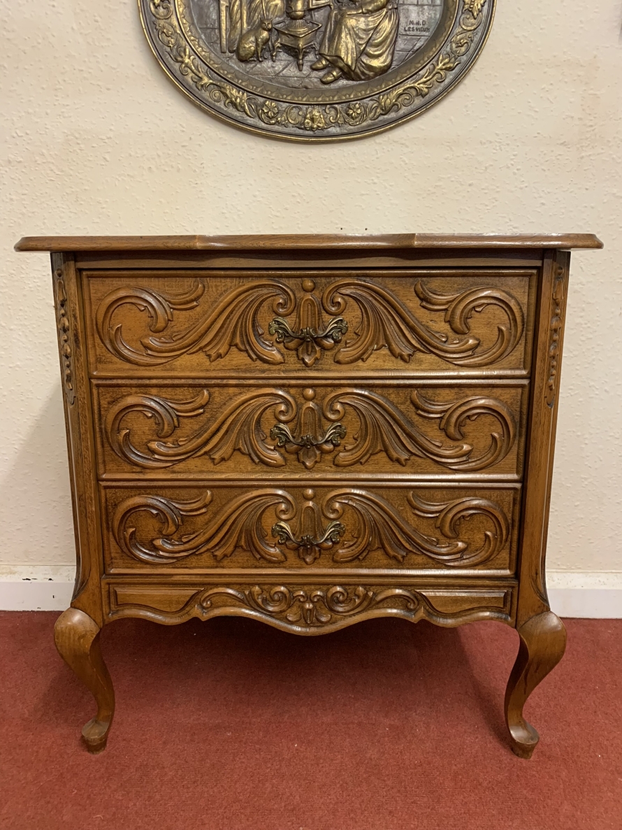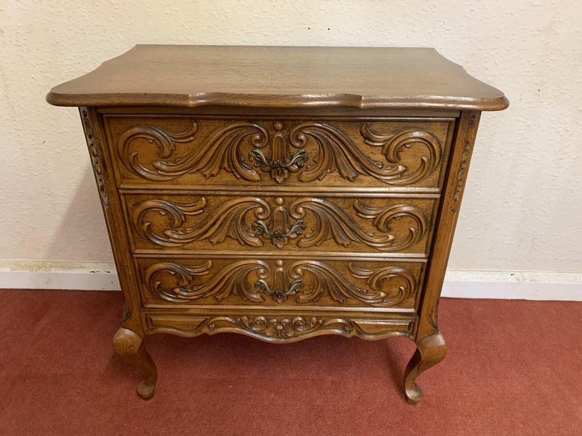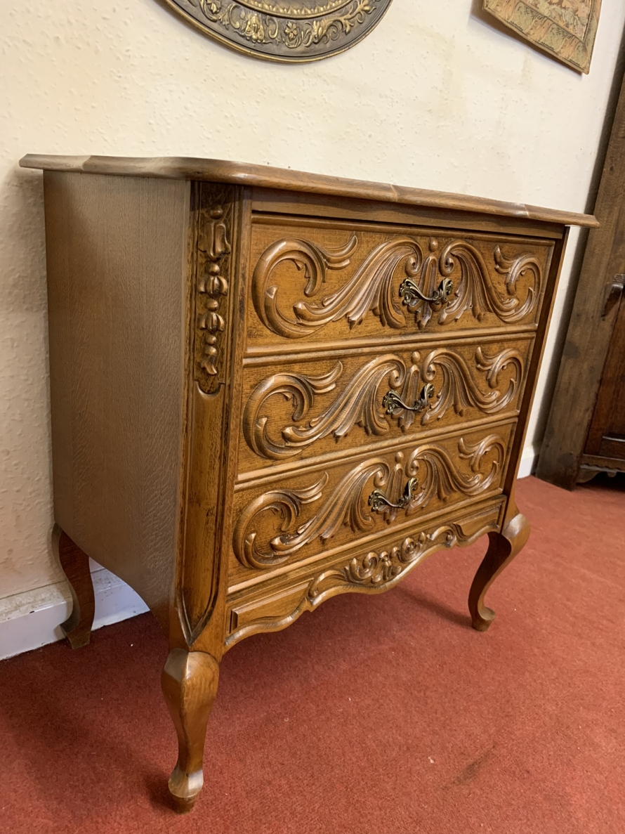 The shaped oversailing top sits above three fabulous carved drawers, each drawer having an ornate brass handle. Canted carved sides, shaped skirt with decorative central carving this sweet commode/chest stands on four cabriole shaped legs.