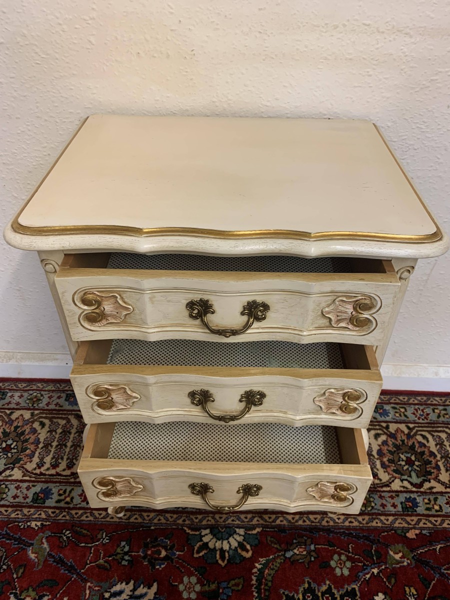- Fabulous French Shaped Cream And Gilt Chest Of Three Drawers – Now Sold