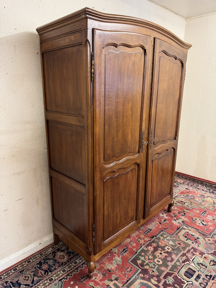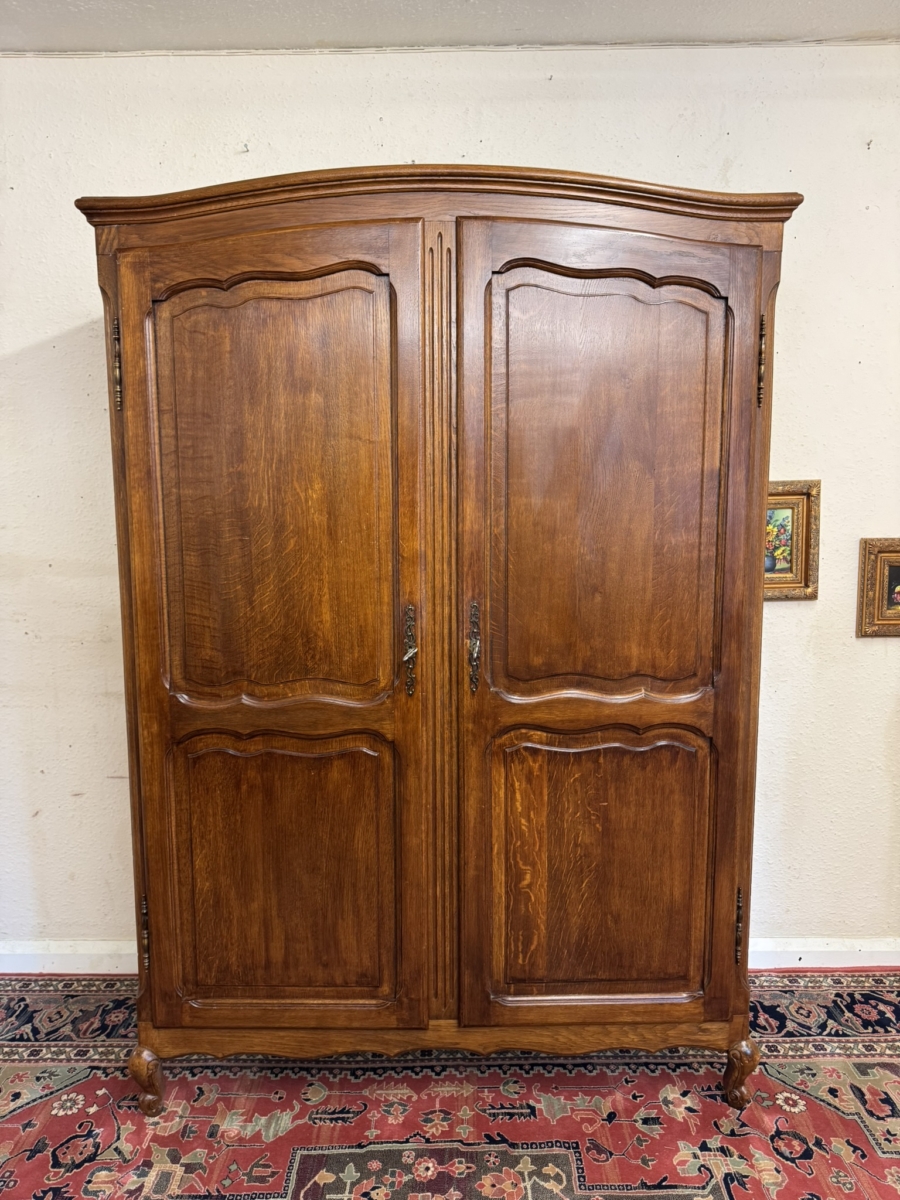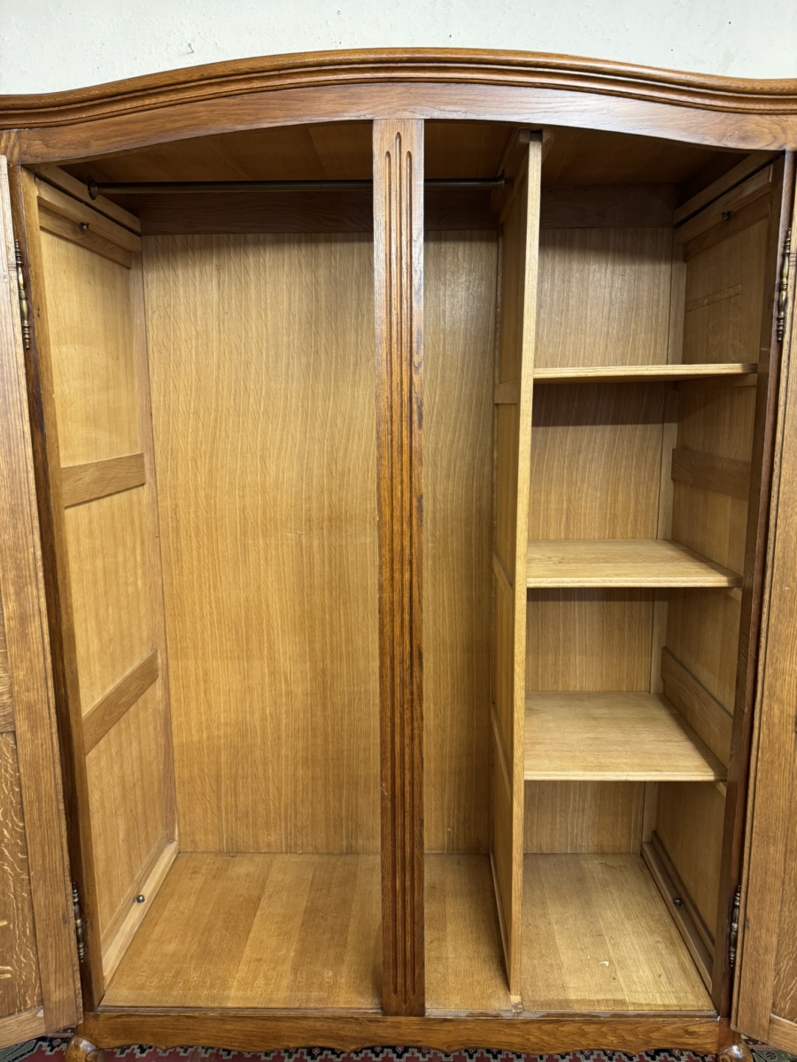 The curved top sits above a pair of lockable shaped recessed panelled doors, each door has brass hinges, brass escutcheon and key. The left-hand door opens to reveal a hanging rail, the right-hand door opens to reveal three removable shelves. Recessed panelled sides shaped skirt and standing on carved cabriole shaped legs to the front. Please note this armoire completely splits down for easy delivery into any home.