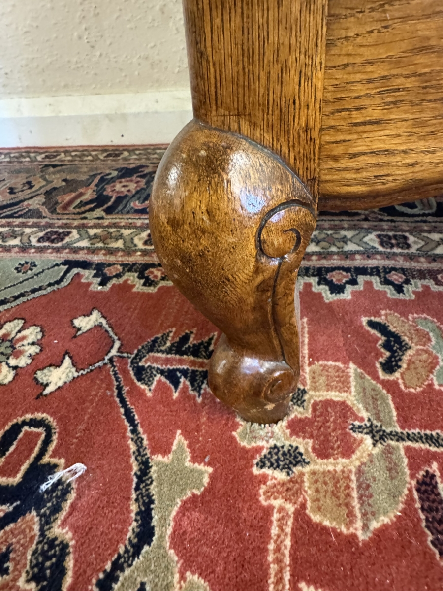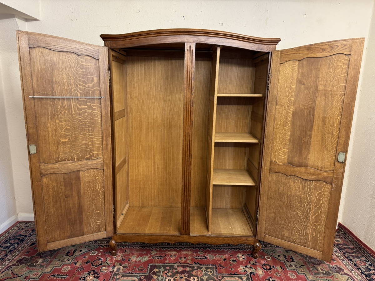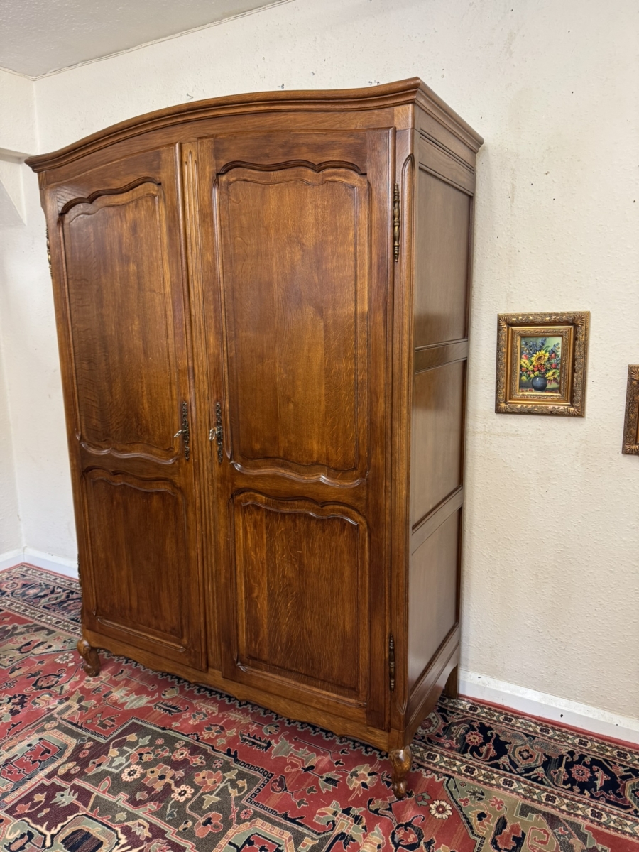The curved top sits above a pair of lockable shaped recessed panelled doors, each door has brass hinges, brass escutcheon and key. The left-hand door opens to reveal a hanging rail, the right-hand door opens to reveal three removable shelves. Recessed panelled sides shaped skirt and standing on carved cabriole shaped legs to the front. Please note this armoire completely splits down for easy delivery into any home.