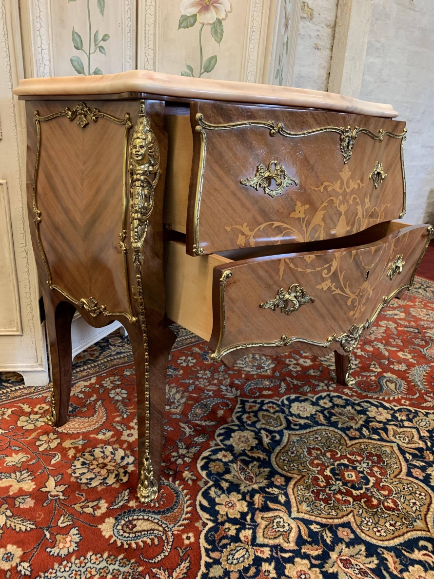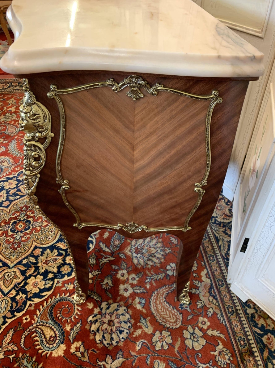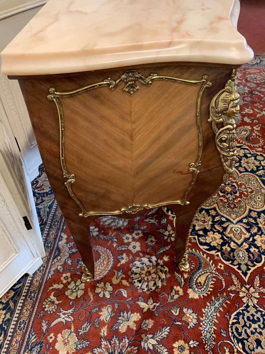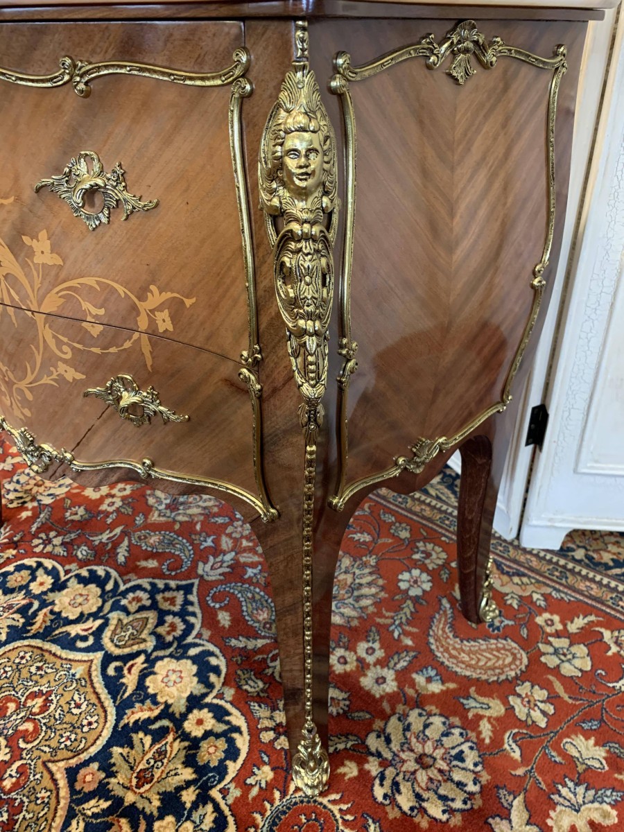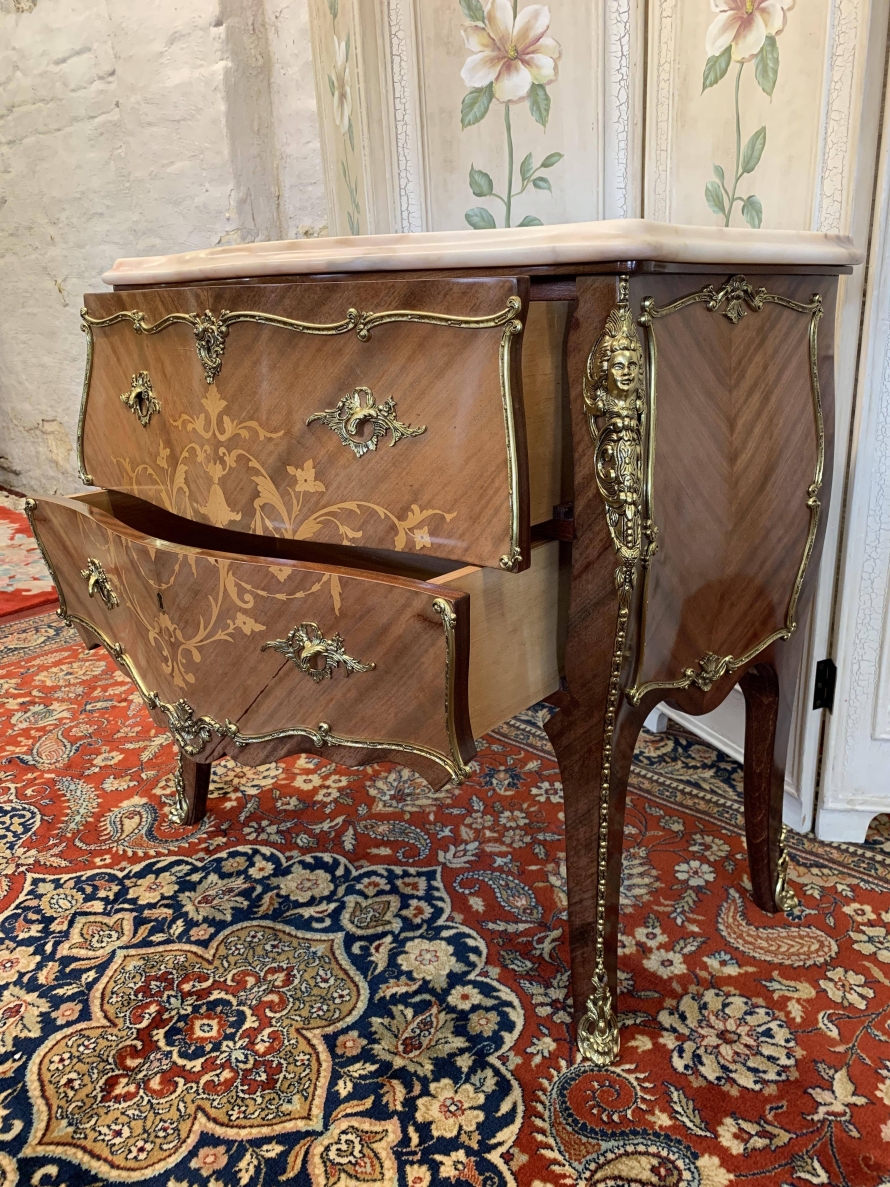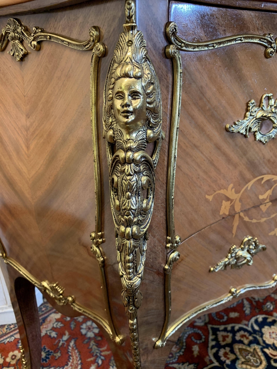 The shaped marble top sits above two shaped drawers, the drawers have marquetry inlay decoration, two ornate ormolu handles with shaped ormolu edging. The shaped sides also have a decorative ormolu edging with ormolu carvings to the top of each leg and to the front.