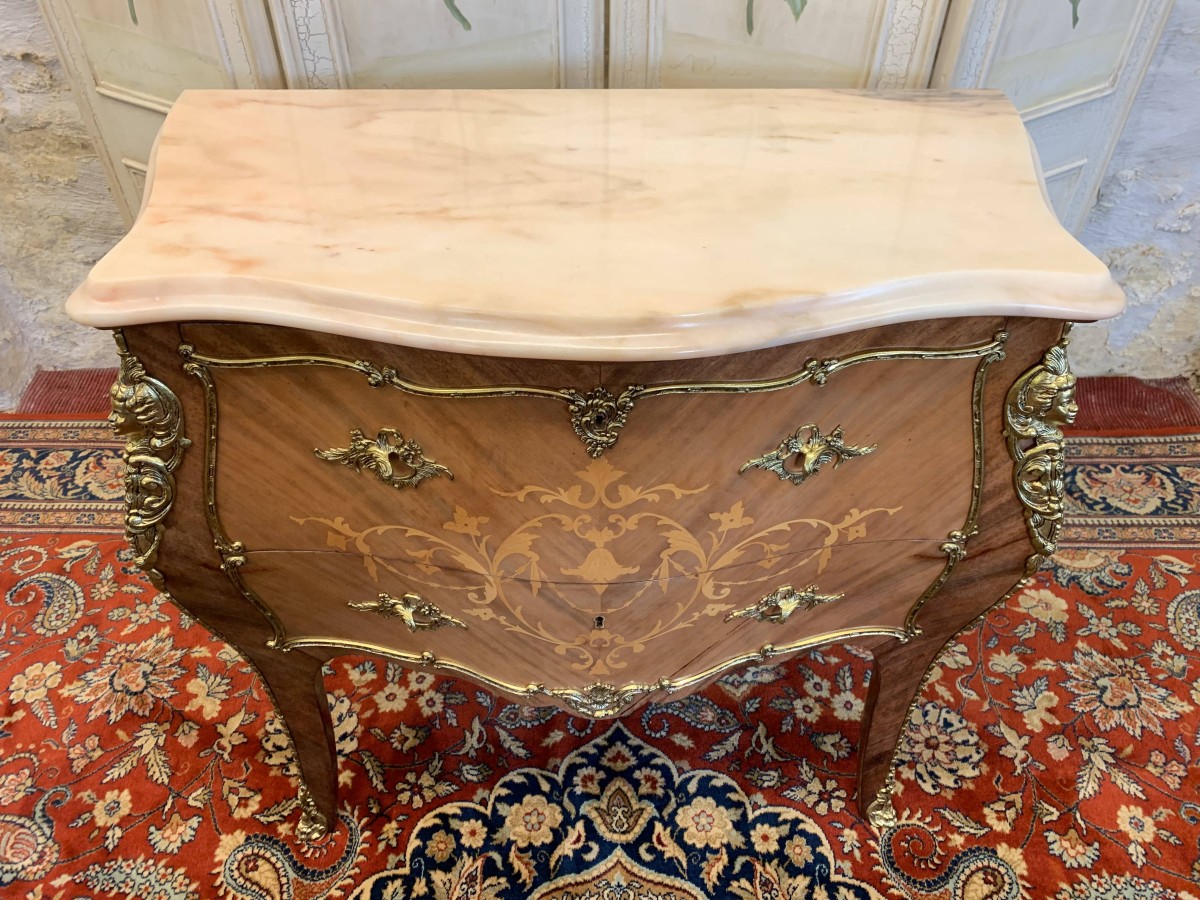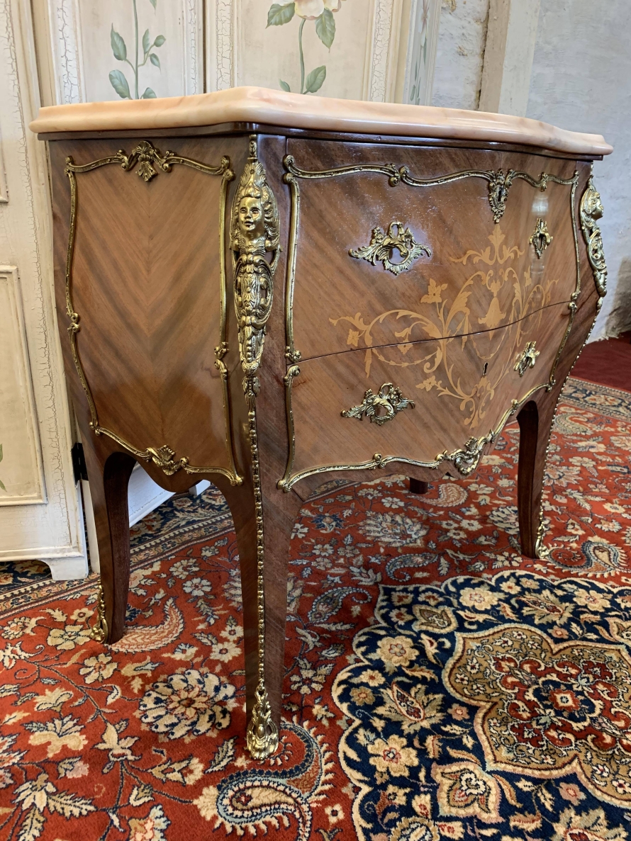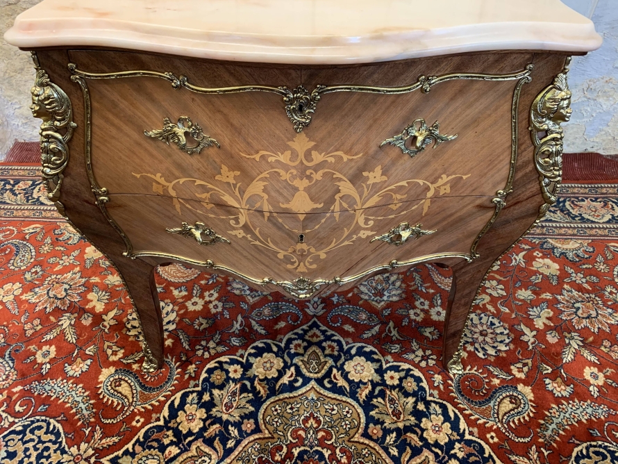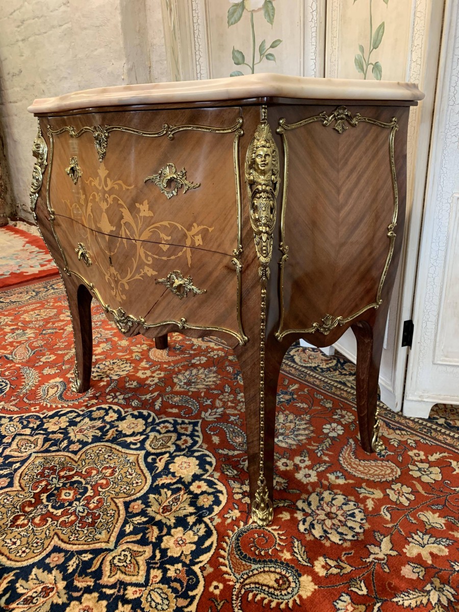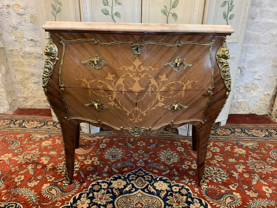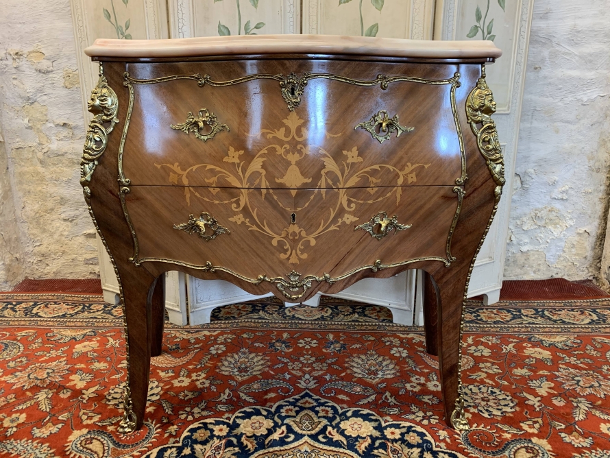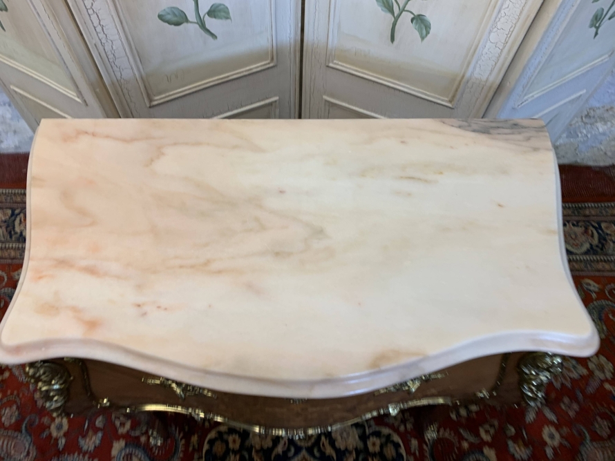The shaped marble top sits above two shaped drawers, the drawers have marquetry inlay decoration, two ornate ormolu handles with shaped ormolu edging. The shaped sides also have a decorative ormolu edging with ormolu carvings to the top of each leg and to the front.