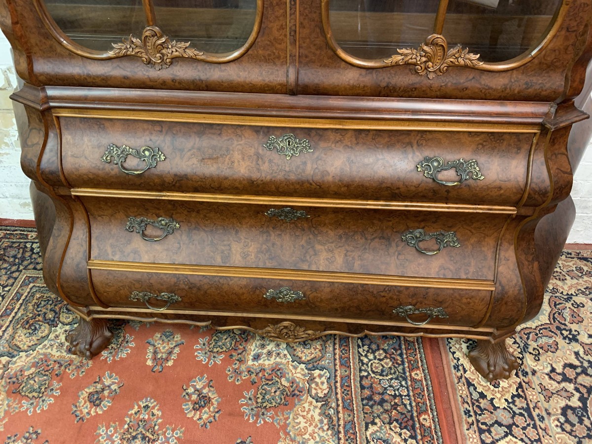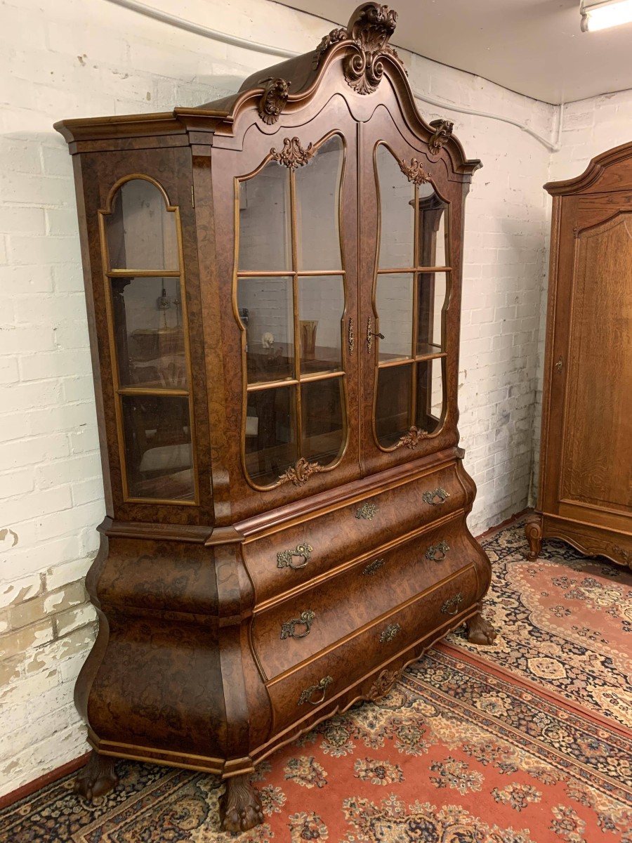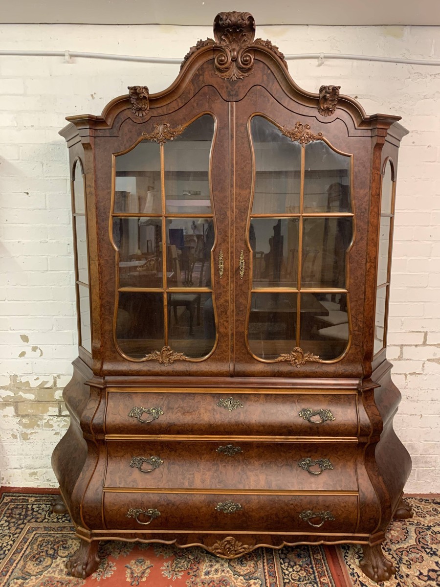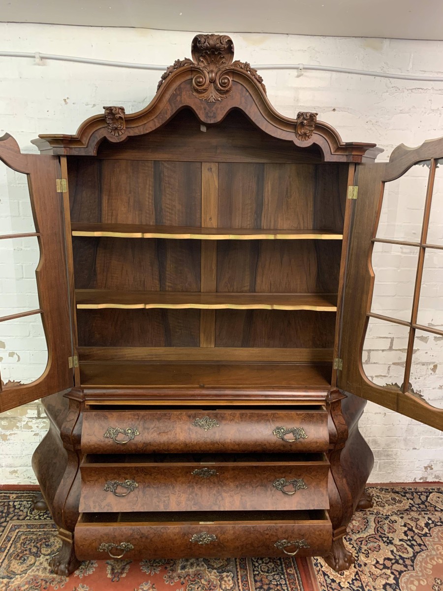 The top rises to a highly impressive central carving. Below are a pair of shaped lockable doors, each with wood barring and fine carvings to the top and bottom of the door. The doors open to reveal two removable shaped shelves. The canted sides of the top section are also glazed. The Bombe shaped base has three drawers, each drawer having a pair of decorative brass handles and brass escutcheon. Beautifully shaped sides, shaped skirt, with central carving, this outstanding item of French furniture stands proud on four ball and claw feet.