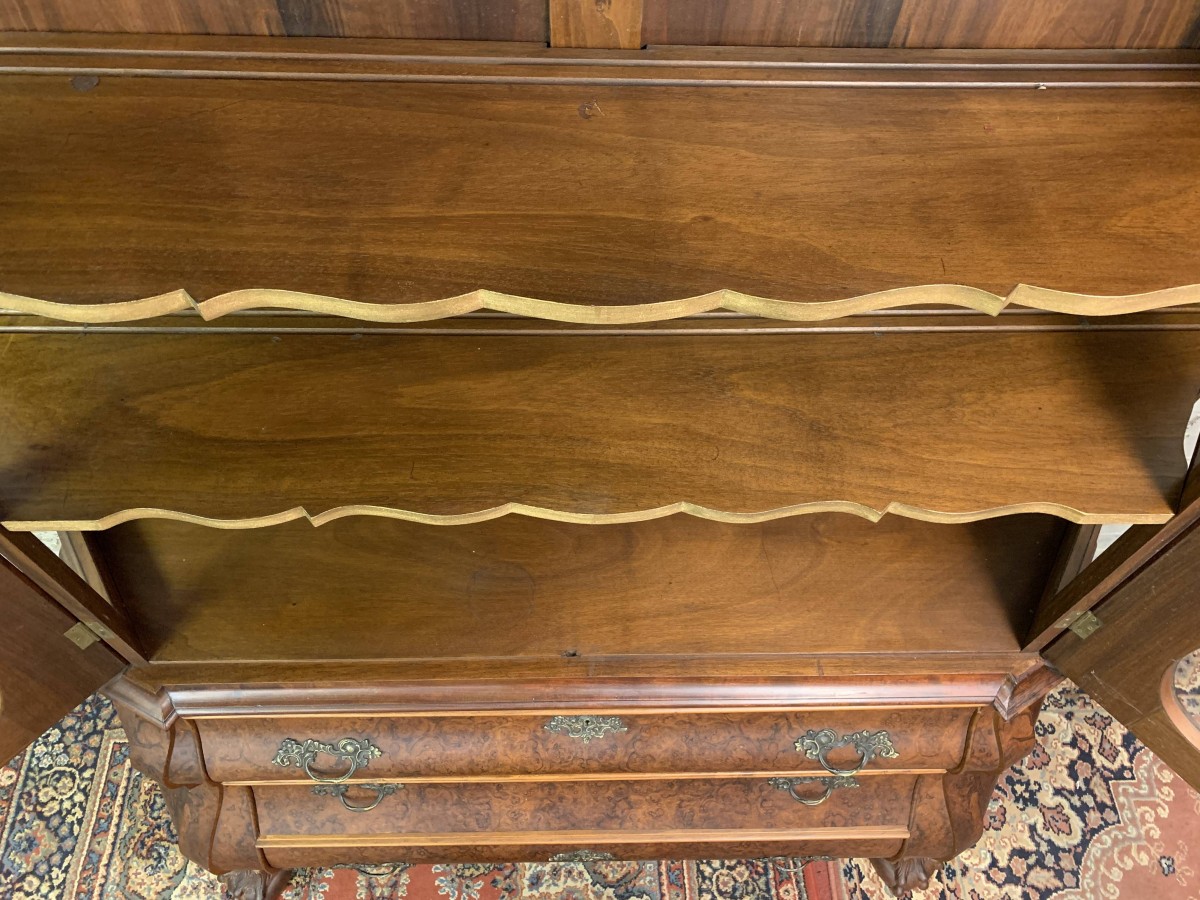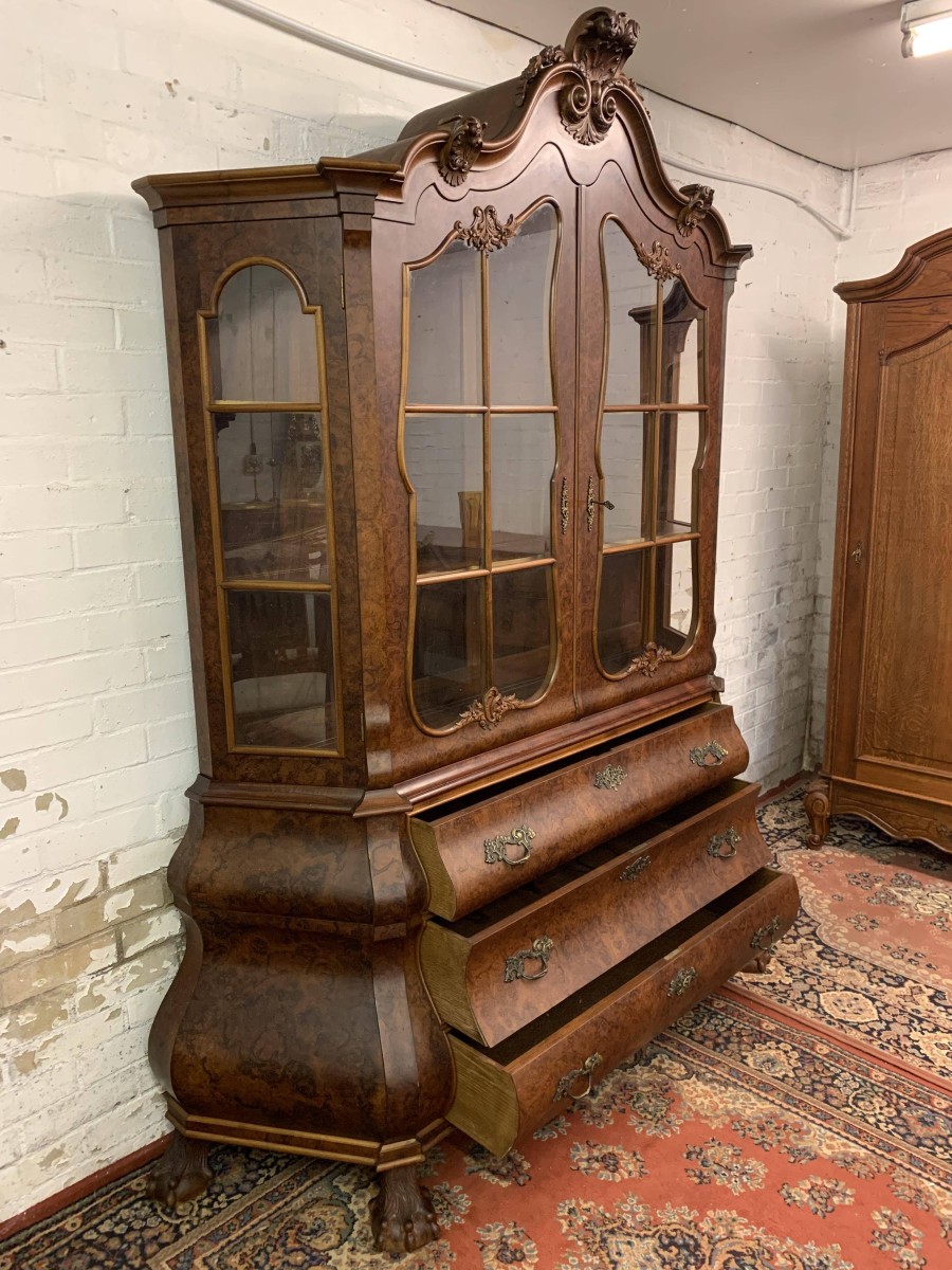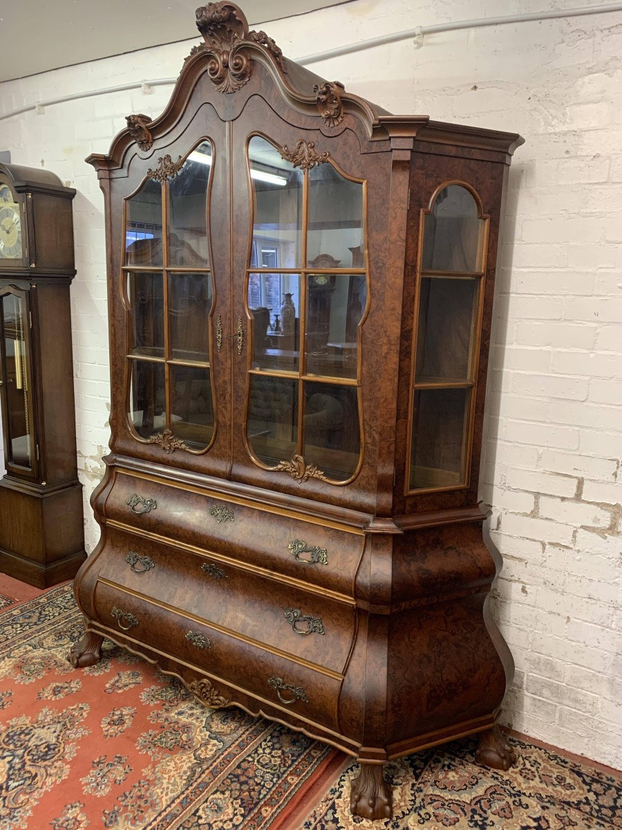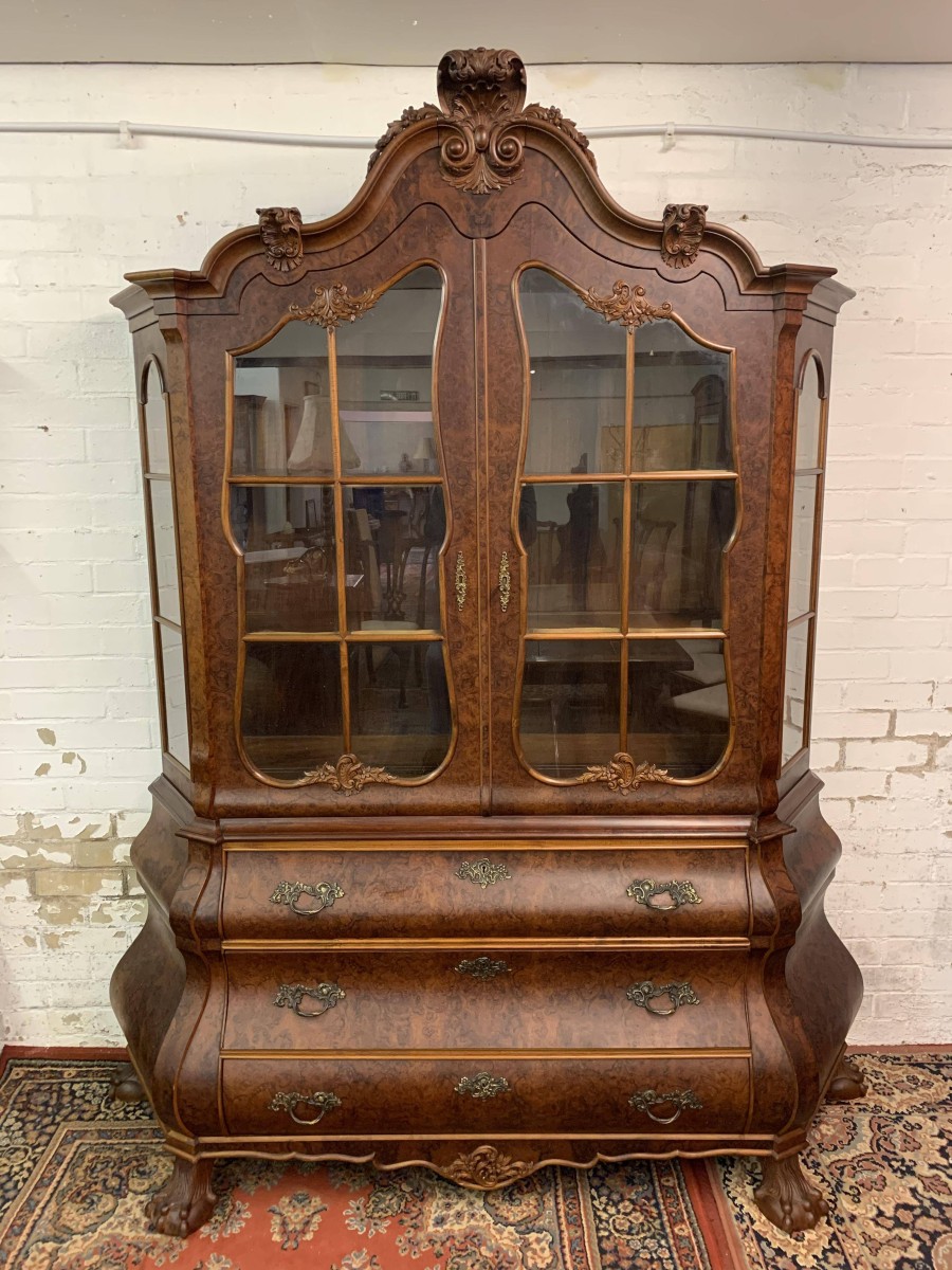 The top rises to a highly impressive central carving. Below are a pair of shaped lockable doors, each with wood barring and fine carvings to the top and bottom of the door. The doors open to reveal two removable shaped shelves. The canted sides of the top section are also glazed. The Bombe shaped base has three drawers, each drawer having a pair of decorative brass handles and brass escutcheon. Beautifully shaped sides, shaped skirt, with central carving, this outstanding item of French furniture stands proud on four ball and claw feet.