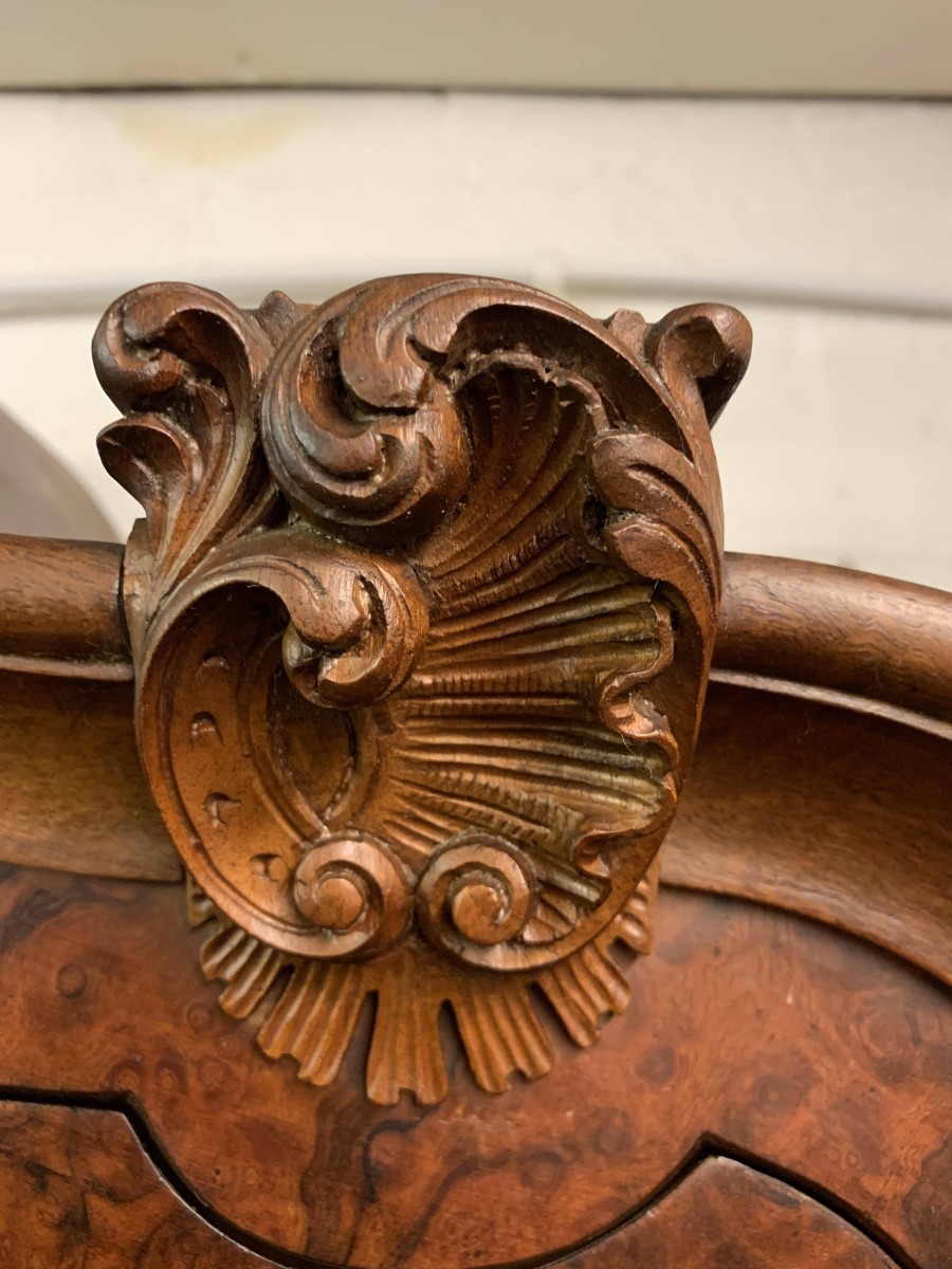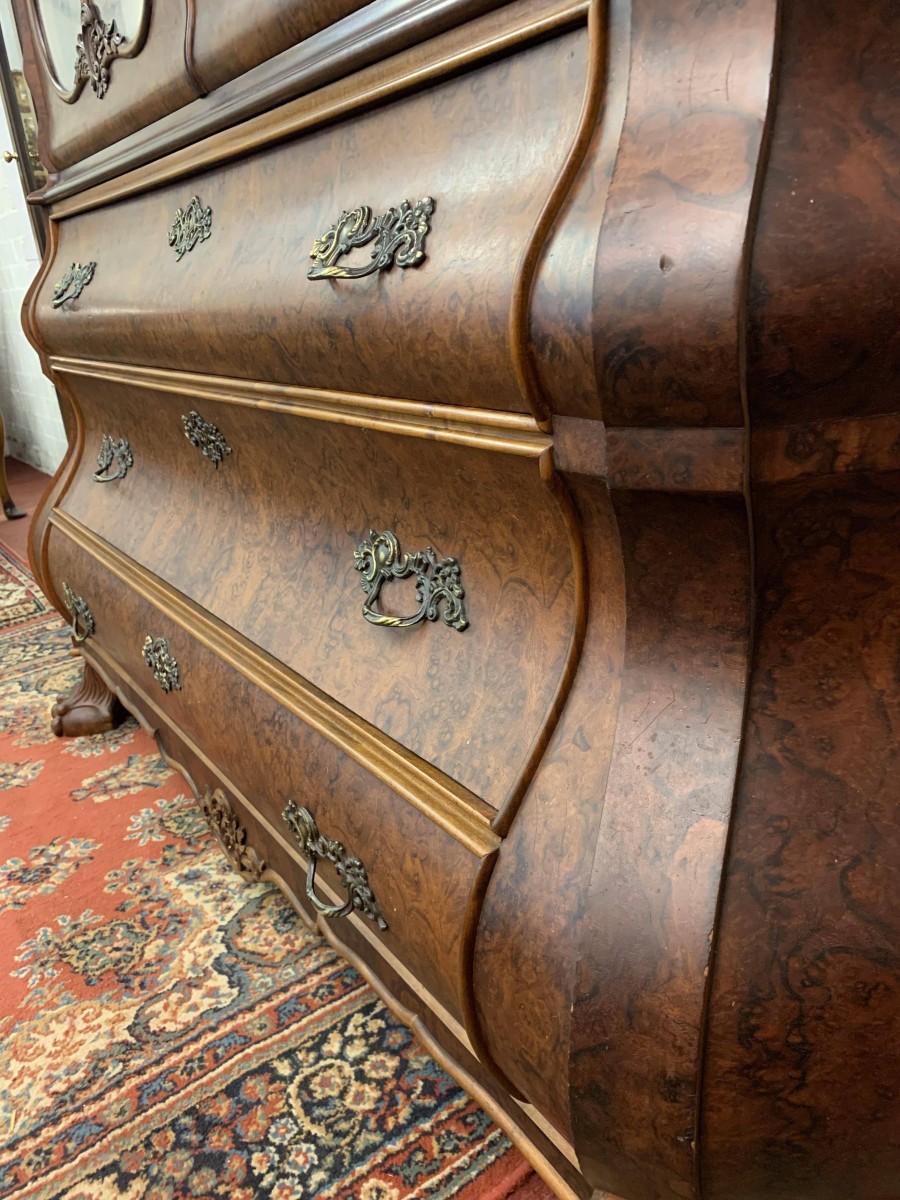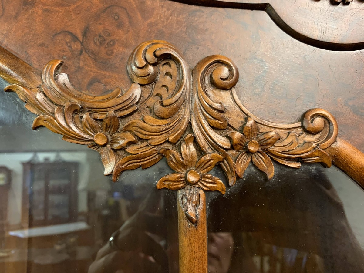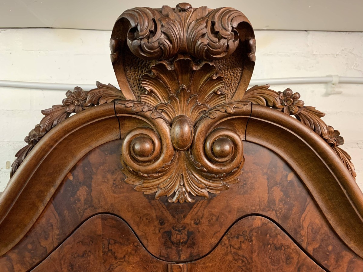 The top rises to a highly impressive central carving. Below are a pair of shaped lockable doors, each with wood barring and fine carvings to the top and bottom of the door. The doors open to reveal two removable shaped shelves. The canted sides of the top section are also glazed. The Bombe shaped base has three drawers, each drawer having a pair of decorative brass handles and brass escutcheon. Beautifully shaped sides, shaped skirt, with central carving, this outstanding item of French furniture stands proud on four ball and claw feet.