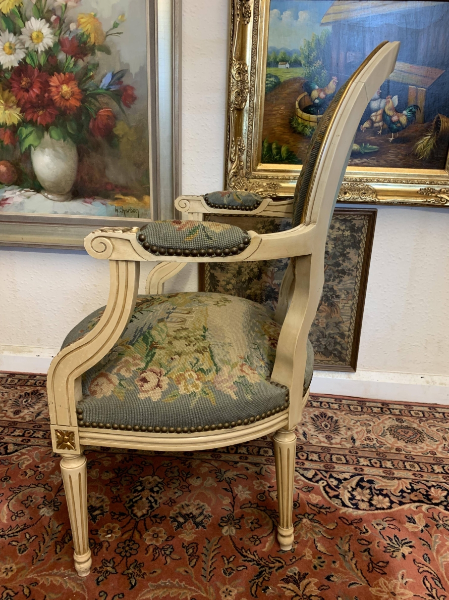 This stylish chair is in excellent condition. This white and gilt decorated shaped chair has a needlepoint cushioned back, seat and armrests. This fabulous chair stands on four reeded carved legs.