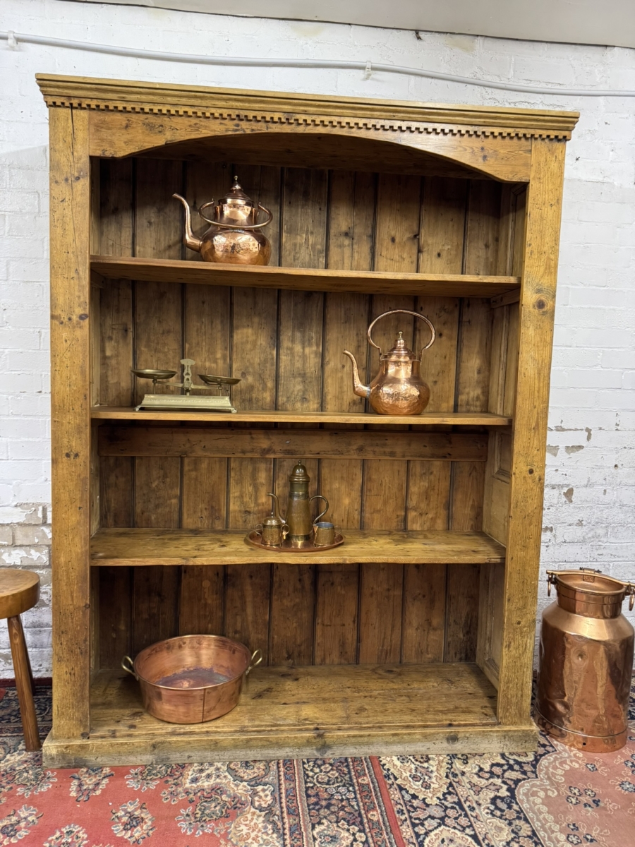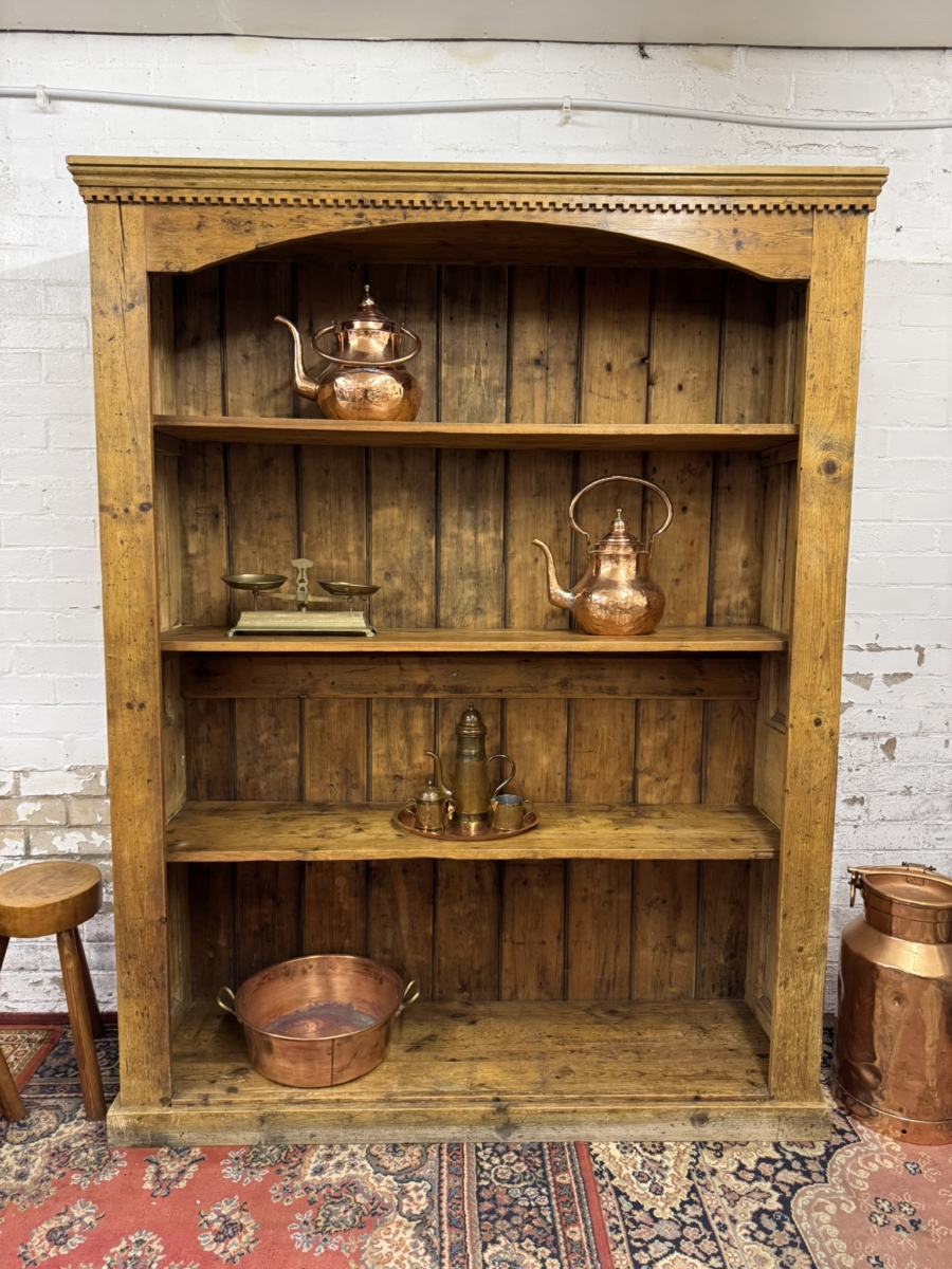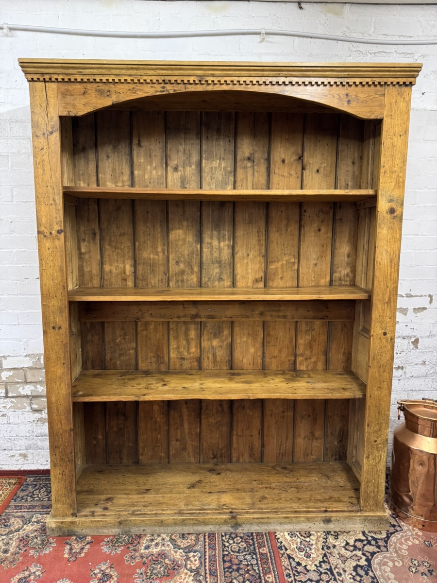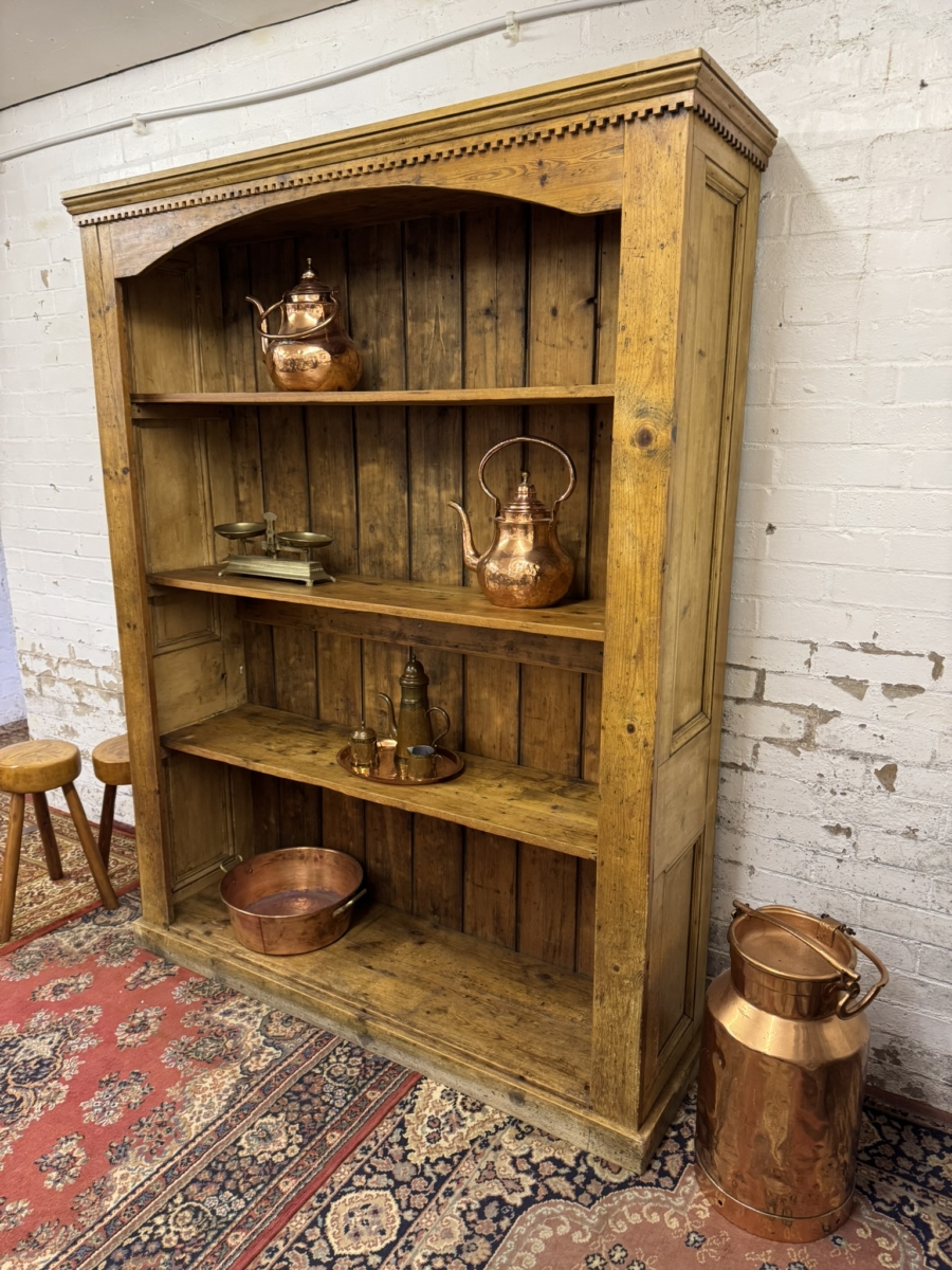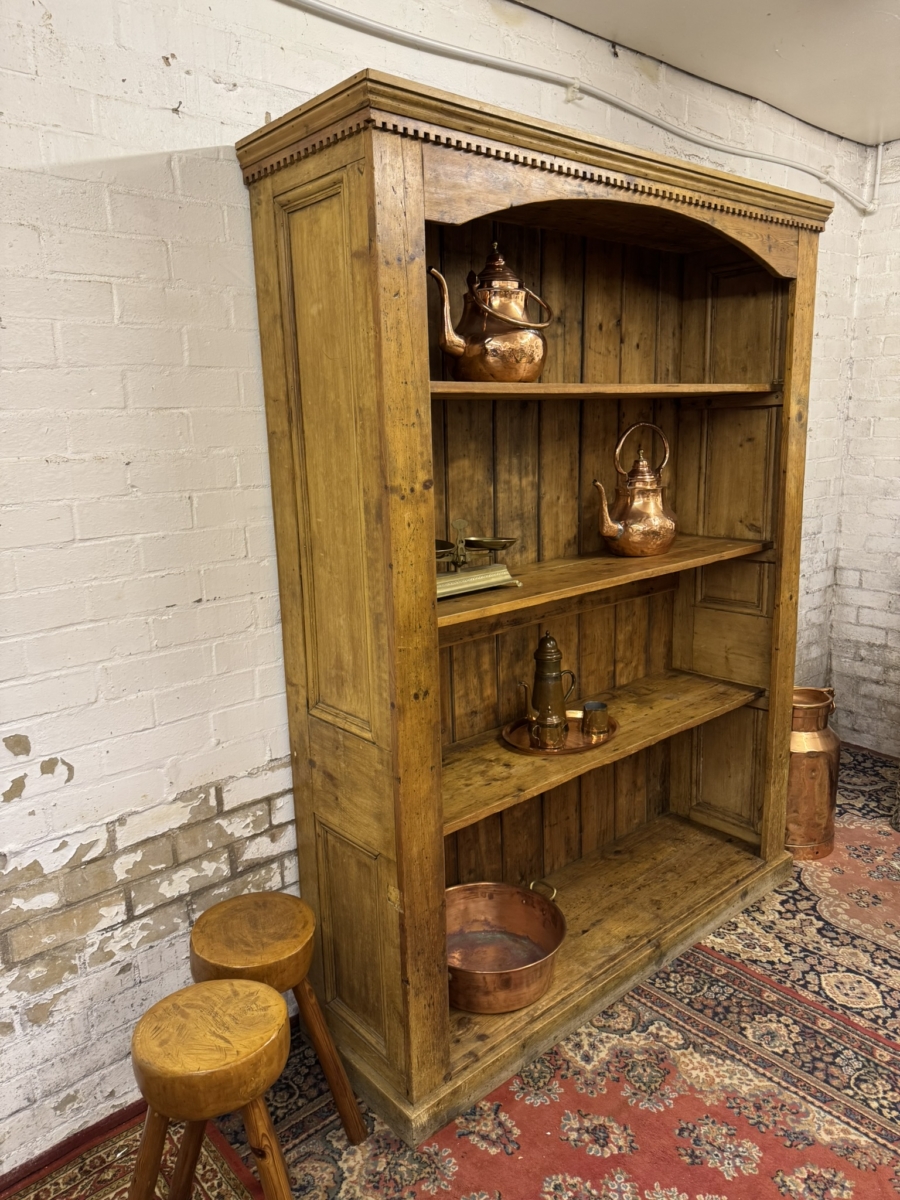 The over sailing top has dental carving to the front. Open fronted, three removable shelves with boarded back and base. Recessed panelled sides and standing on a platform plinth base.