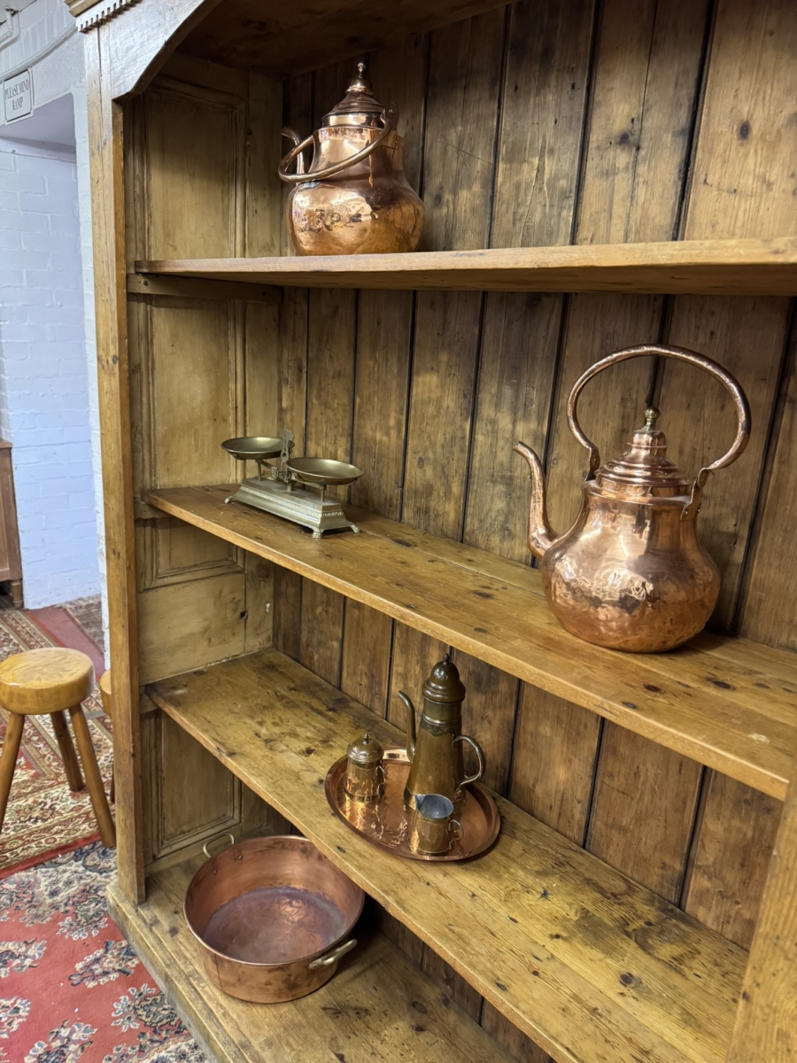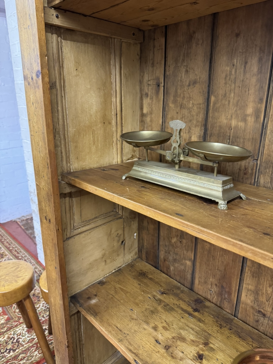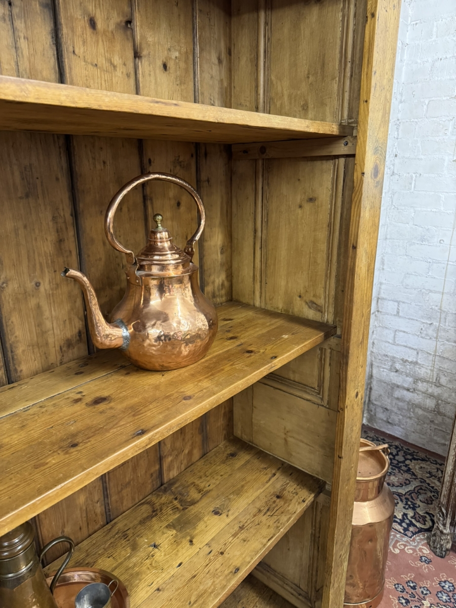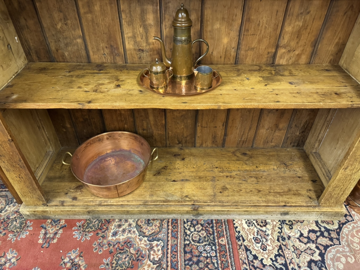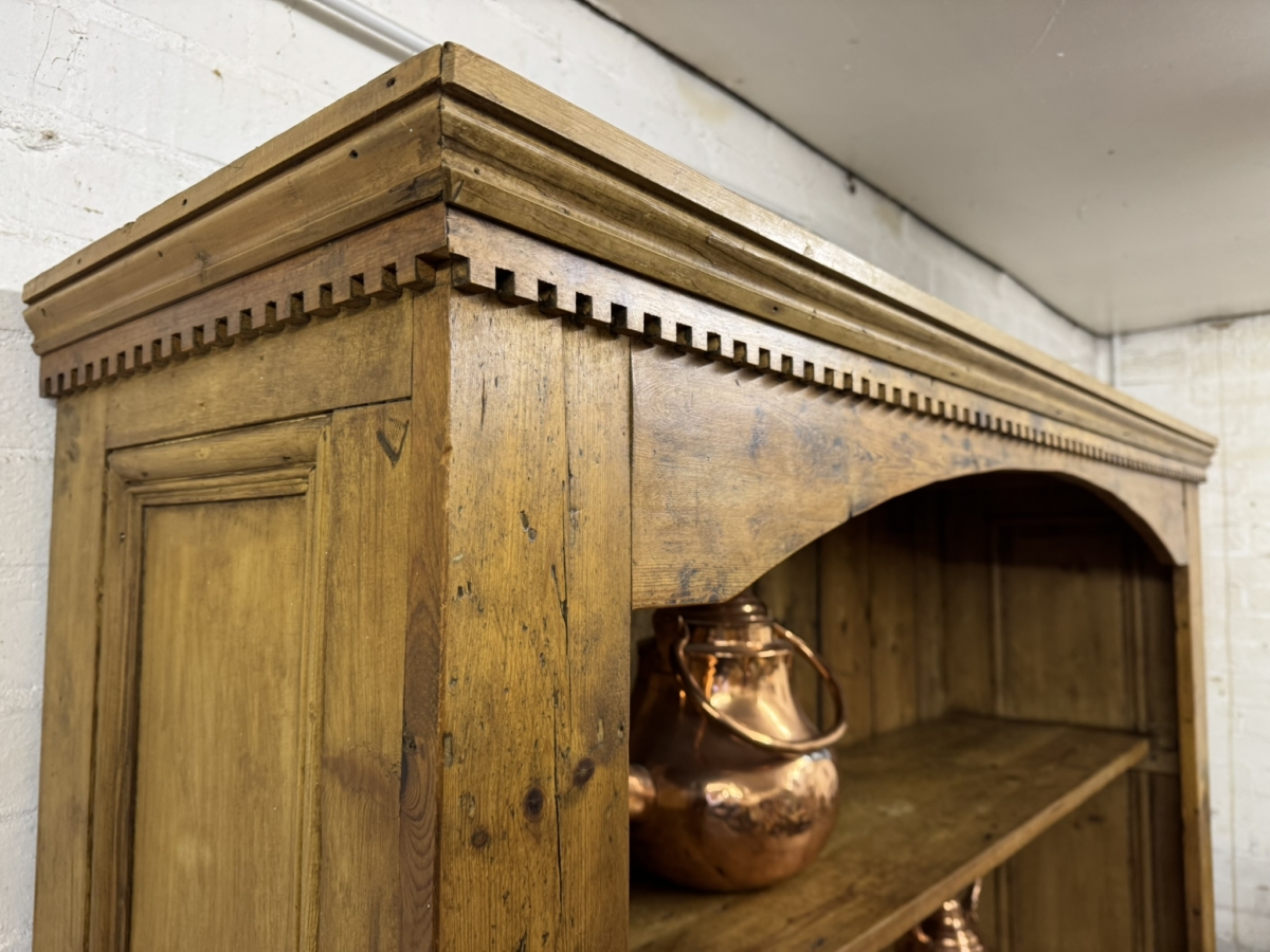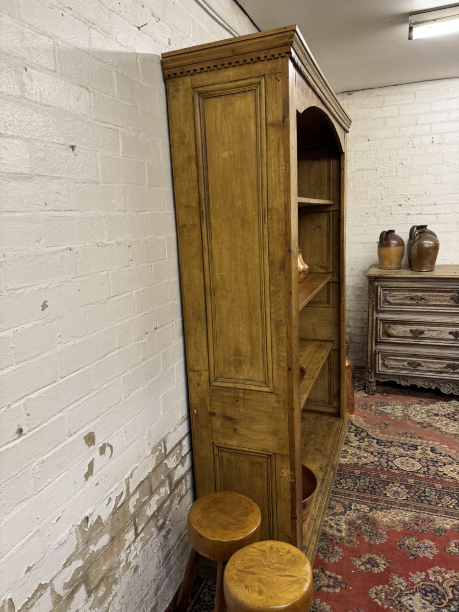 The over sailing top has dental carving to the front. Open fronted, three removable shelves with boarded back and base. Recessed panelled sides and standing on a platform plinth base.