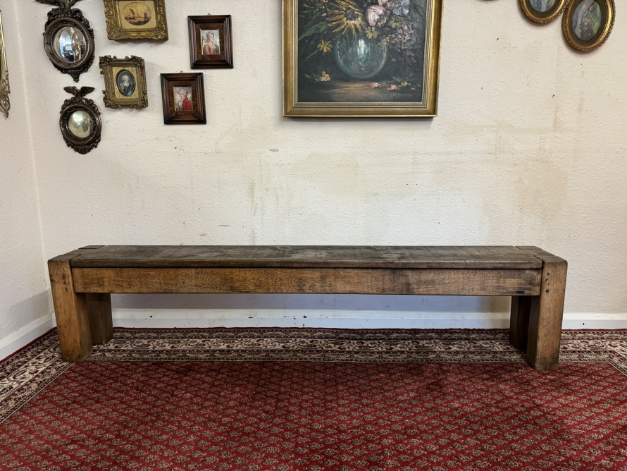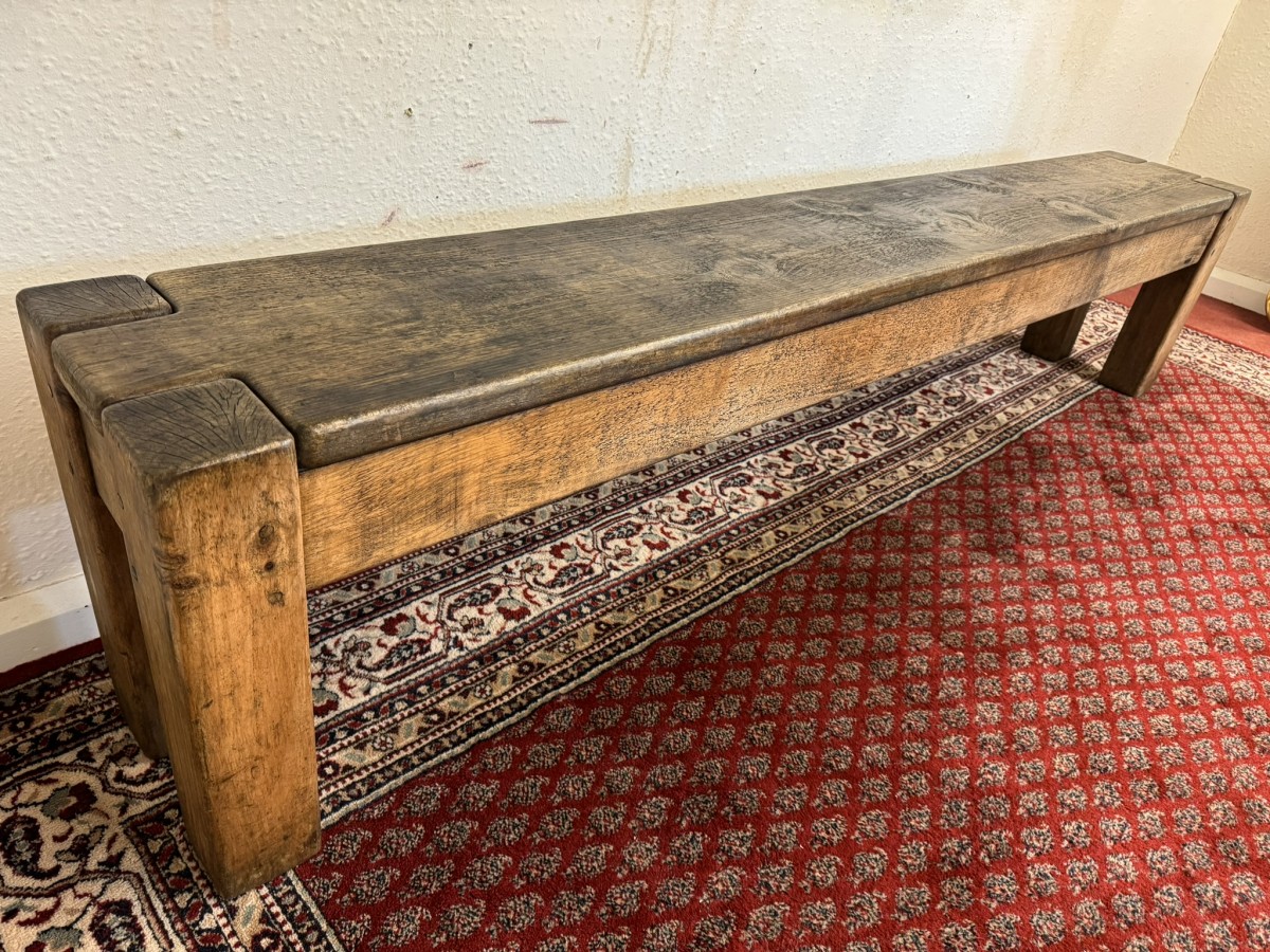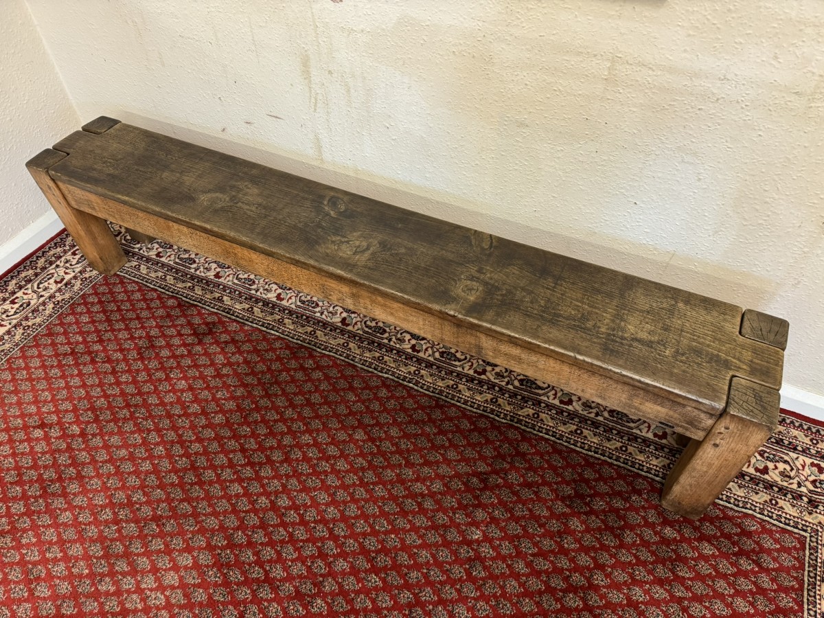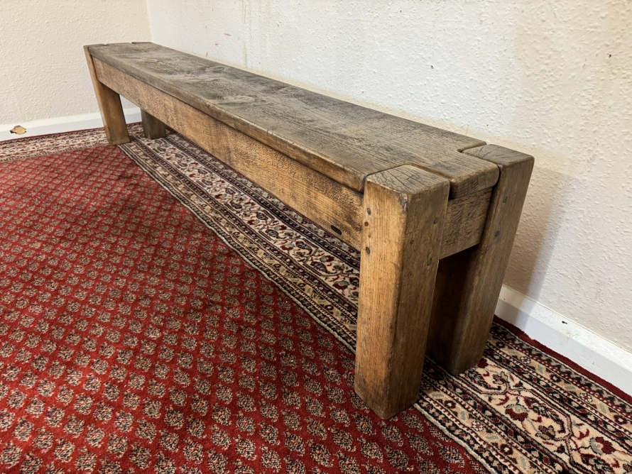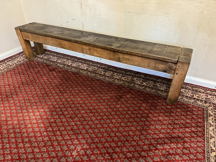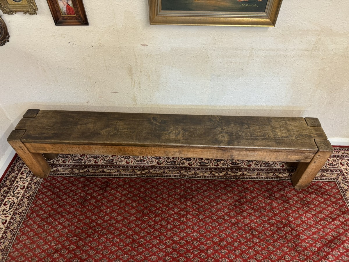 This long bench made in pine has a thick top and standing on four block feet. Perfect for an entryway, bootroom or pulling up to a table.