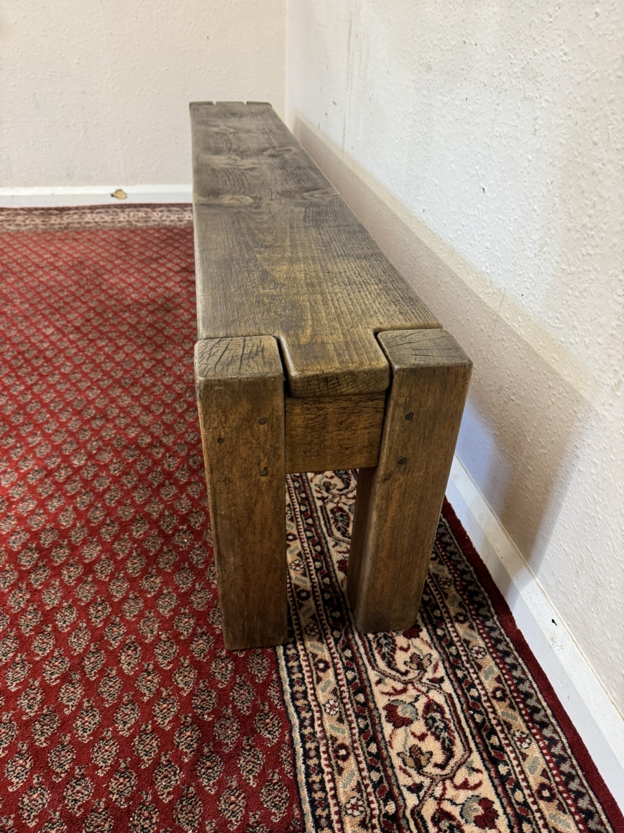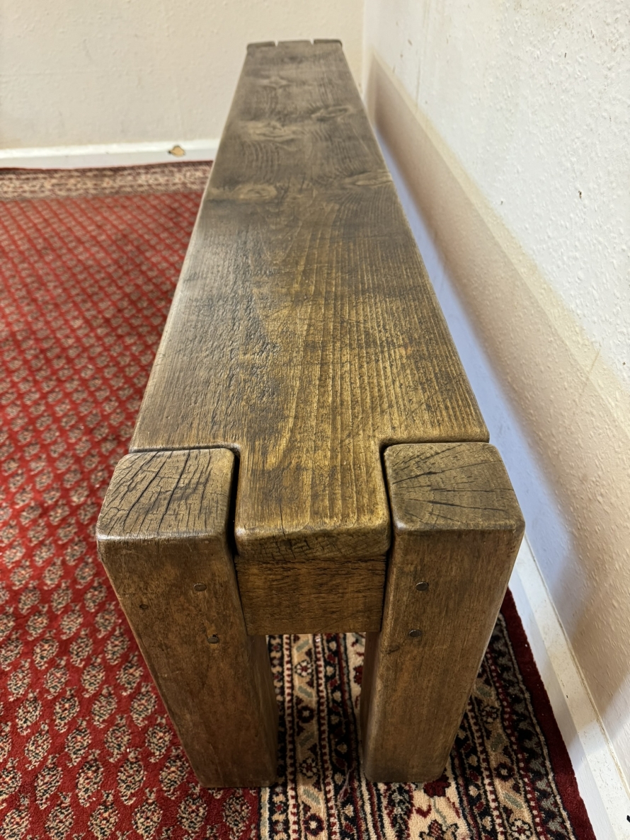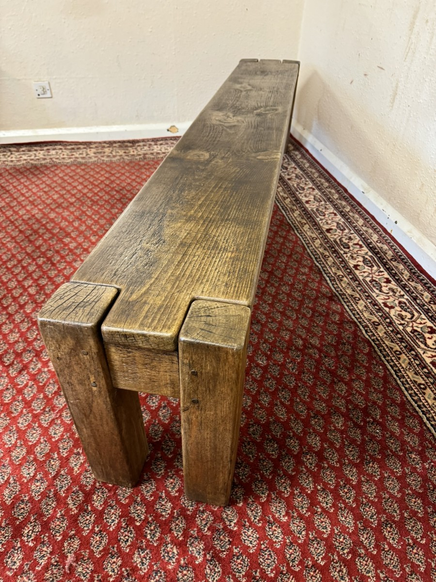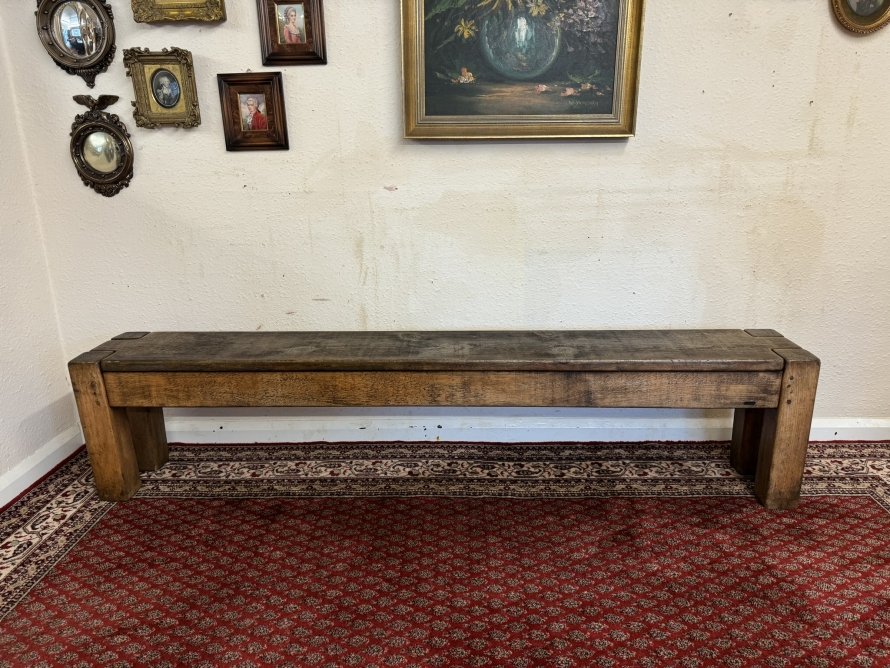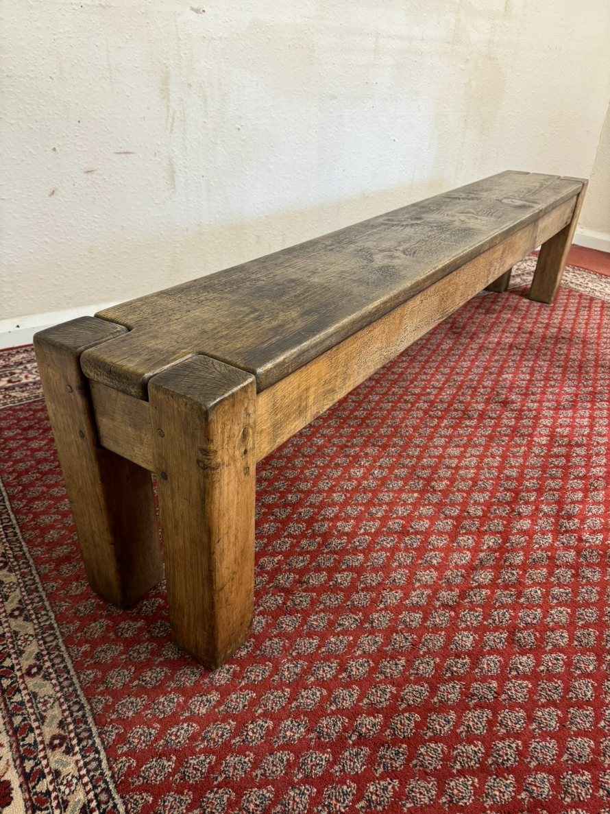 This long bench made in pine has a thick top and standing on four block feet. Perfect for an entryway, bootroom or pulling up to a table.