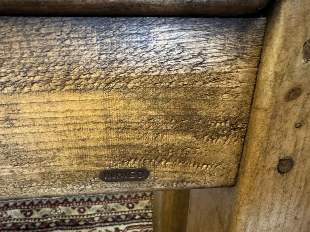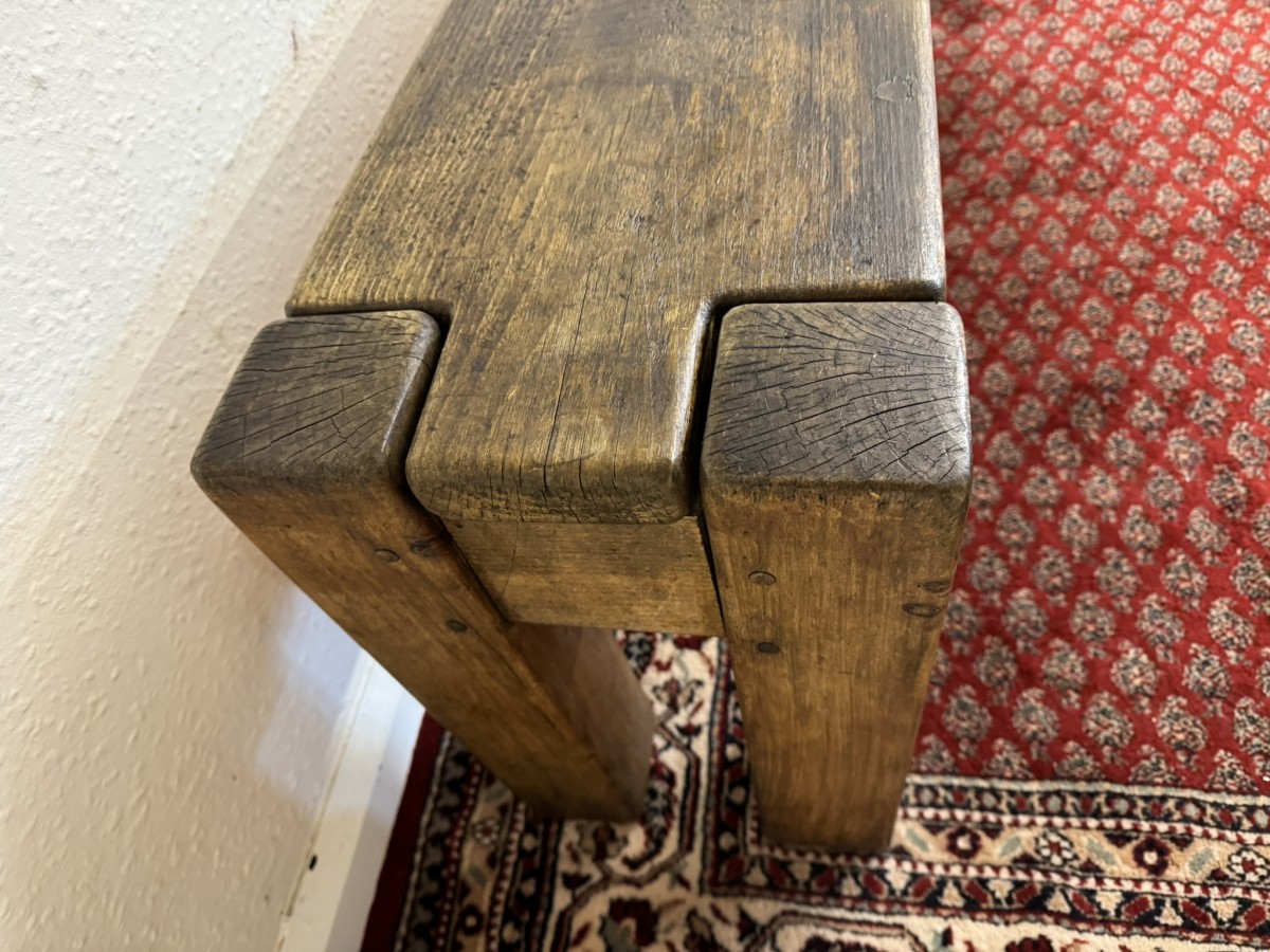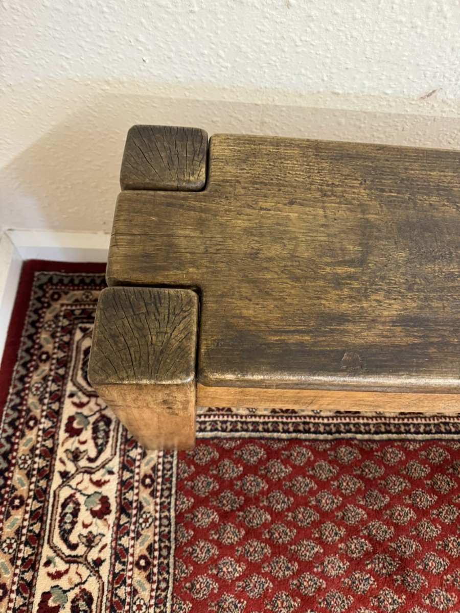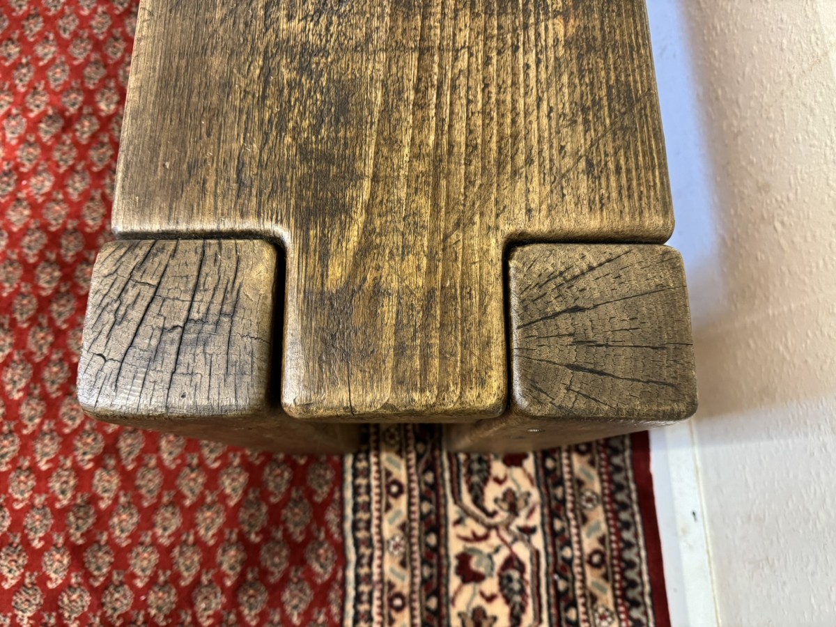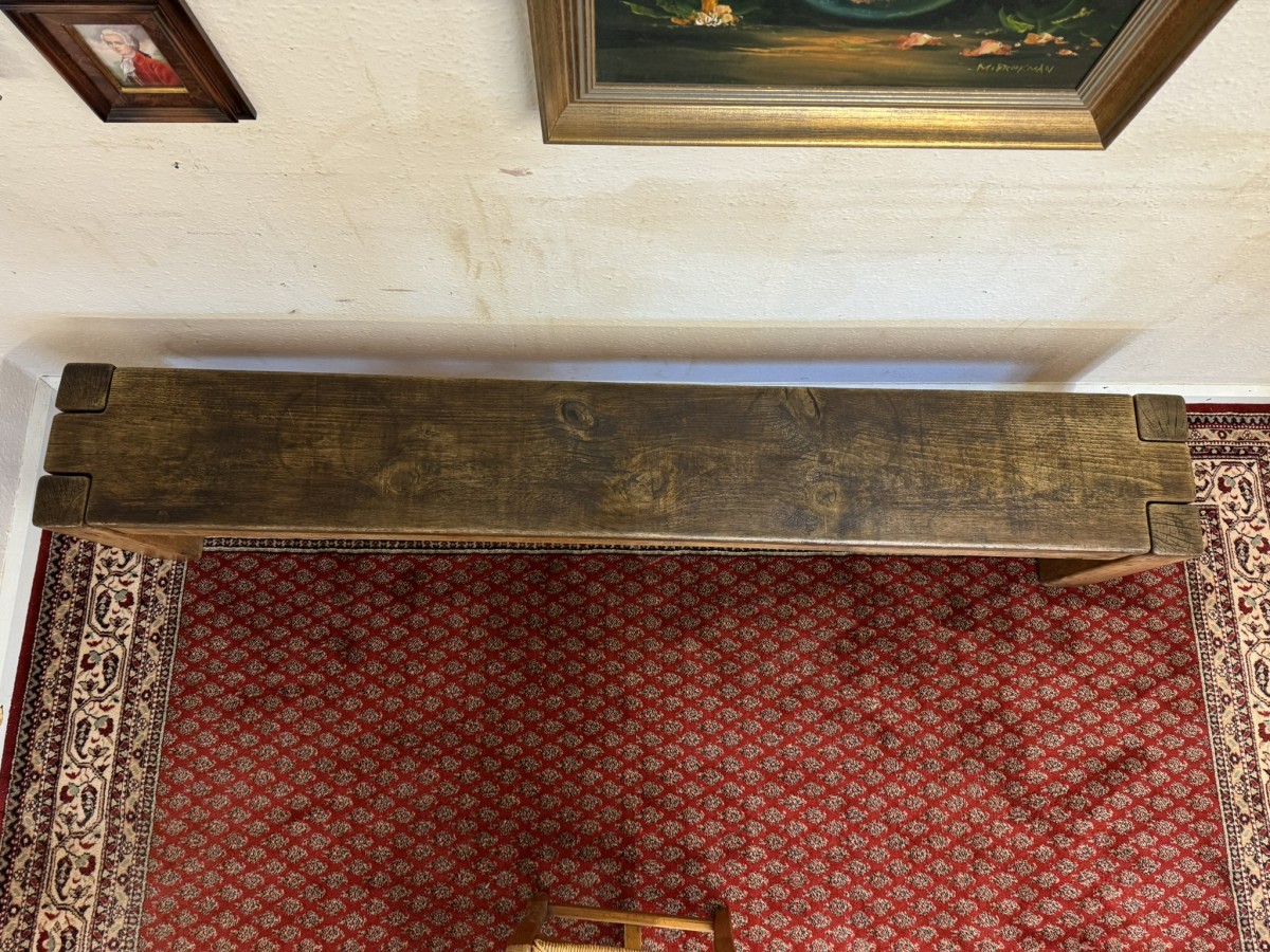 This long bench made in pine has a thick top and standing on four block feet. Perfect for an entryway, bootroom or pulling up to a table.