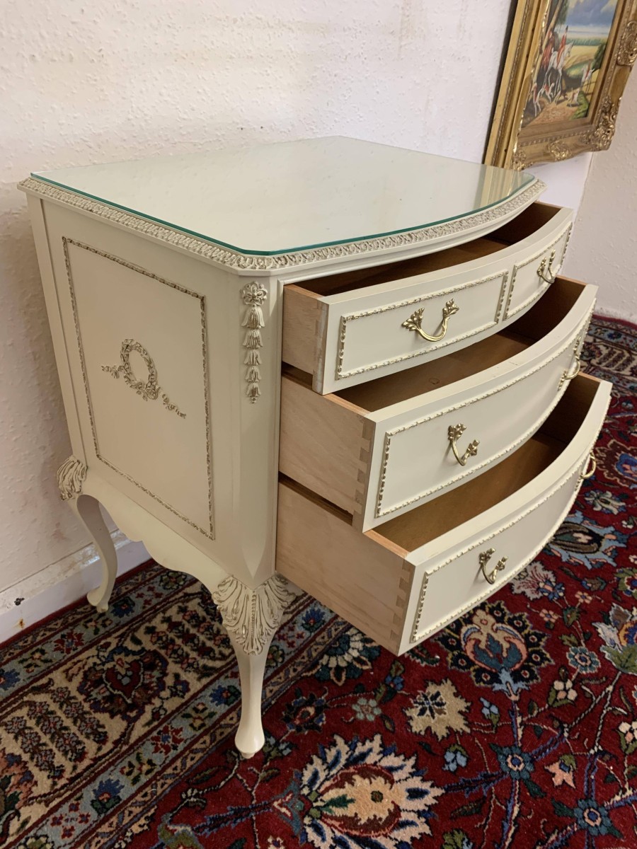 - Fabulous Louis Xv Style Cream And Gilt Bow Front Chest Of Three Drawers – Now Sold