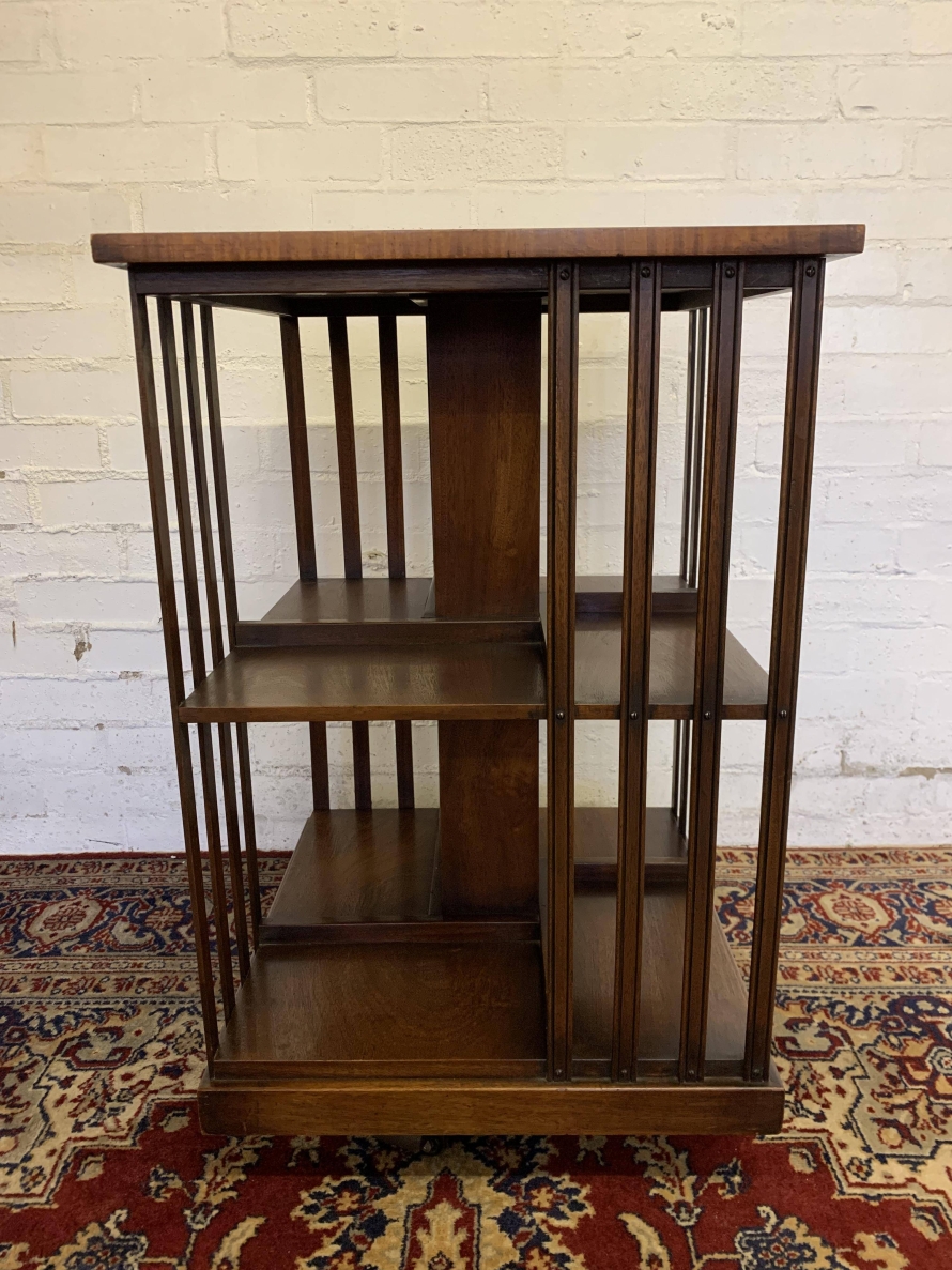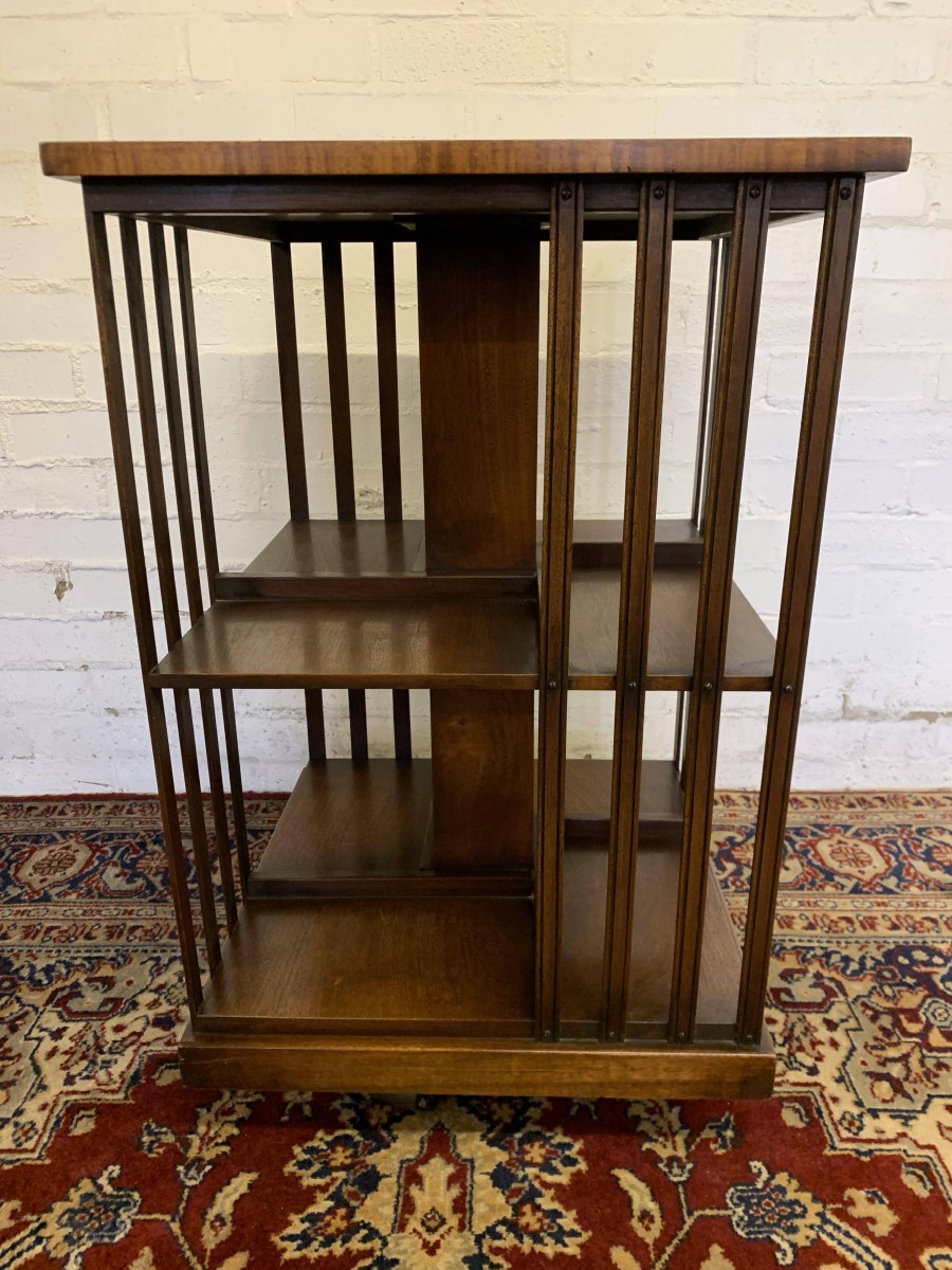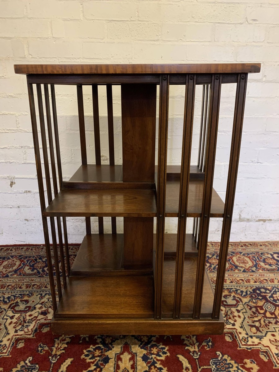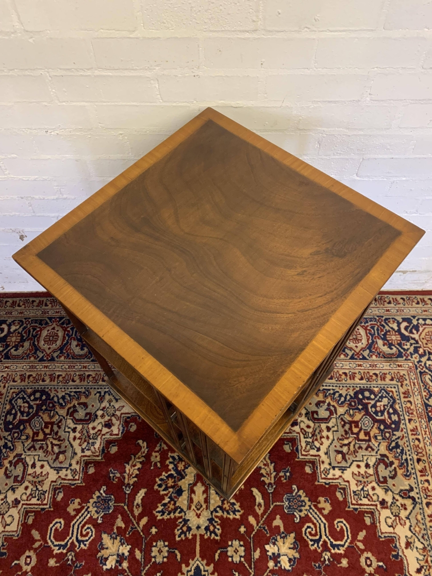 The crossbanded edged top sits above eight individual sections which house books. Sitting on four casters the bookcase revolves smoothly.
