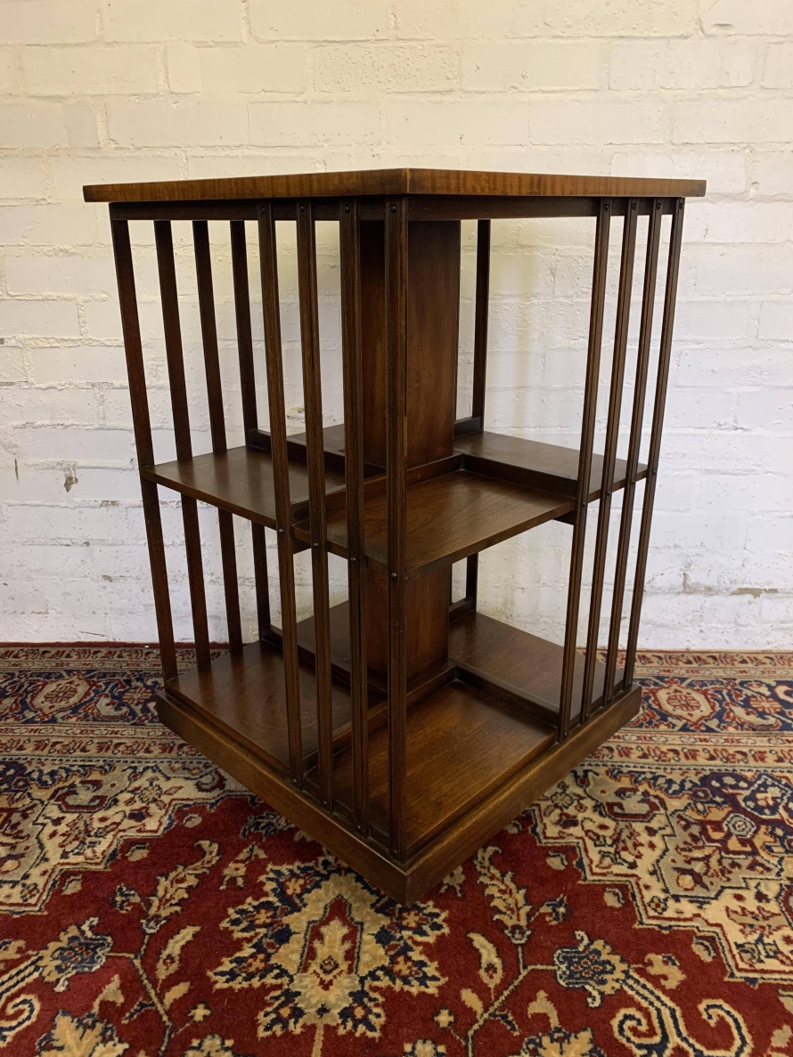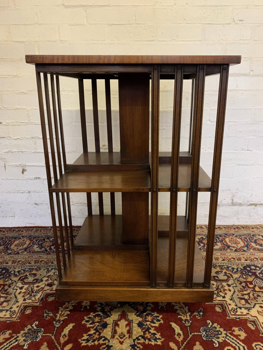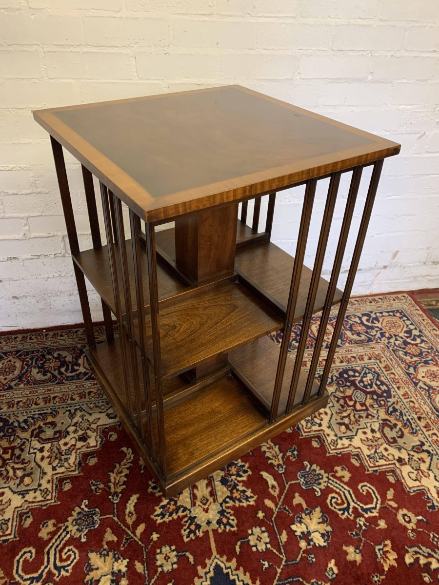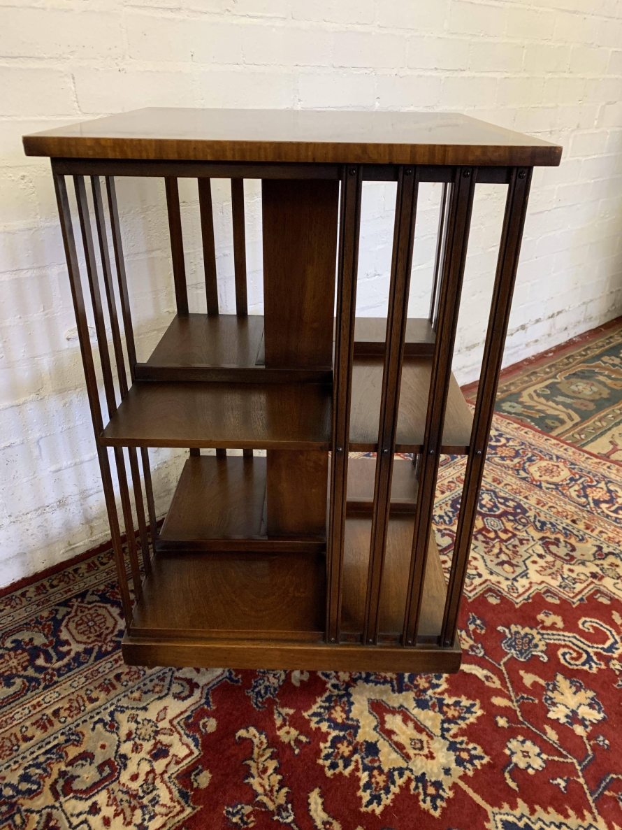 The crossbanded edged top sits above eight individual sections which house books. Sitting on four casters the bookcase revolves smoothly.